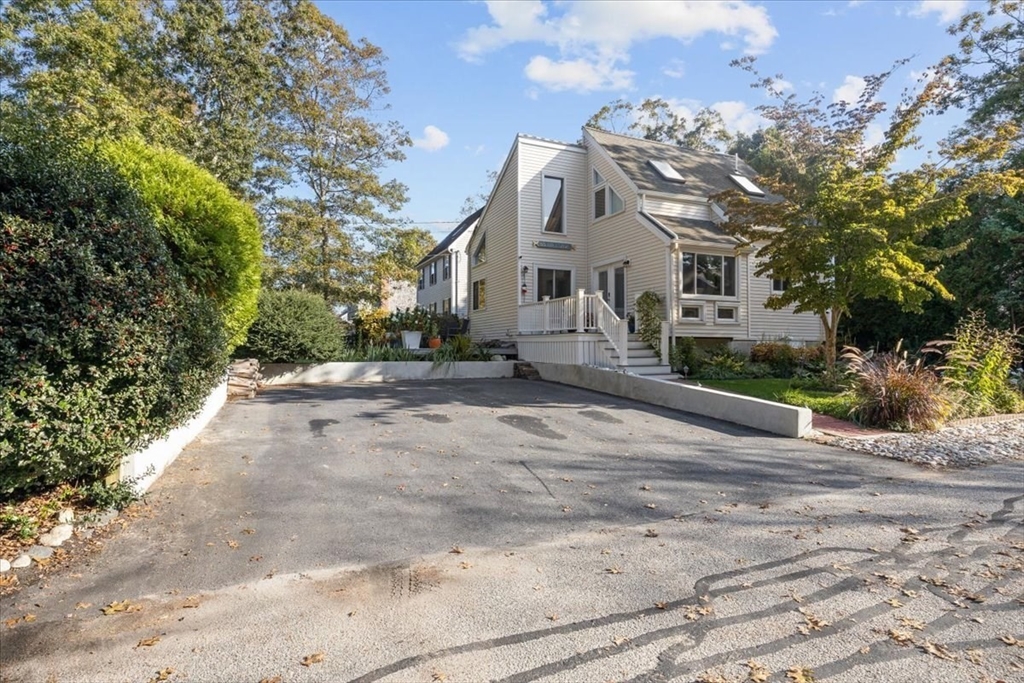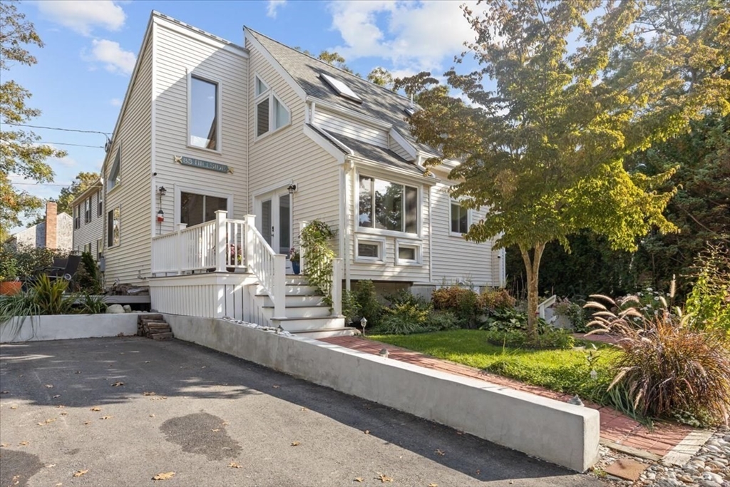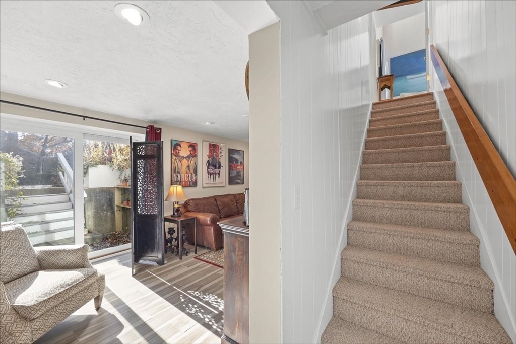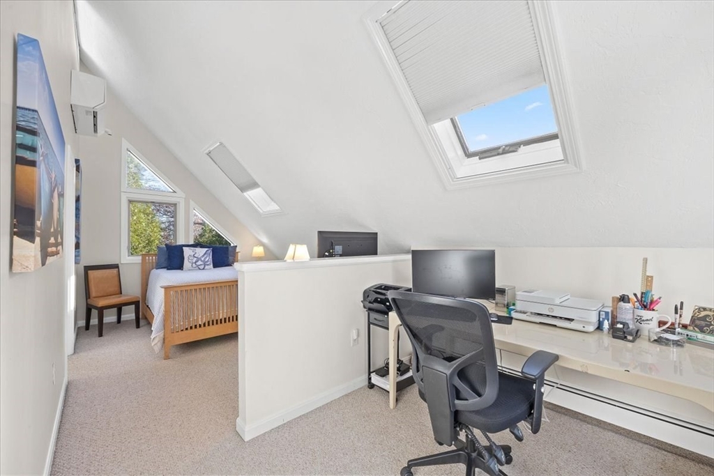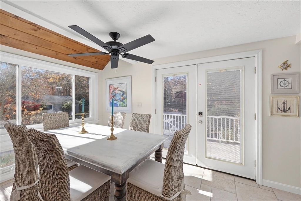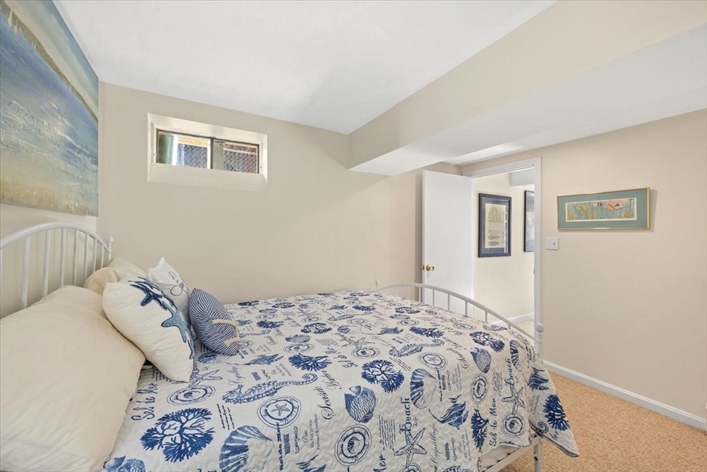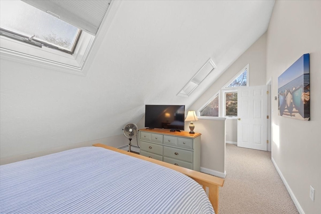 Nothing beats living near the beach! Welcome to Ocean Aire Estates! Feel like you are on vacation year round in this updated contemporary style home that has a cool vibe and is one block from the beach access. The main level is open and bright with cathedral ceilings, skylights and tons of natural light. The living room has a beautiful wood planked ceiling and a floor to ceiling brick fireplace. The kitchen is updated and has a spacious dining area with large sliding windows. A bedroom and full bathroom complete the first floor. The primary bedroom is on the second floor and has it's own bathroom and walk-in closet. The third bedroom is in the finished lower level which has a walk-out through a sliding glass door and added recessed lighting making the space perfect for a family room, media room, game room or office space. Recent updates include flooring, mini-splits for AC, both bathrooms, composite decks, and the house has been vinyl sided. This move-in ready home is a must see!
