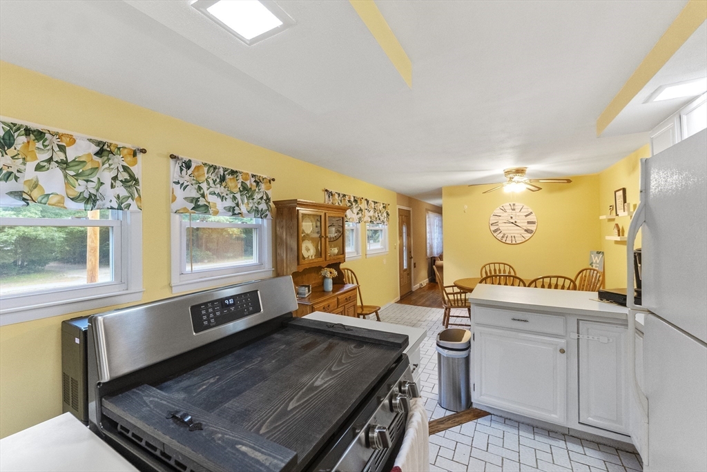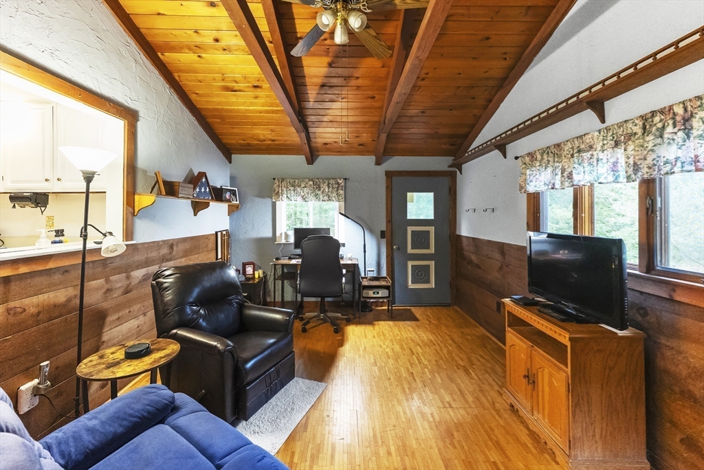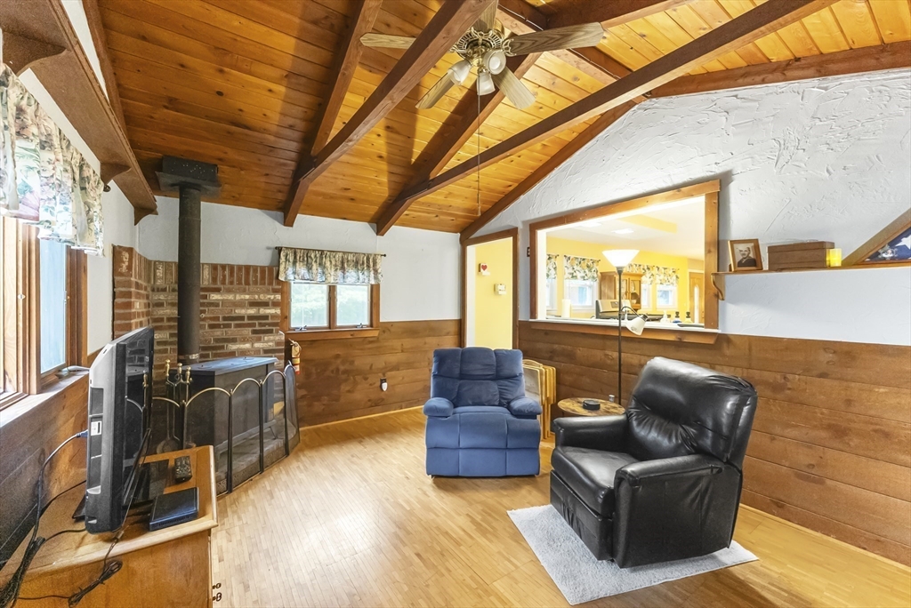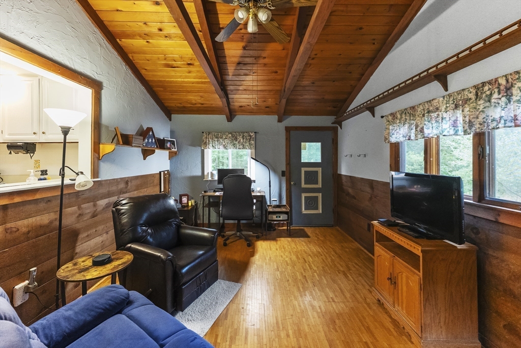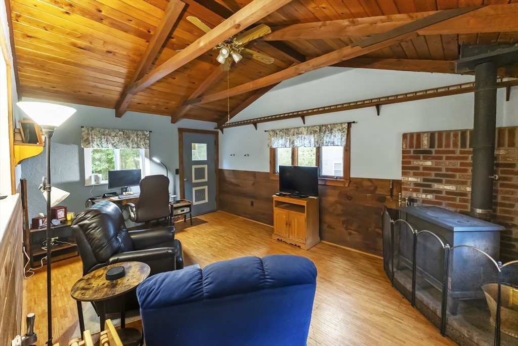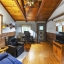 This well-appointed house features approximately 1,380 square feet of living space with three bedrooms and one bathroom. The home boasts a spacious layout with vaulted ceilings, creating an airy and open feel throughout the interior. The hardwood floors in the main living areas lend a warm and inviting ambiance, while the exposed beams add a touch of rustic charm. The generous windows allow for ample natural light to fill the spaces, enhancing the overall brightness and sense of openness. The home sits on a spacious lot, providing a peaceful setting for residents. The hardwood flooring extends throughout the main living areas, contributing to the cohesive aesthetic and durable, low-maintenance lifestyle.