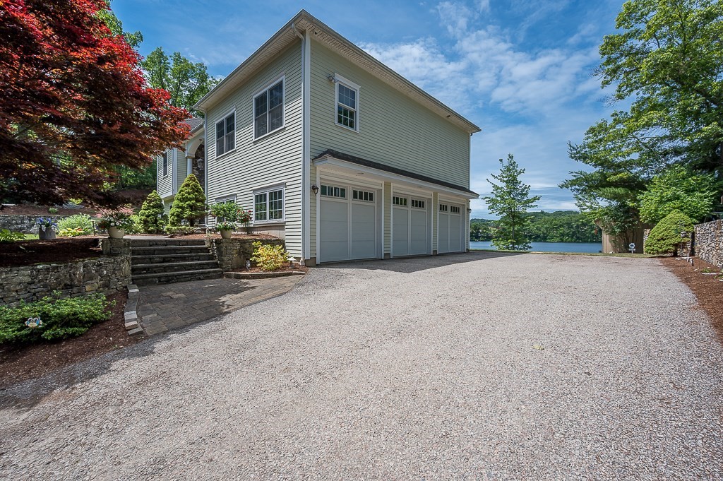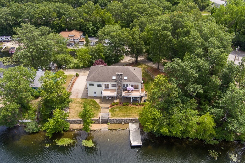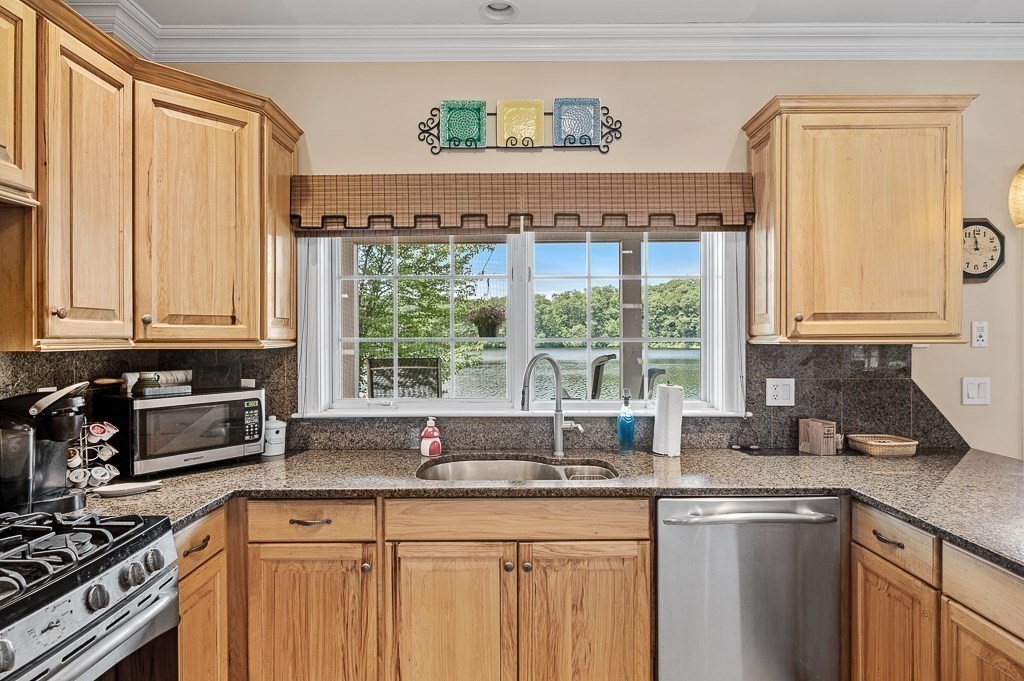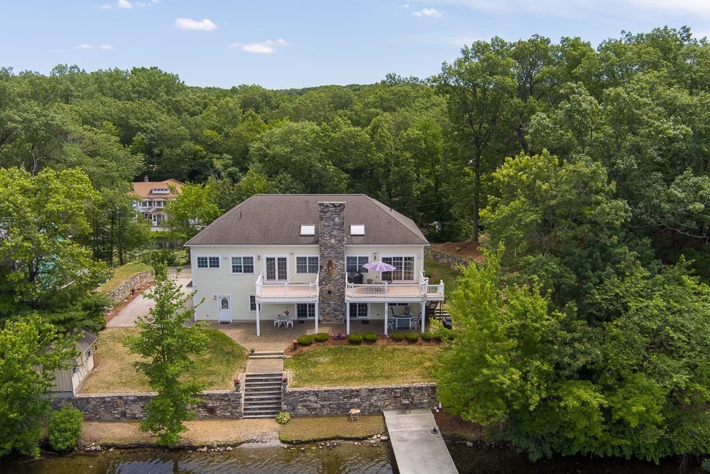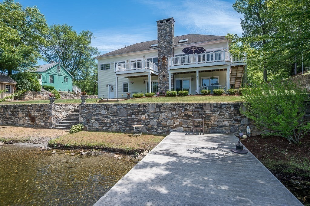 Stunning waterfront custom home on Lake Quinsigamond w/ gorgeous rock walls. Enjoy expansive views from several sprawling decks & the many windows facing the water. 3-car garage. Outdoor shed. Thoughtfully designed w/ 2 kitchens, bedrooms, & full bathrooms, both levels. The main level boasts a large master bedroom, bathroom suite, attached office, and a walkout deck. The large kitchen, opens to a dining area with continued views and a walkout deck. Custom built cabinets w/ high quality features, Tiffany lights, crown molding. Brand new washing machine, heating and AC units. The lower level is an invitation to a large mud room. Entertain w/ kitchen attached to the living area, and another walkout to the covered patio that faces the water. With a beautiful backyard, and private water access, includes a stationary dock. Imagine kids swimming in the summer, having a boat right in your backyard, fishing off of the dock, this elegant estate epitomizes Lake Life! Seller related to agent.