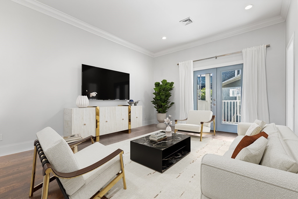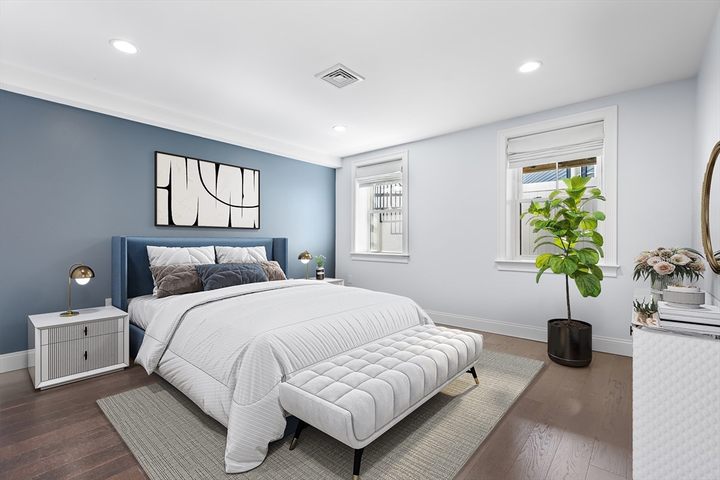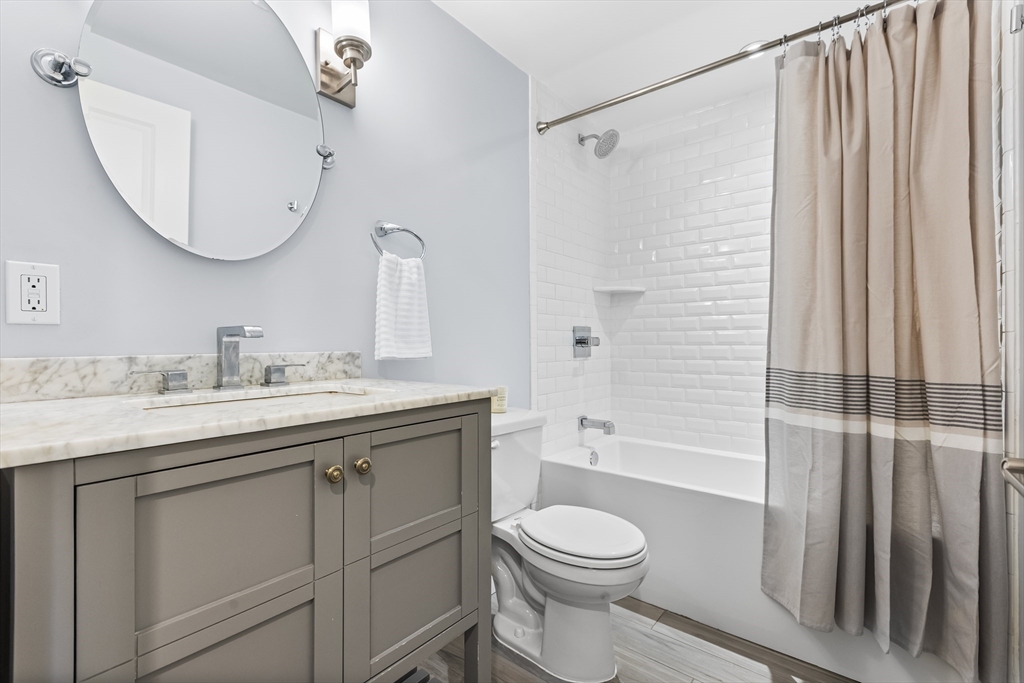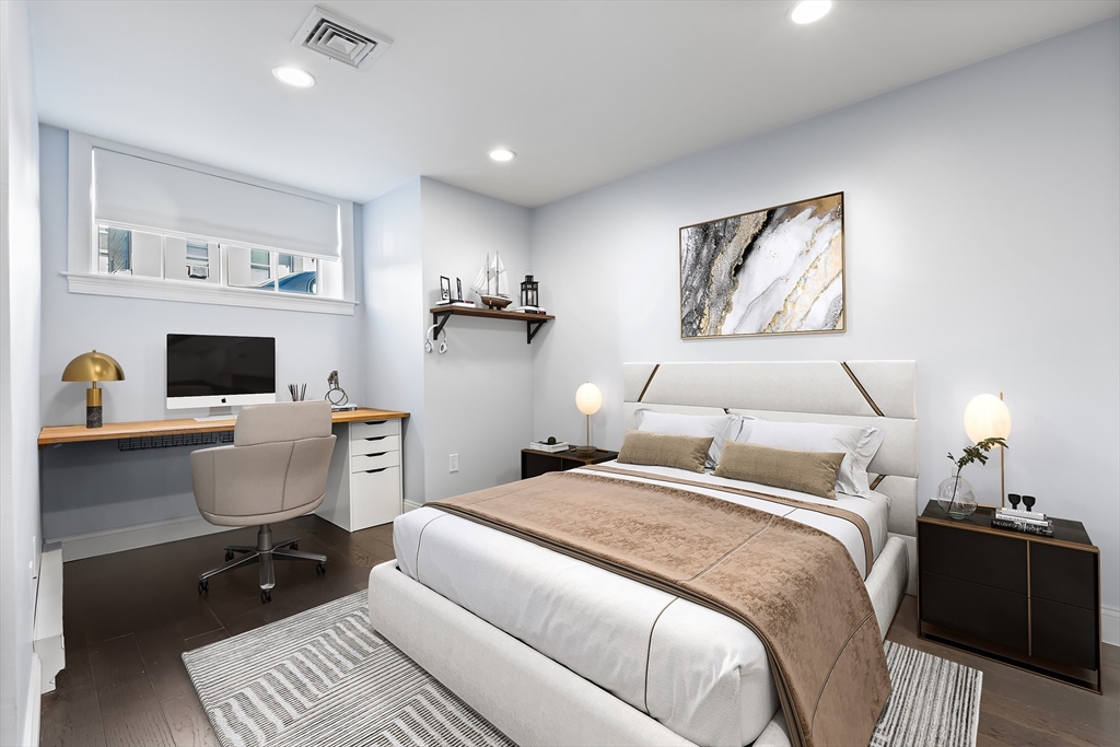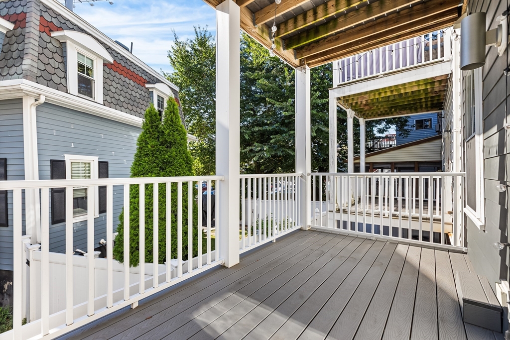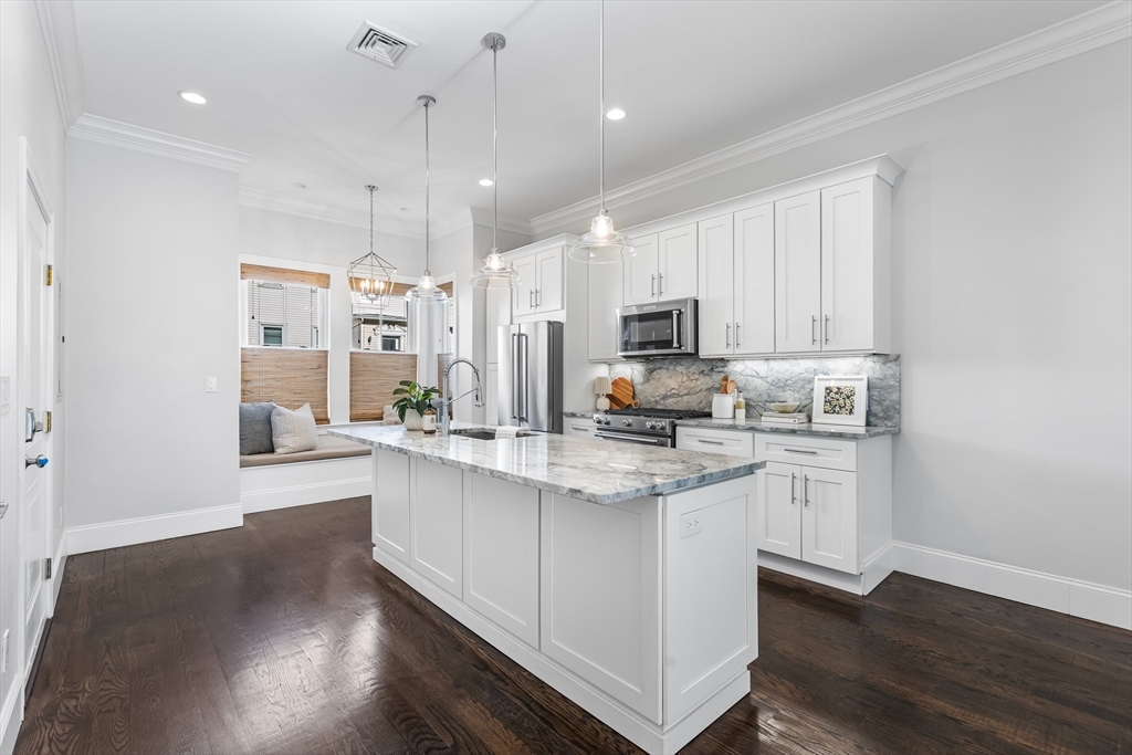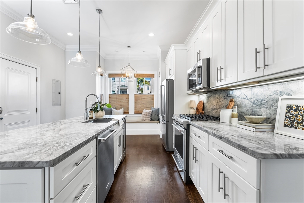 Welcome to this stunning 2 bed, 2 bath condo with a spacious layout and high-end finishes. The chef’s kitchen boasts quartzite counters, stainless steel appliances, a wine fridge, and an oversized island perfect for entertaining. Hardwood floors and high ceilings flow into a bright living room, while a custom breakfast nook framed by bay windows offers the ideal spot for morning coffee. The lower level features a king-sized primary suite, second bedroom, full bath, laundry, and generous storage. Enjoy private outdoor living with both a deck and patio, plus an additional storage area. Ideally located near Assembly Row, Sullivan Square T stop, and major highways—this home is a must-see!