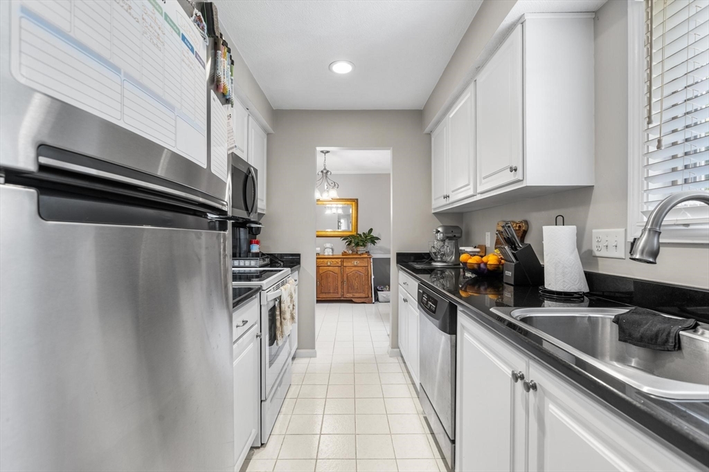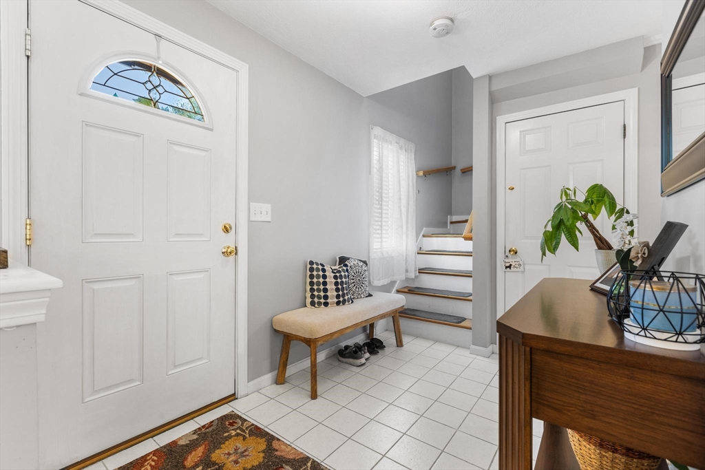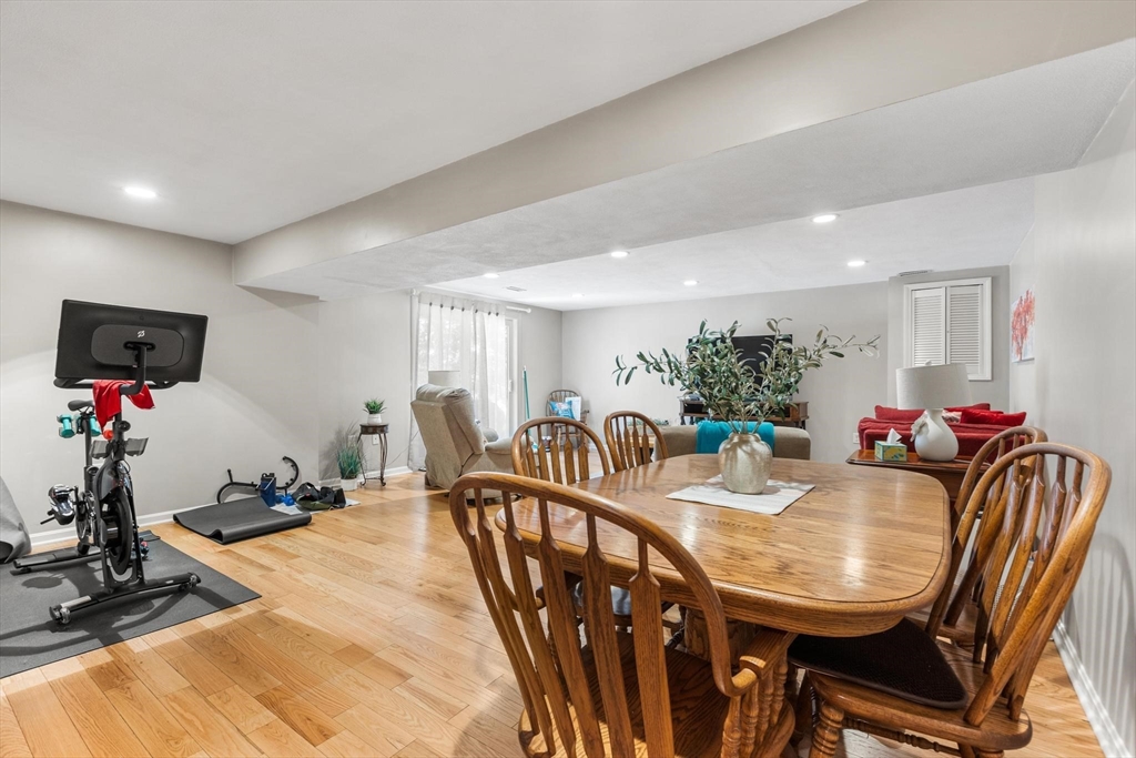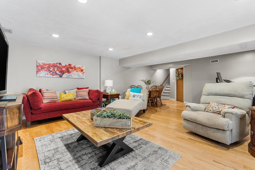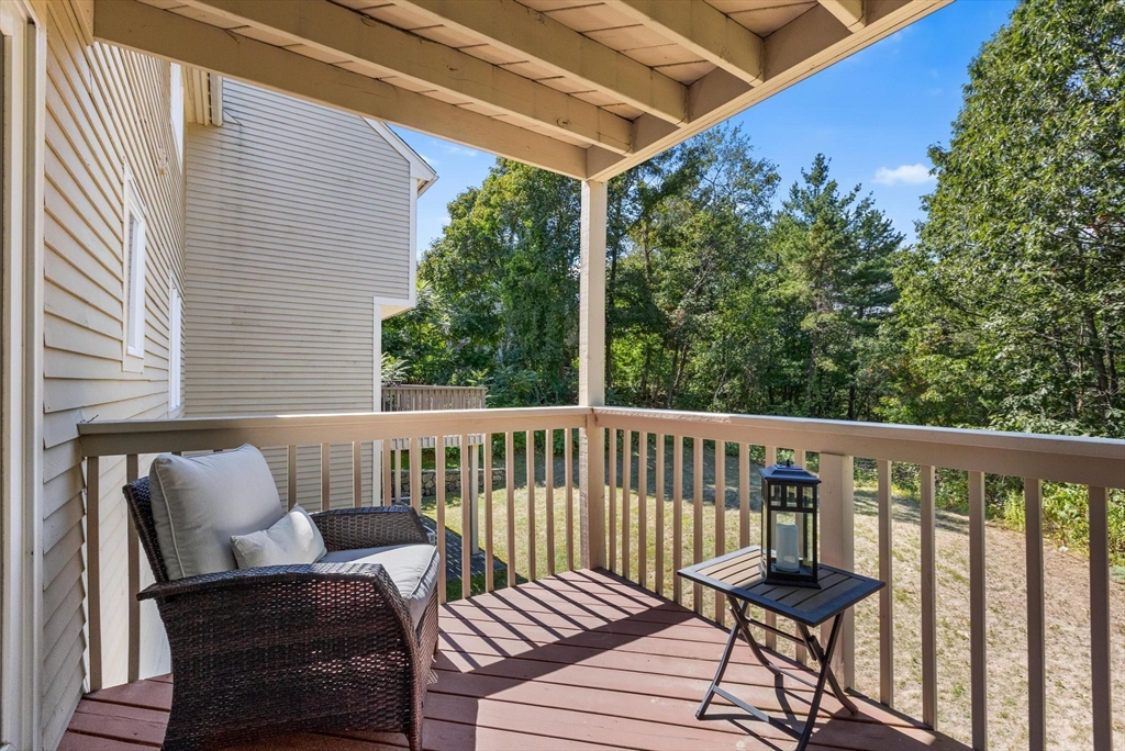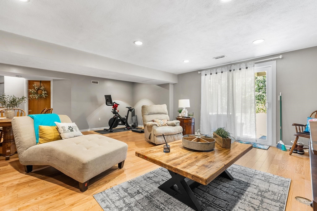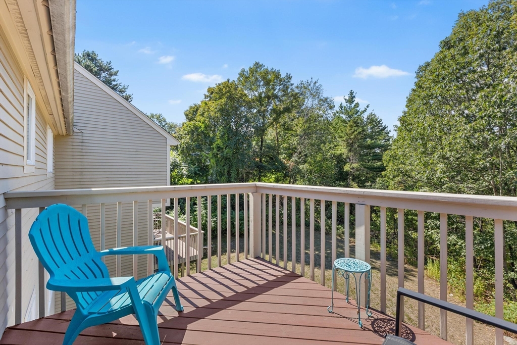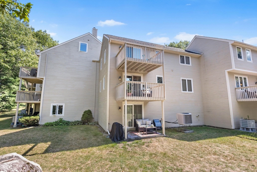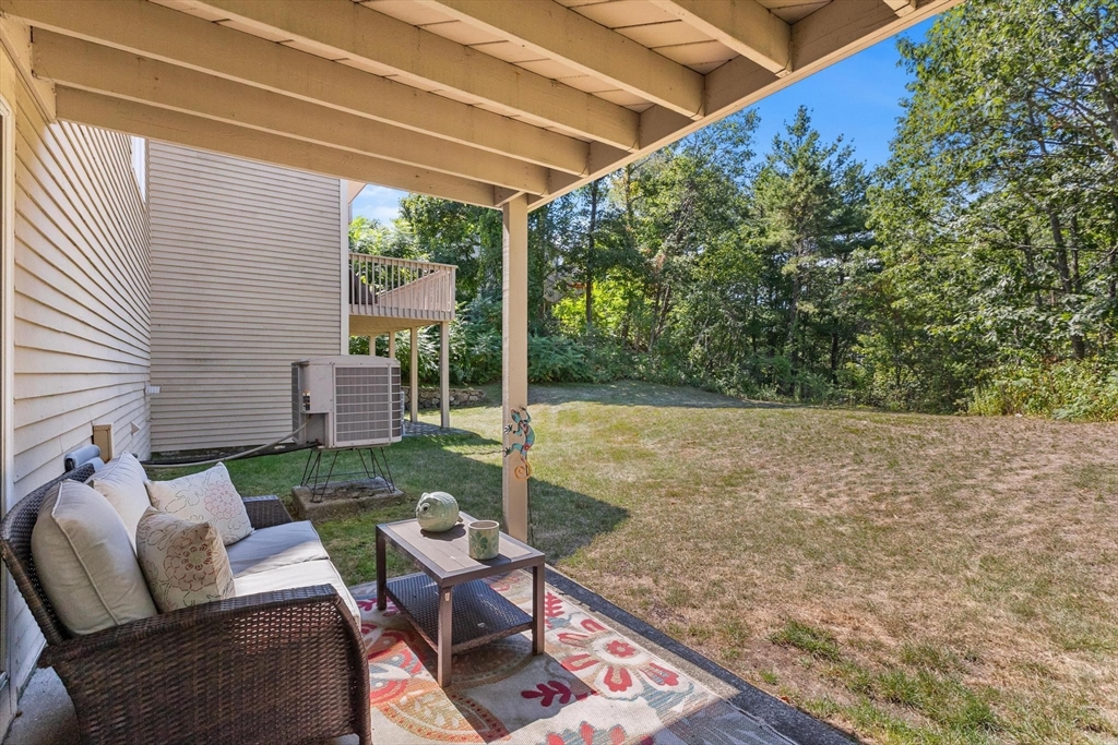 Welcome to this beautiful townhouse! Enjoy maintenance free living in this well-kept townhouse with three finished levels. The main floor features an open-concept living/dining room with sliders leading to a deck that overlooks the landscaped grounds. The updated kitchen offers granite countertops, stainless steel appliances, a cozy breakfast nook, pantry, and a half bath. Upstairs you'll find the primary bedroom with double closets and access to its own private deck. A full tiled bath (accessible from both the bedroom and the hallway), a laundry room and a second bedroom with attic access complete this level. The spacious finished basement works perfectly as a playroom, gym, or extra living space with added storage and walk-out access to a private covered patio. Community amenities include central A/C, in-ground pool, tennis courts, a clubhouse, and two assigned parking spots. Conveniently located near major highways with easy access to Boston.