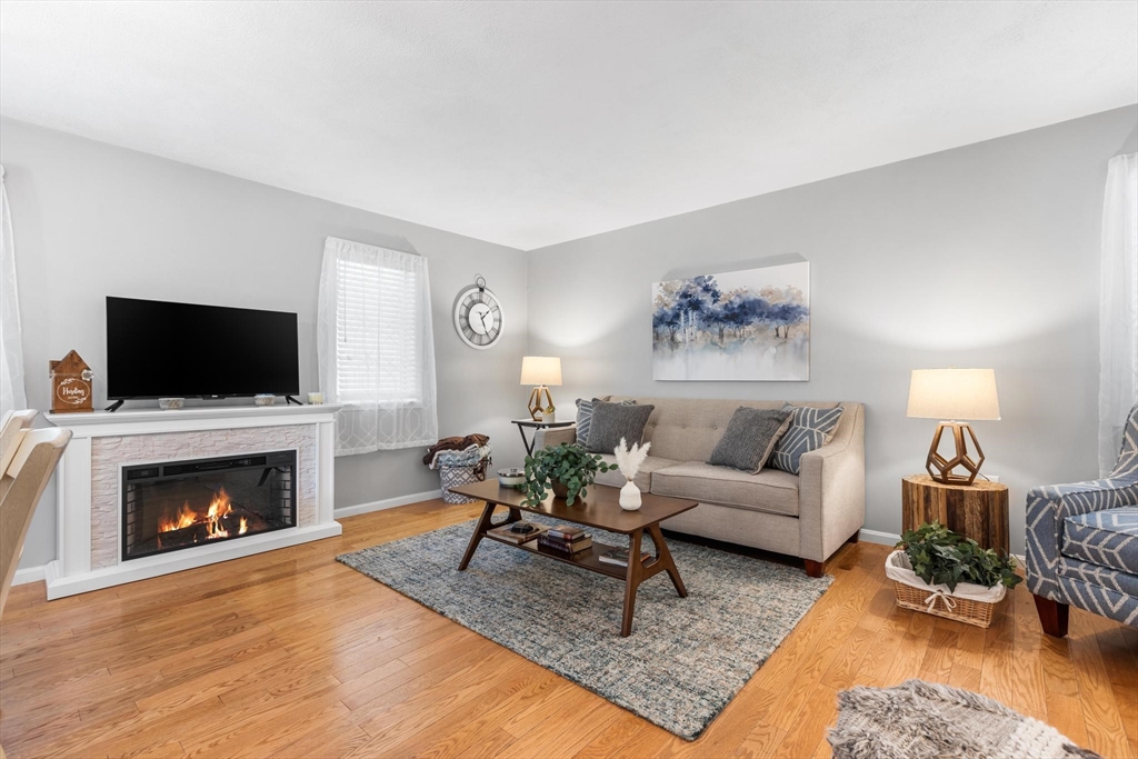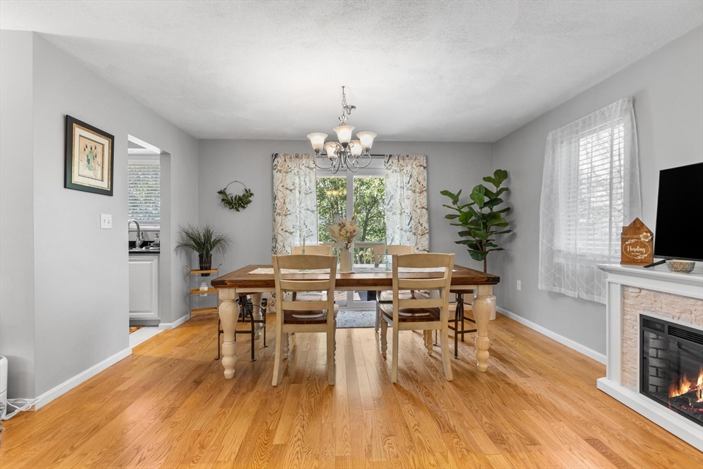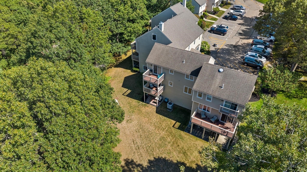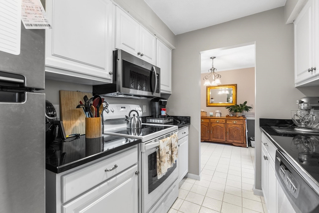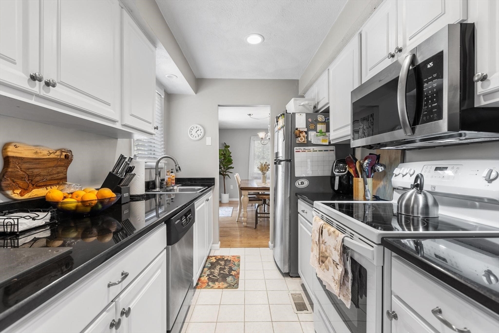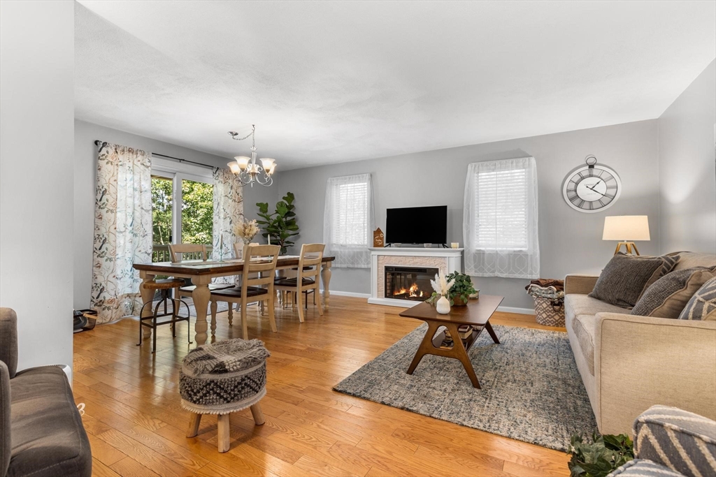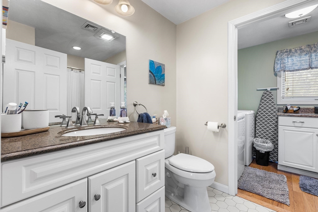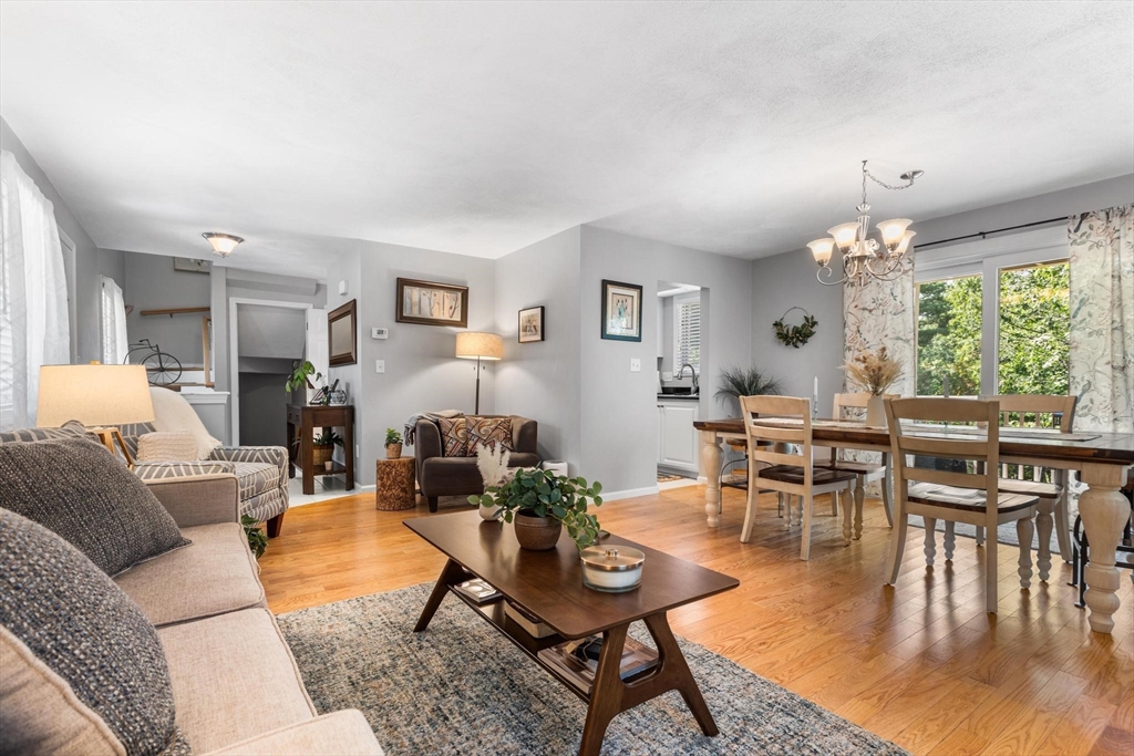 Welcome to this beautiful townhouse! Enjoy maintenance free living in this well-kept townhouse with three finished levels. The main floor features an open-concept living/dining room with sliders leading to a deck that overlooks the landscaped grounds. The updated kitchen offers granite countertops, stainless steel appliances, a cozy breakfast nook, pantry, and a half bath. Upstairs you'll find the primary bedroom with double closets and access to its own private deck. A full tiled bath (accessible from both the bedroom and the hallway), a laundry room and a second bedroom with attic access complete this level. The spacious finished basement works perfectly as a playroom, gym, or extra living space with added storage and walk-out access to a private covered patio. Community amenities include central A/C, in-ground pool, tennis courts, a clubhouse, and two assigned parking spots. Conveniently located near major highways with easy access to Boston.