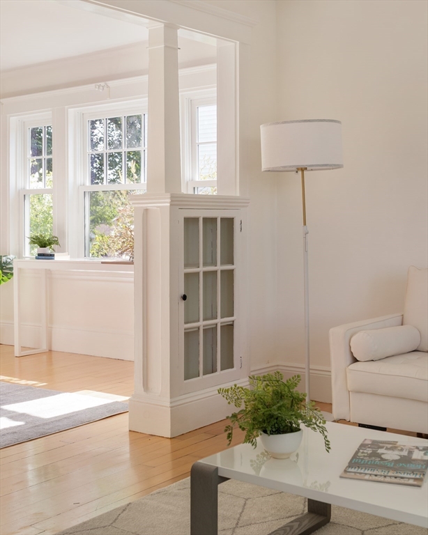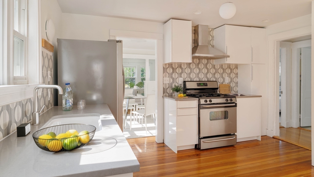 Welcome this delightful two-plus bedroom, one-bath condominium in the friendly East Watertown Hosmer neighborhood. This home retains old-world charm while modernized for today's living. Transition from the foyer to the sunny living room, opening to a dining room with a fireplace and built-ins. The updated kitchen features modern tile, cabinetry and countertops with stainless appliances. The primary bedroom leads to an office and access to a three-season porch, while the spacious second bedroom has a deep closet. The updated tiled bathroom features a newer vanity. This bright and airy home has gleaming wood floors and newer windows throughout, shared laundry facilities in the basement, ample closets and private basement storage. The shared yard and garage, with designated parking, along with a newer asphalt driveway, add to the home's value. Situated near Hosmer playground, with easy highway access and convenient to greenway bike path and vibrant shops and restaurants of Arsenal Yards.