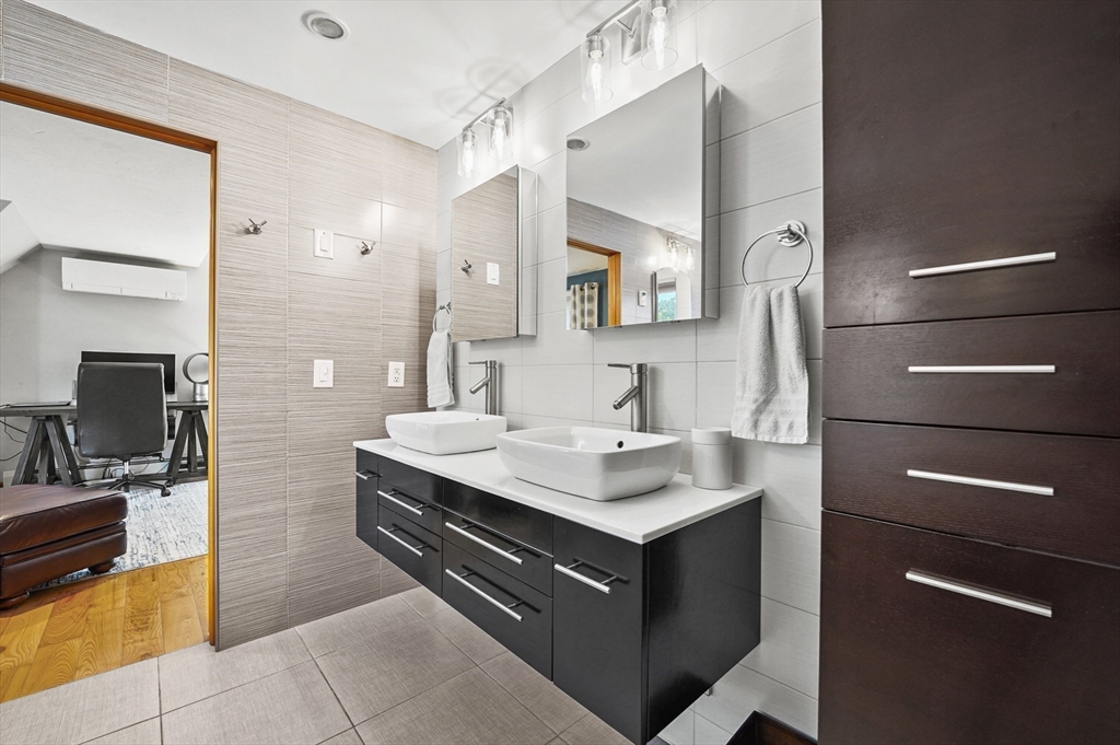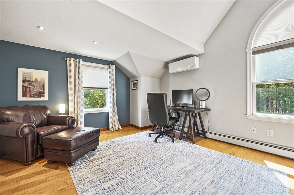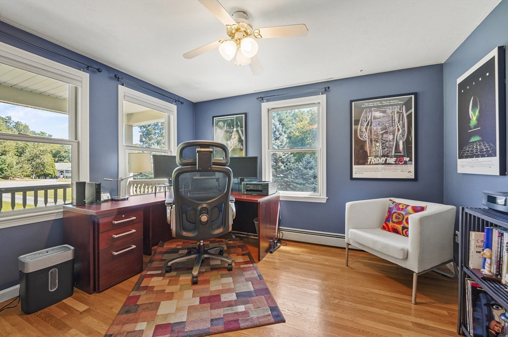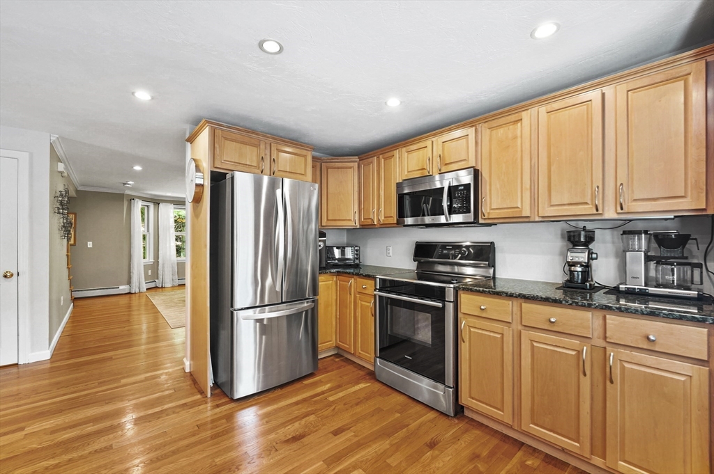 Welcome home to this beautiful 3-bed, 2.5-bath Colonial in Dudley! Perfectly situated at the end of a cul-de-sac on just under an acre, this property offers the privacy you’ve been searching for. A charming farmer’s porch sets the tone as you enter inside, where you're greeted by hardwood flrs throughout. The kitchen features abundant cabinet space & modern SS appliances, flowing seamlessly into the dining area & cozy living room w/ a wood-burning fireplace & access to the back deck. A formal dining room, dedicated home office, and 1/2 bath complete the 1st flr. Upstairs, retreat to the expansive primary suite w/ cathedral ceilings, a large walk-in closet, & a spa-like en-suite bathroom w/ dual vanities and high-end finishes. 2 additional bedroom's & a full bath are just down the hall. The finished basement offers a bonus room for even more flexible living space. Enjoy the back deck w/ views of the backyard plus the convenience of a 2-car garage! This home truly checks all the boxes!