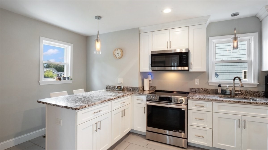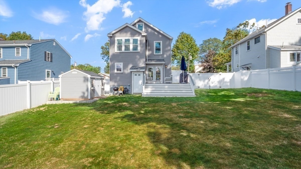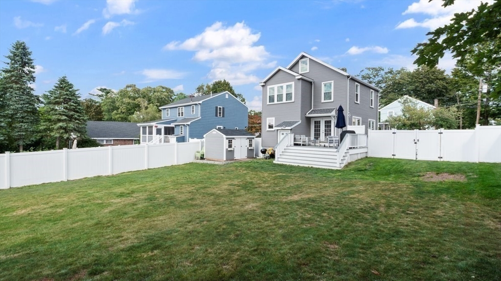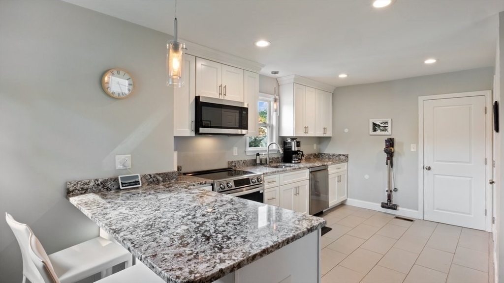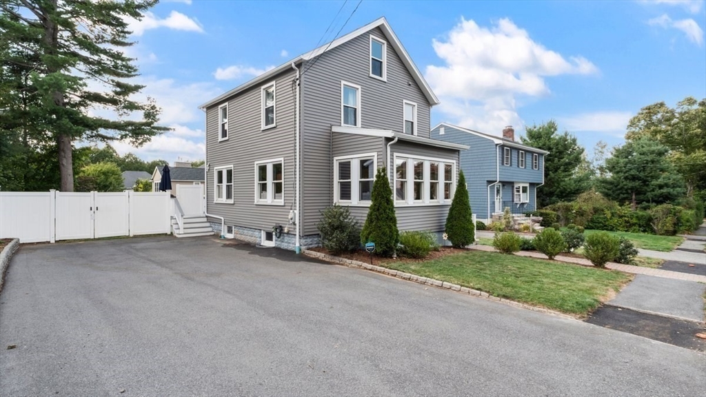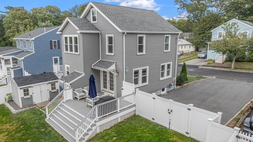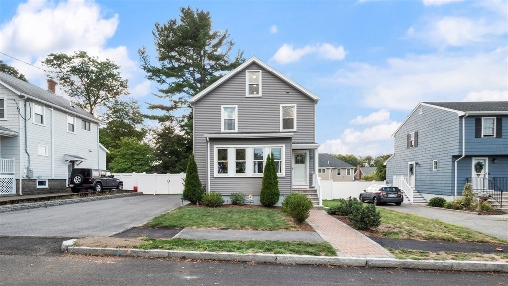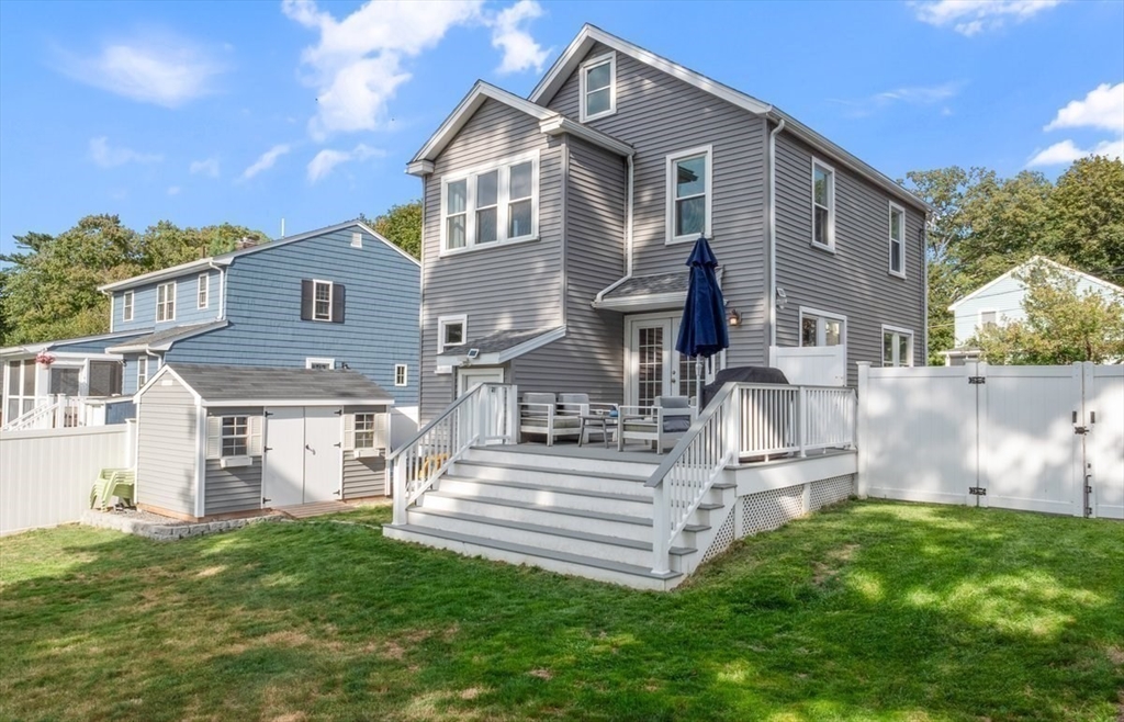 Beautifully renovated 3-bedroom, 1.5-bath home on a quiet dead-end street in Wakefield with convenient access to Lake Quannapowitt, Sullivan Park, the Wakefield-Lynnfield Rail Trail, MarketStreet Lynnfield, and commuter routes. Fully gut-renovated (2019–2021) with all-new systems, roof, siding, AZEK trim, gutters, and composite deck. The open kitchen features granite countertops, stainless steel appliances, an induction range (gas hookup available), breakfast peninsula, and French doors. The primary bedroom addition (2021) offers a custom walk-in closet, plus two additional bedrooms and a finished attic perfect for an office or playroom. Outside, enjoy a composite back deck with wide stairways (2021), 6-ft vinyl privacy fence (2022), custom shed with built-in shelving (2023), and an expanded driveway that fits up to six cars. Hardwood floors throughout, natural light, and sunset views complete this move-in-ready home!