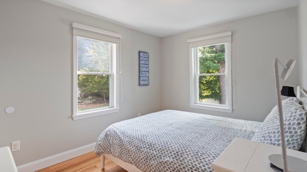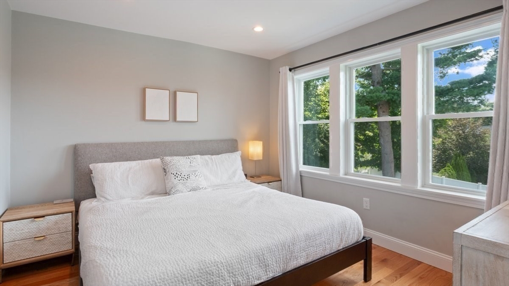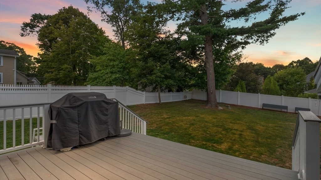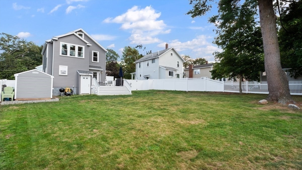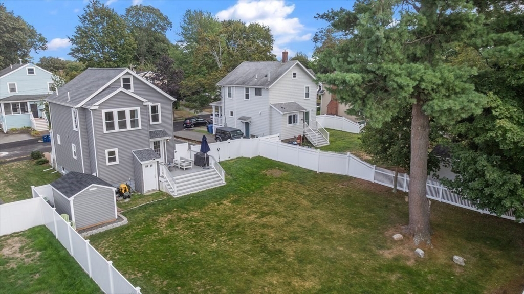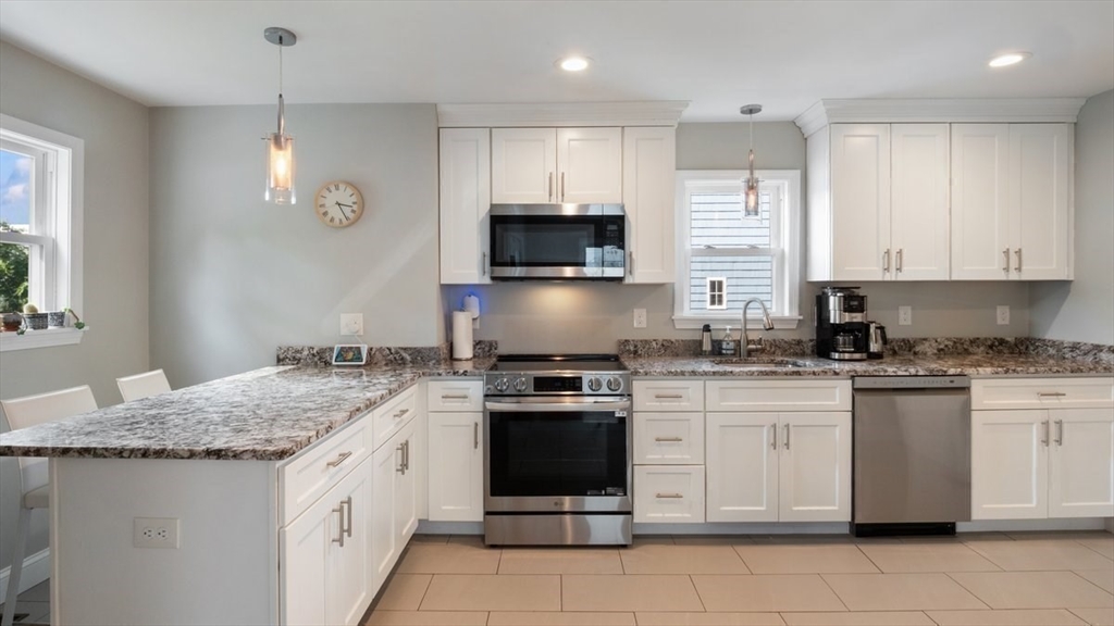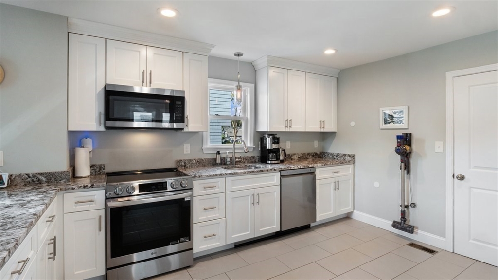Beautifully renovated 3-bedroom, 1.5-bath home on a quiet dead-end street in Wakefield with convenient access to Lake Quannapowitt, Sullivan Park, the Wakefield-Lynnfield Rail Trail, MarketStreet Lynnfield, and commuter routes. Fully gut-renovated (2019–2021) with all-new systems, roof, siding, AZEK trim, gutters, and composite deck. The open kitchen features granite countertops, stainless steel appliances, an induction range (gas hookup available), breakfast peninsula, and French doors. The primary bedroom addition (2021) offers a custom walk-in closet, plus two additional bedrooms and a finished attic perfect for an office or playroom. Outside, enjoy a composite back deck with wide stairways (2021), 6-ft vinyl privacy fence (2022), custom shed with built-in shelving (2023), and an expanded driveway that fits up to six cars. Hardwood floors throughout, natural light, and sunset views complete this move-in-ready home!