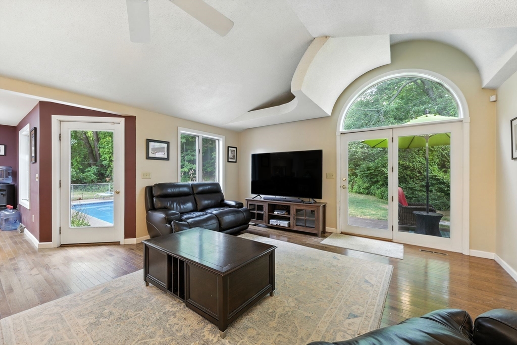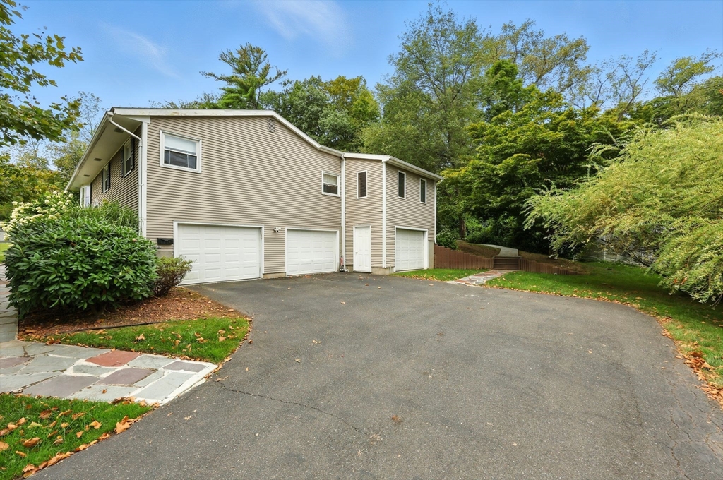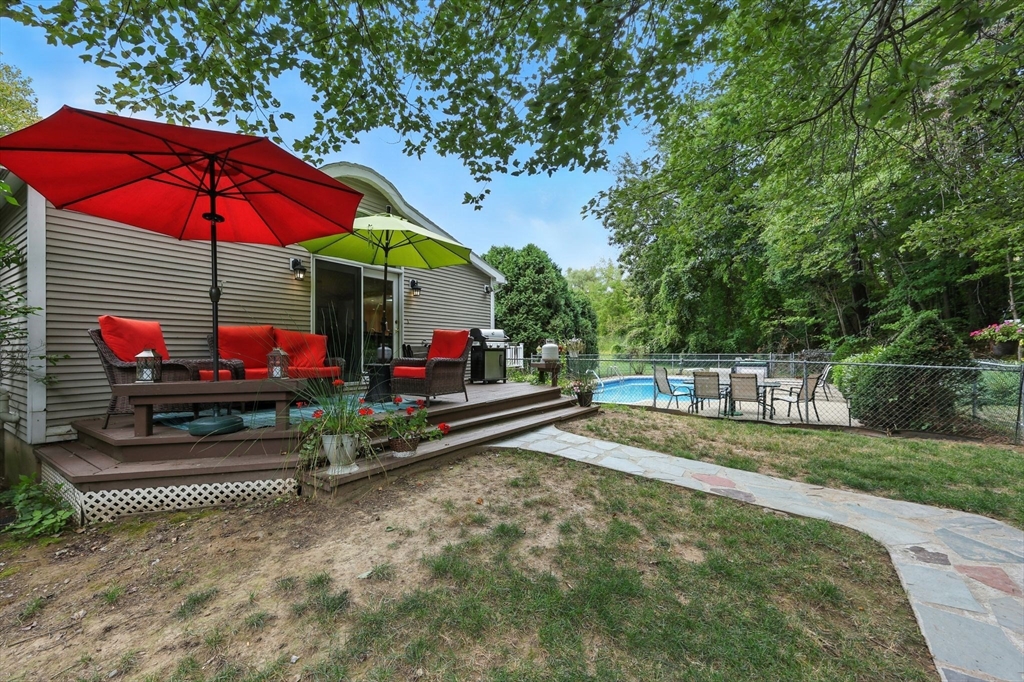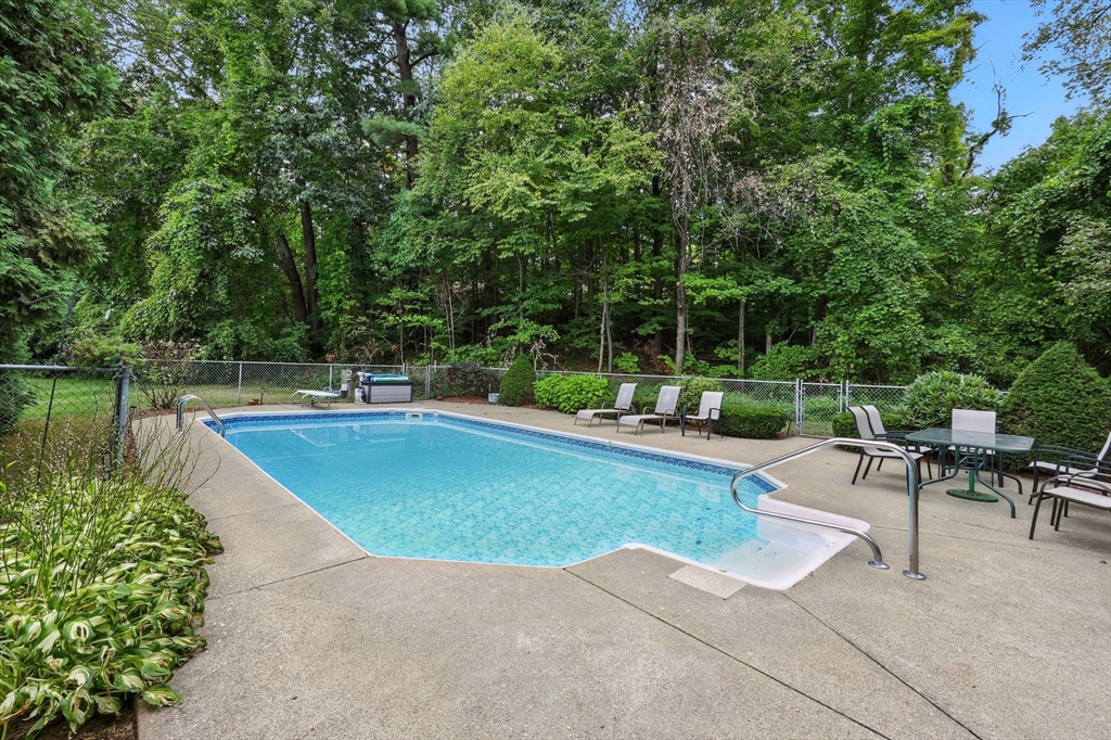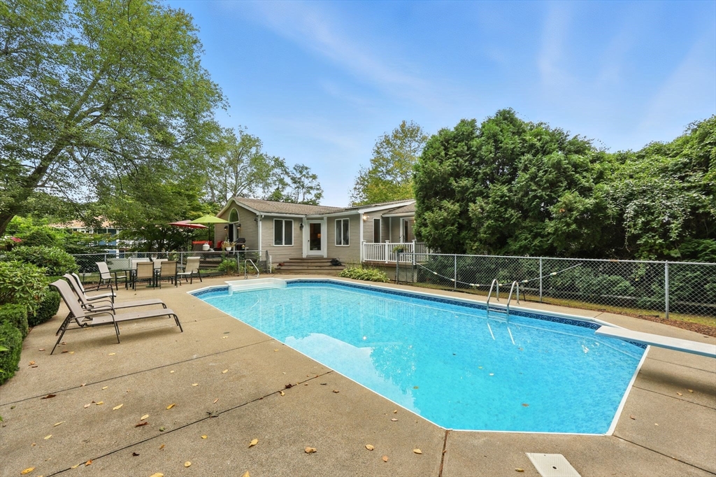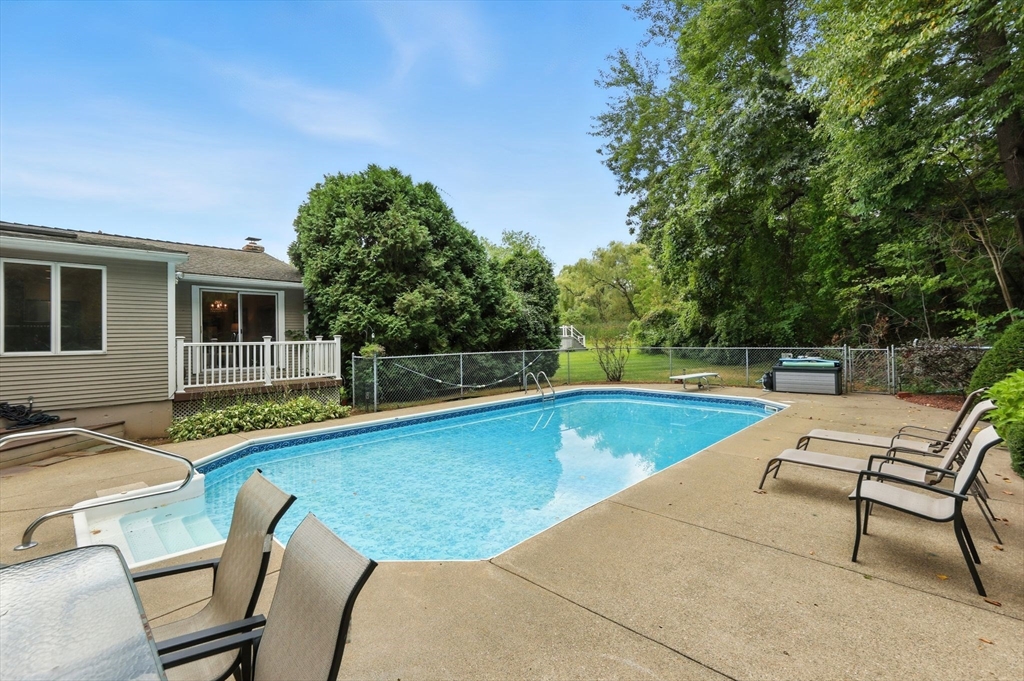 Looking for space, style, and your own backyard getaway? This 4-bedroom split-level ranch offers over 2,300 sq ft of versatile living. The open kitchen, dining, and family room layout is filled with natural light and easy flow. The family room off the kitchen overlooks the beautiful in-ground pool, while a separate living room adds extra space for relaxing or entertaining. The kitchen features granite counters, a 4-seat breakfast bar, and a skylight. The fully finished lower level includes a wet bar and beverage fridge—perfect for movie nights, a playroom, or home office. A rare 3-car attached garage offers plenty of space for vehicles, storage, or hobbies. Enjoy two decks and a concrete patio surrounding the pool, all set in a private yard at the end of a quiet cul-de-sac. Peaceful, practical, and ready for its next chapter!