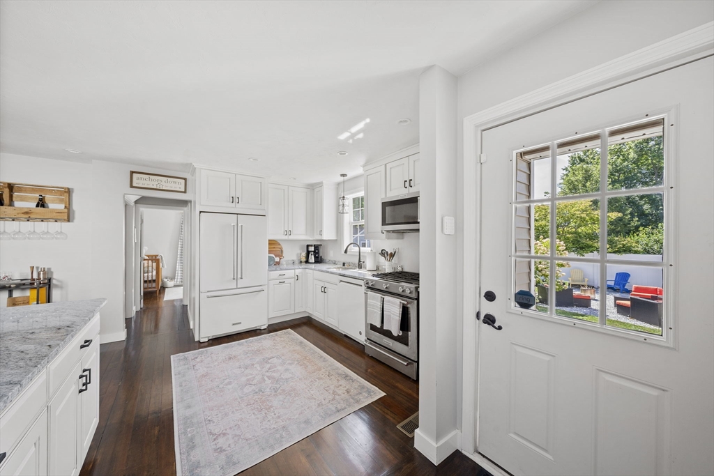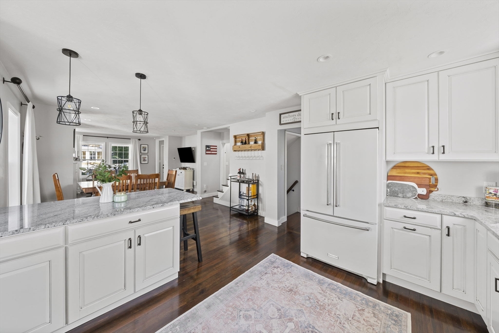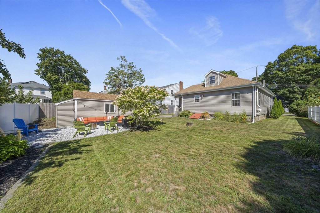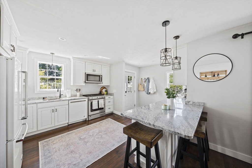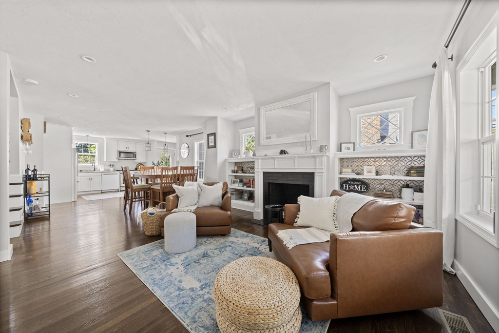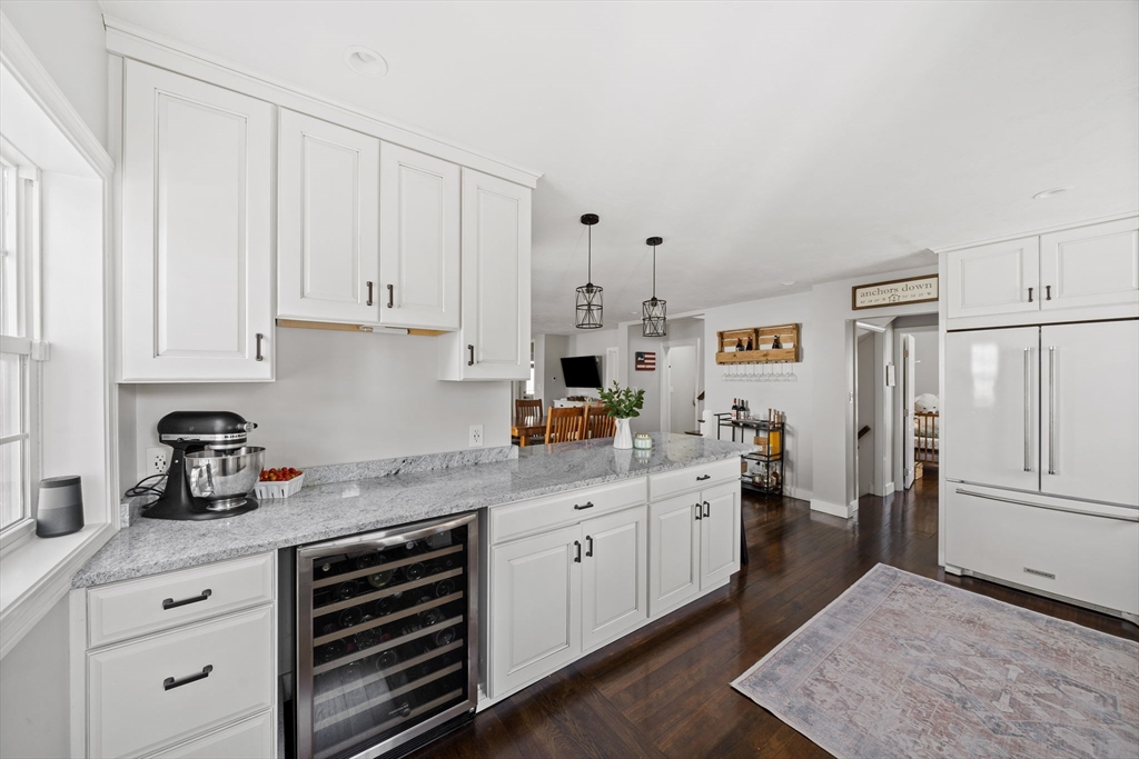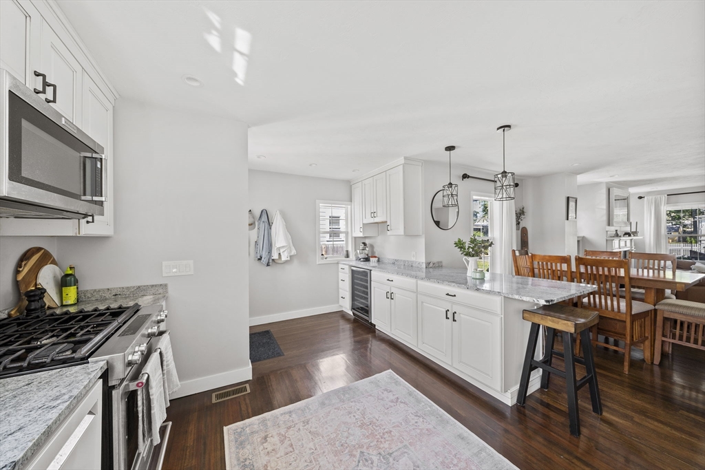 Welcome to 11 Shaw Street, an exquisitely renovated home nestled in the heart of North Weymouth. Step inside the welcoming foyer to discover high ceilings enhanced by recessed lighting and gleaming hardwood floors, which flow seamlessly throughout the main level. The cozy living room fireplace is flanked by built-ins that add both style and functionality. The heart of the home is undoubtedly the kitchen, boasting sleek granite countertops, a convenient breakfast bar, high-end KitchenAid appliances, and a wine fridge. Enjoy the added bonus of the fully finished lower level, complete with a full bathroom and ample storage space. Outside, enjoy the spacious backyard, perfect for relaxing evenings under the stars, while the front porch swing offers a peaceful spot to unwind. This location is incredibly convenient, offering easy access to local amenities, nearby beaches, parks, and public transportation, making it a perfect choice for those seeking a blend of serenity and accessibility.