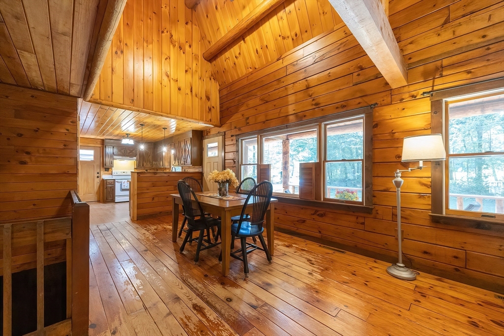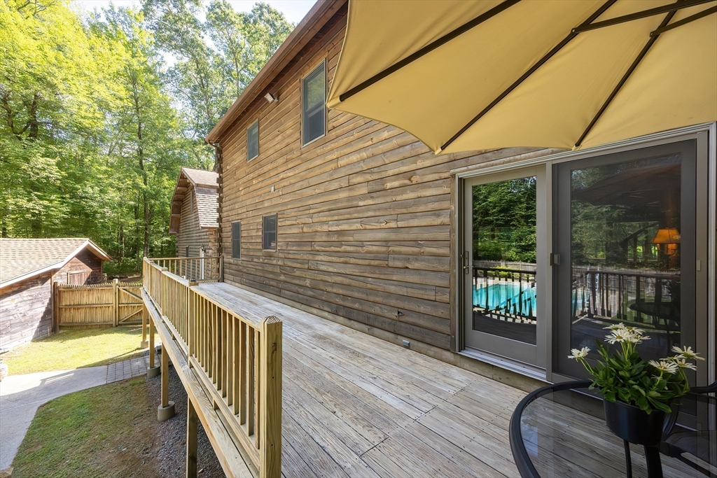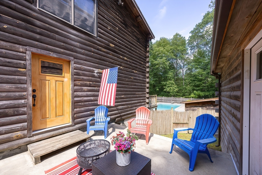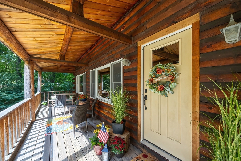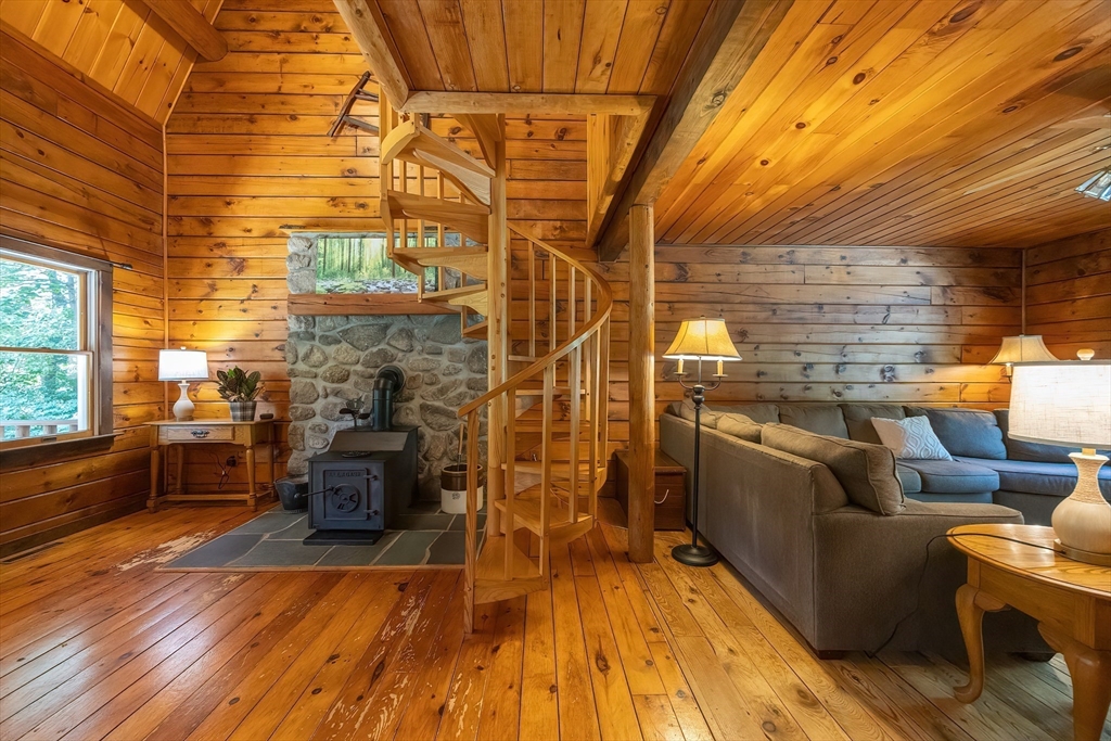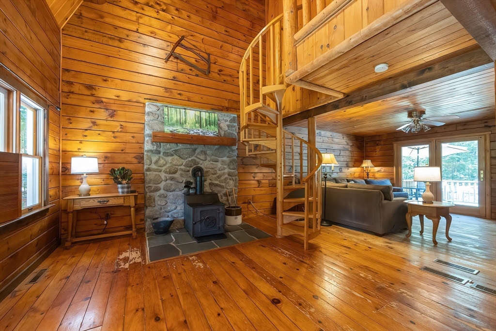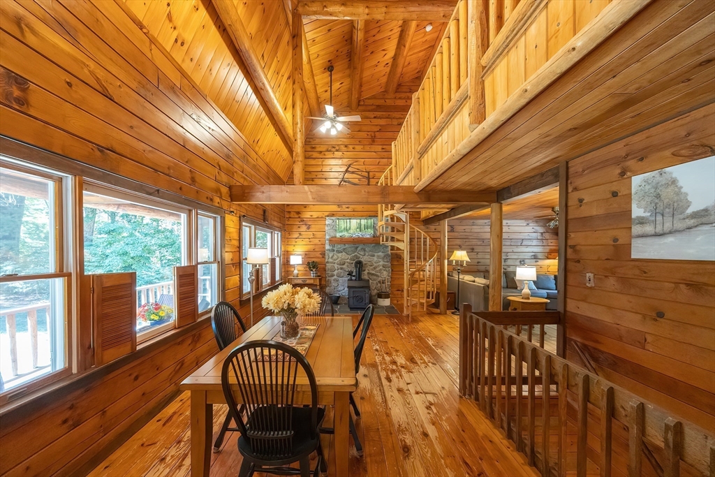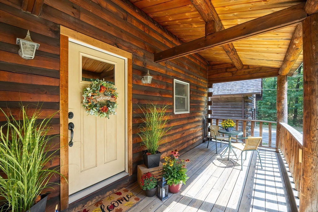 Beautifully crafted log home set on 4.4 acres of serene, wooded land offering ultimate privacy. The expansive front porch is perfect for morning coffee or summer nights with friends. Inside, soaring 20' vaulted ceilings, gleaming wood floors, and a gorgeous stone hearth with an efficient wood stove create a warm, inviting atmosphere. The first floor flows from a kitchen with custom cabinetry and new countertops to an inviting dining and living room. A full bath and versatile bonus room for office or gym complete the level and present the opportunity for single level living! Upstairs are three generously sized bedrooms with individual thermostats, connected by an airy landing that overlooks the living area below. Step out back to a spacious deck overlooking a sparkling in-ground pool and natural landscape. A detached oversized garage provides parking for 2+ cars and expansion potential above. A rare blend of rustic charm and modern updates in a one-of-a-kind setting. Oil tank: 2021