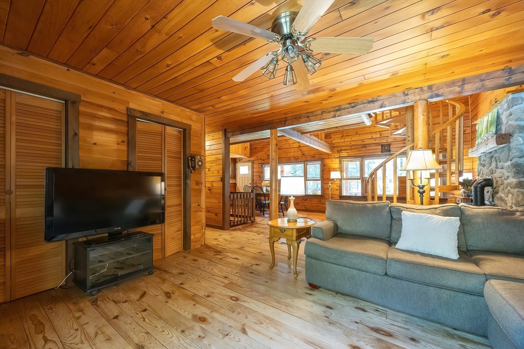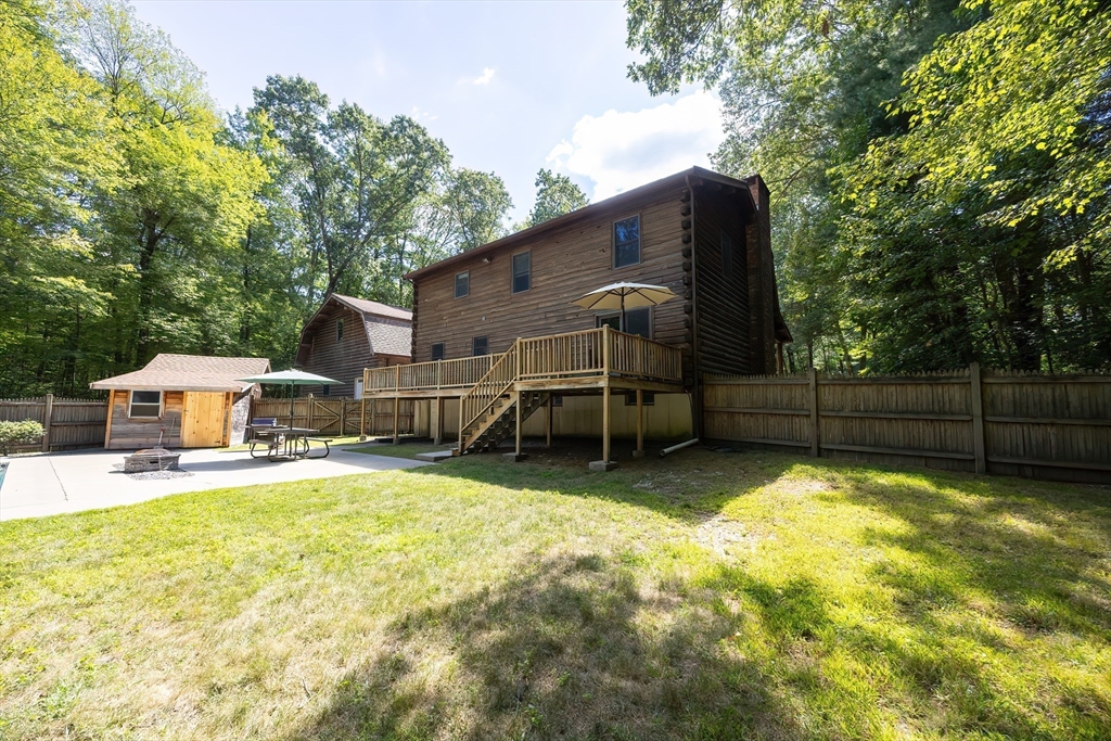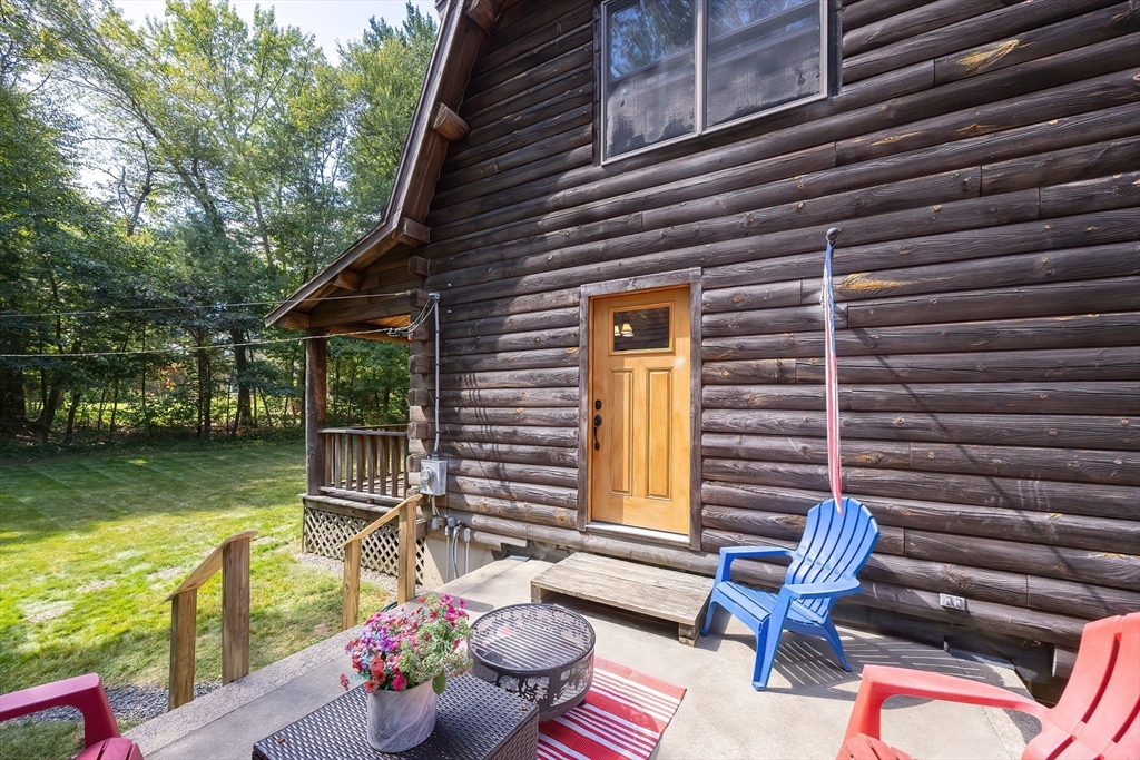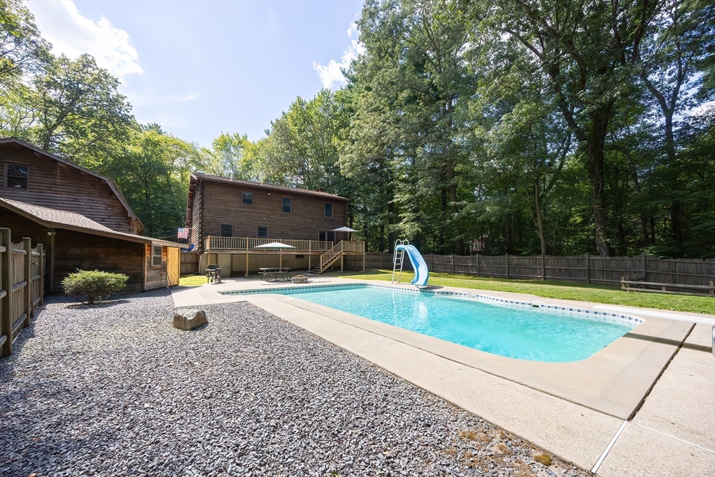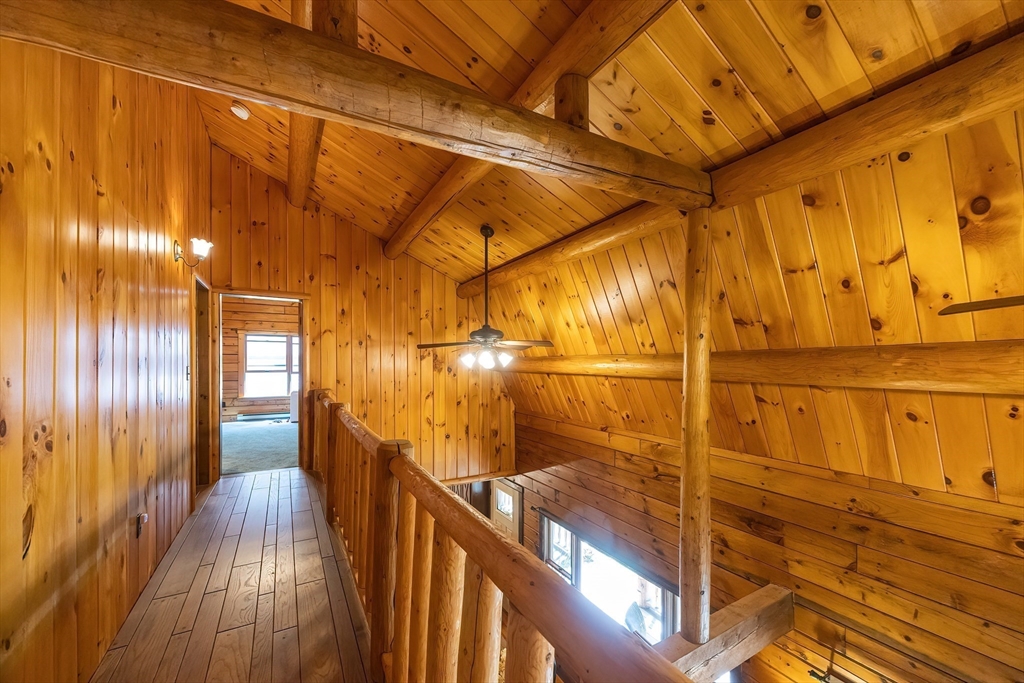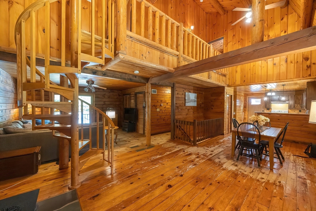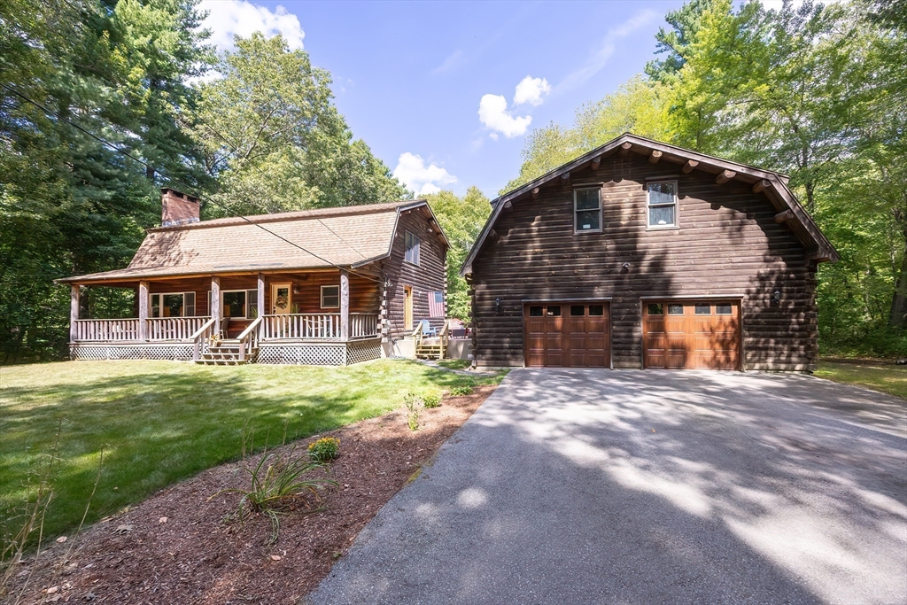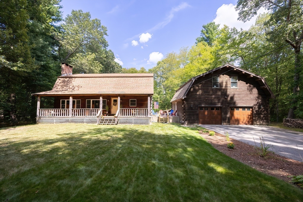 Beautifully crafted log home set on 4.4 acres of serene, wooded land offering ultimate privacy. The expansive front porch is perfect for morning coffee or summer nights with friends. Inside, soaring 20' vaulted ceilings, gleaming wood floors, and a gorgeous stone hearth with an efficient wood stove create a warm, inviting atmosphere. The first floor flows from a kitchen with custom cabinetry and new countertops to an inviting dining and living room. A full bath and versatile bonus room for office or gym complete the level and present the opportunity for single level living! Upstairs are three generously sized bedrooms with individual thermostats, connected by an airy landing that overlooks the living area below. Step out back to a spacious deck overlooking a sparkling in-ground pool and natural landscape. A detached oversized garage provides parking for 2+ cars and expansion potential above. A rare blend of rustic charm and modern updates in a one-of-a-kind setting. Oil tank: 2021