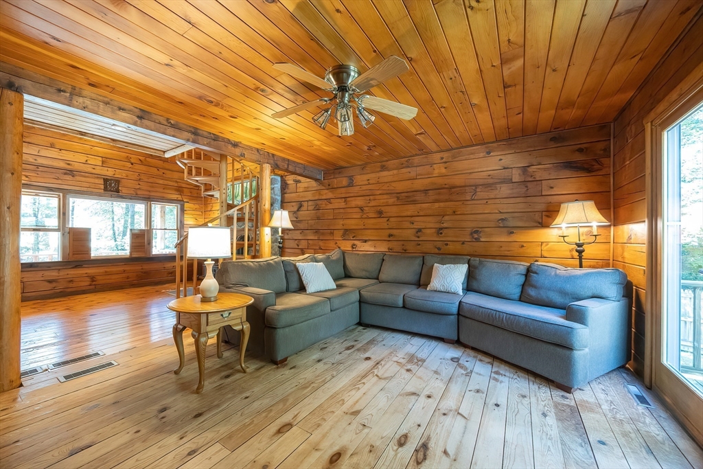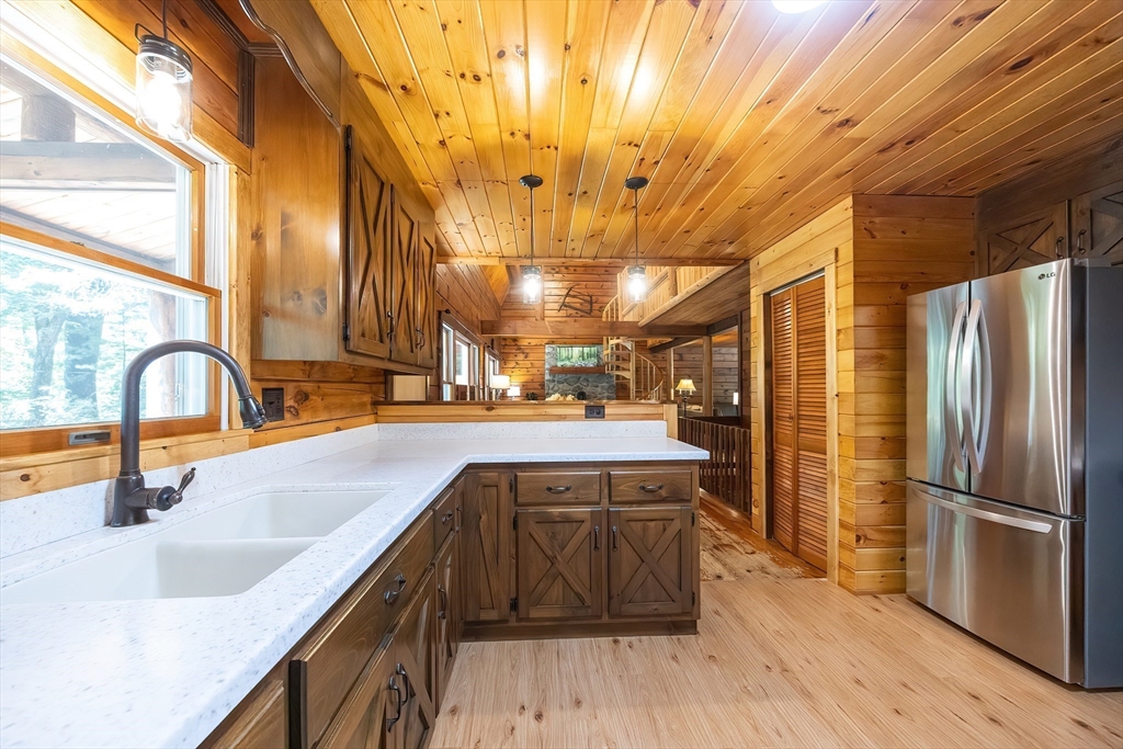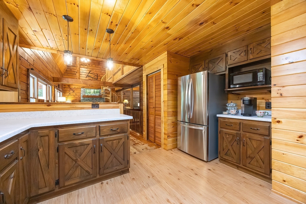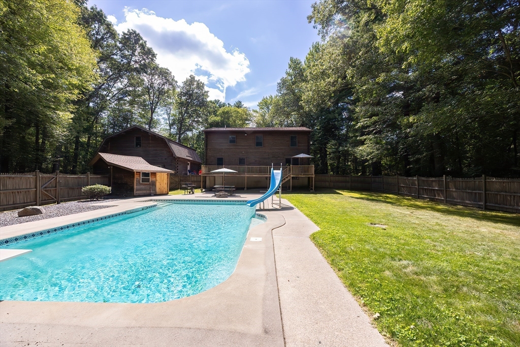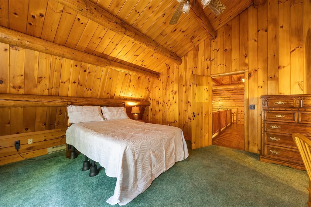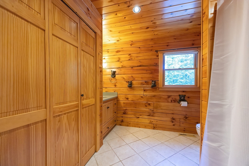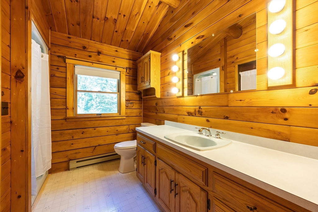 Beautifully crafted log home set on 4.4 acres of serene, wooded land offering ultimate privacy. The expansive front porch is perfect for morning coffee or summer nights with friends. Inside, soaring 20' vaulted ceilings, gleaming wood floors, and a gorgeous stone hearth with an efficient wood stove create a warm, inviting atmosphere. The first floor flows from a kitchen with custom cabinetry and new countertops to an inviting dining and living room. A full bath and versatile bonus room for office or gym complete the level and present the opportunity for single level living! Upstairs are three generously sized bedrooms with individual thermostats, connected by an airy landing that overlooks the living area below. Step out back to a spacious deck overlooking a sparkling in-ground pool and natural landscape. A detached oversized garage provides parking for 2+ cars and expansion potential above. A rare blend of rustic charm and modern updates in a one-of-a-kind setting. Oil tank: 2021