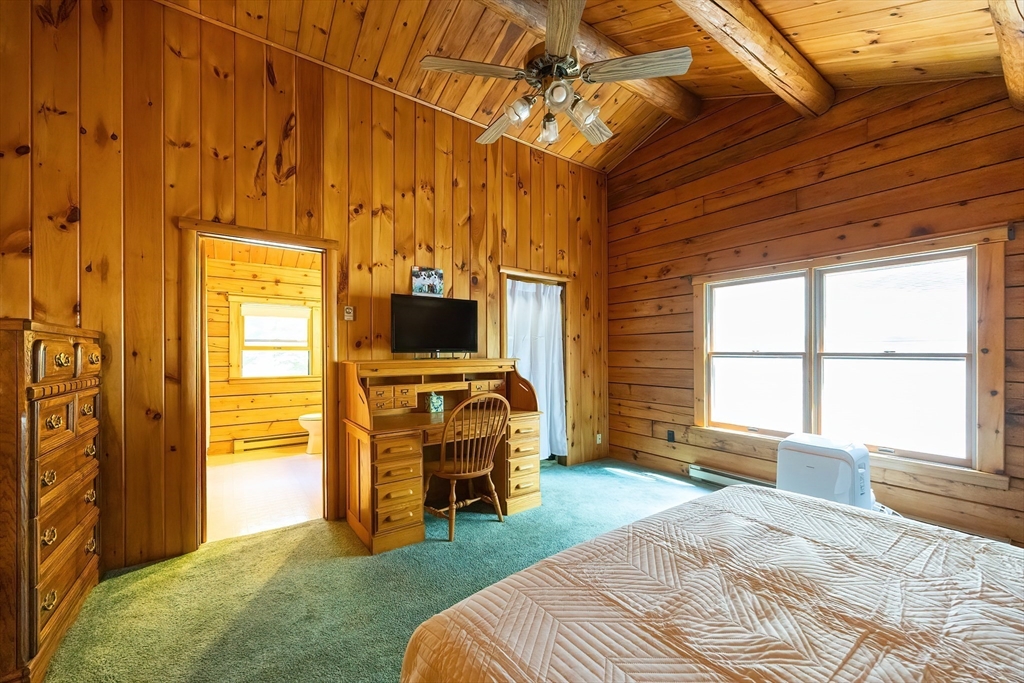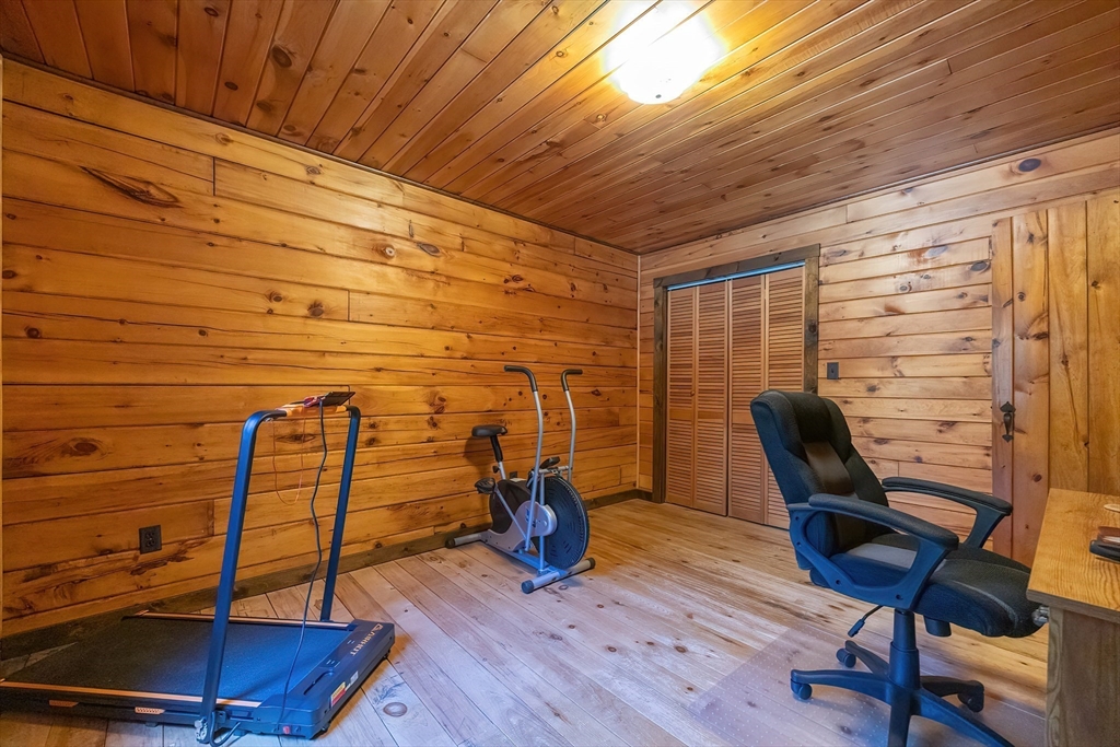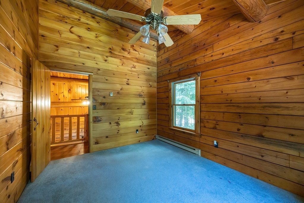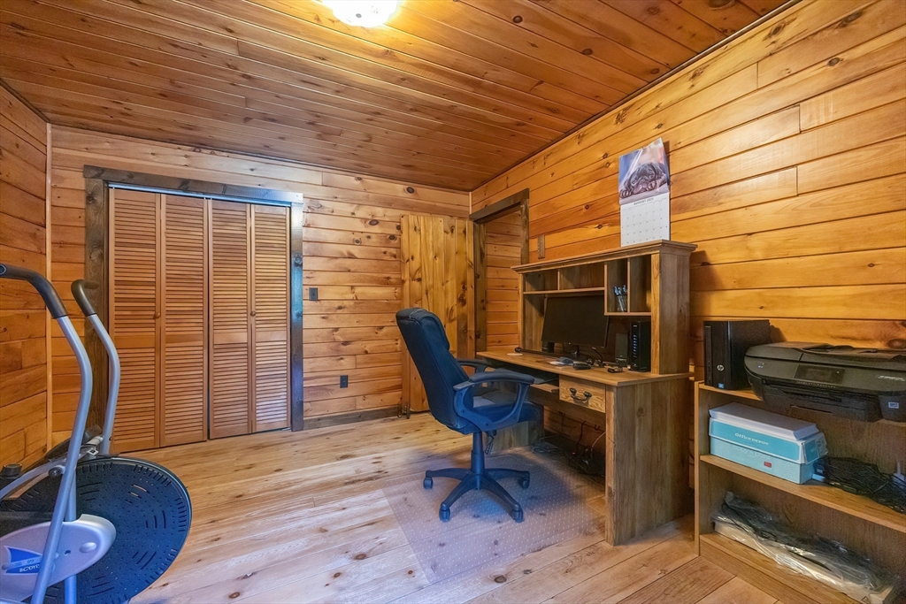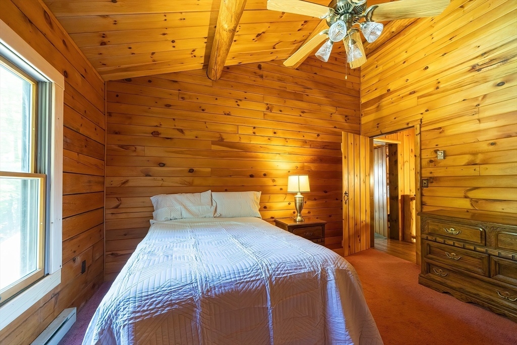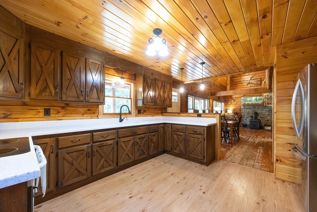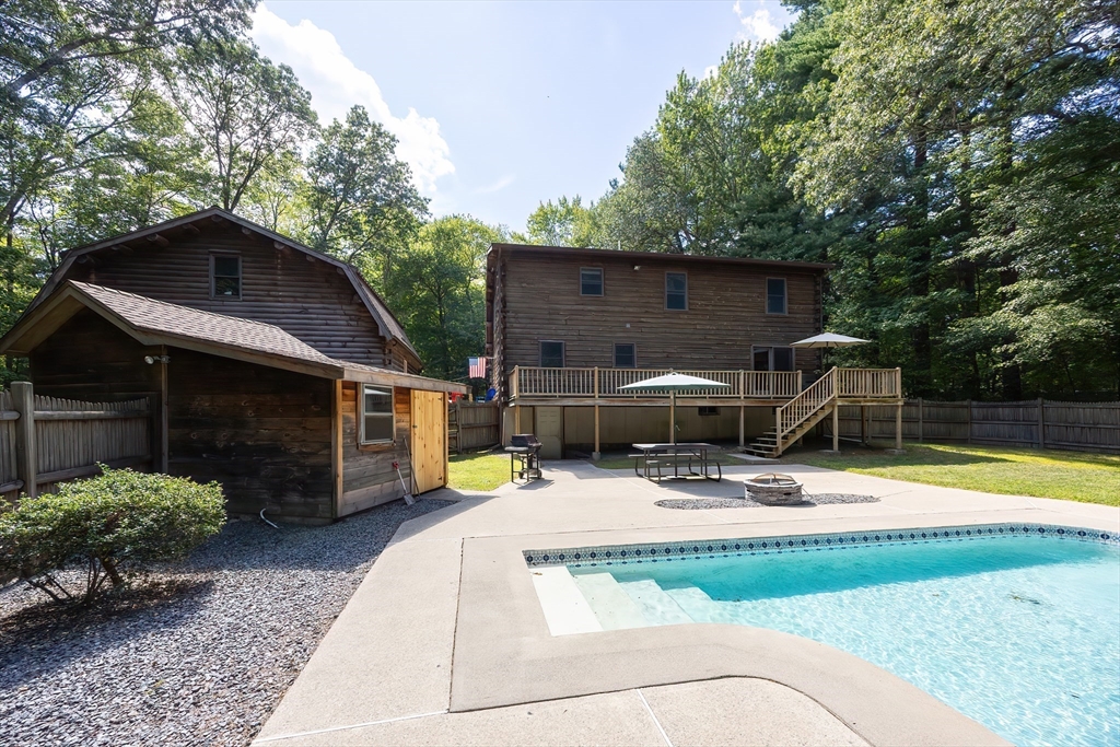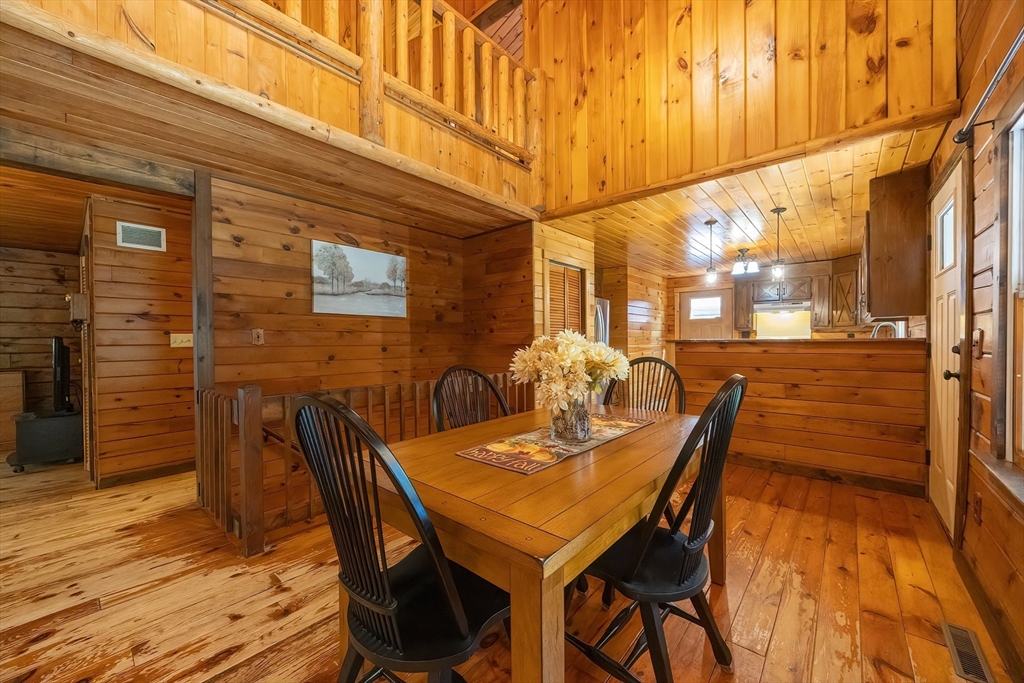 Beautifully crafted log home set on 4.4 acres of serene, wooded land offering ultimate privacy. The expansive front porch is perfect for morning coffee or summer nights with friends. Inside, soaring 20' vaulted ceilings, gleaming wood floors, and a gorgeous stone hearth with an efficient wood stove create a warm, inviting atmosphere. The first floor flows from a kitchen with custom cabinetry and new countertops to an inviting dining and living room. A full bath and versatile bonus room for office or gym complete the level and present the opportunity for single level living! Upstairs are three generously sized bedrooms with individual thermostats, connected by an airy landing that overlooks the living area below. Step out back to a spacious deck overlooking a sparkling in-ground pool and natural landscape. A detached oversized garage provides parking for 2+ cars and expansion potential above. A rare blend of rustic charm and modern updates in a one-of-a-kind setting. Oil tank: 2021