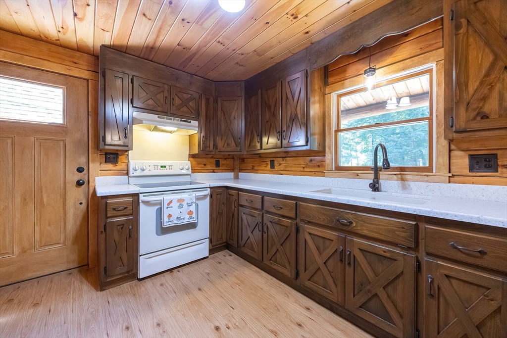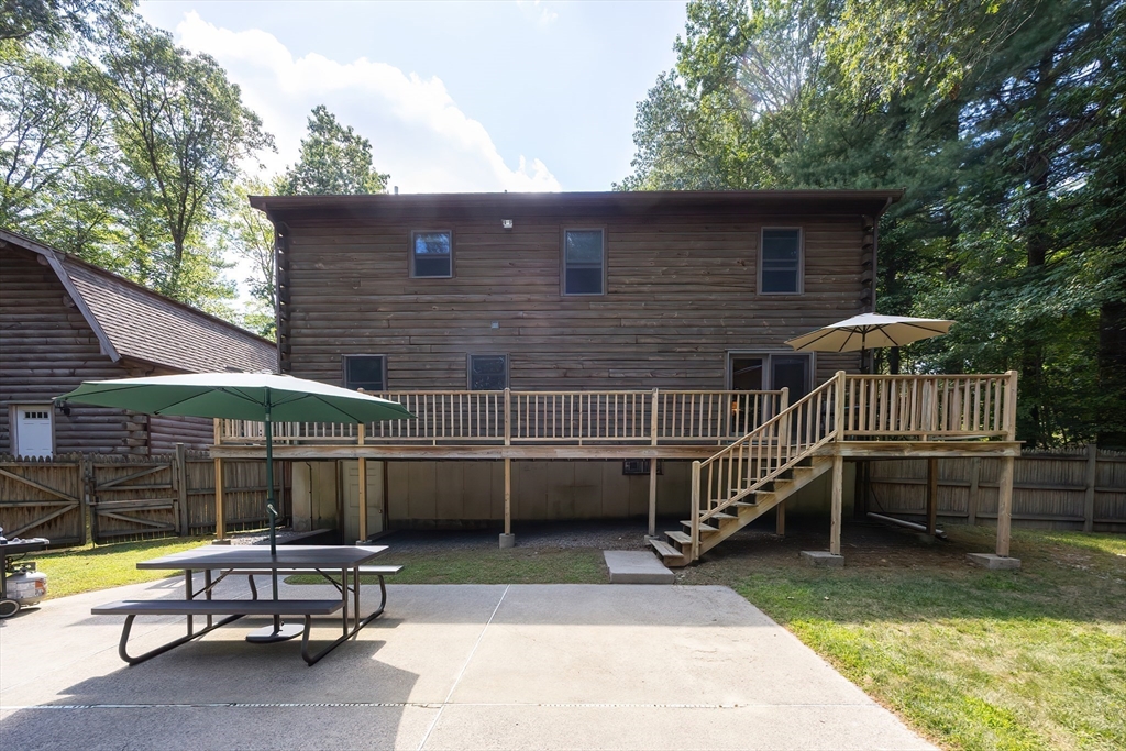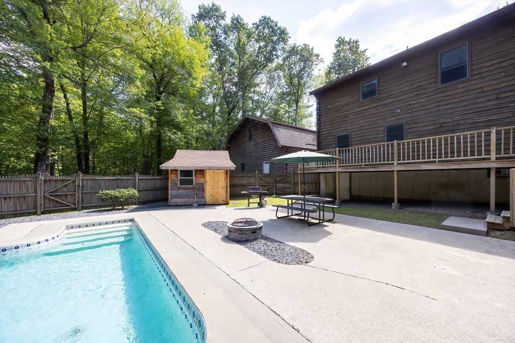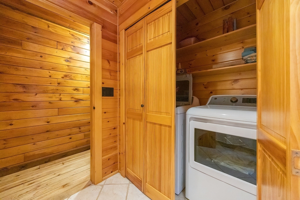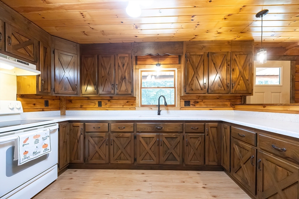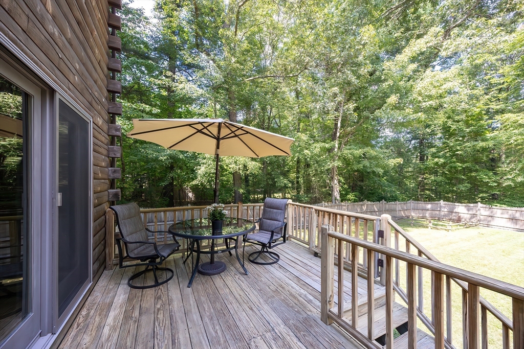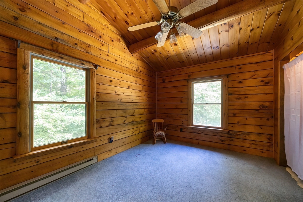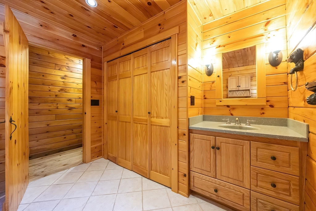 Beautifully crafted log home set on 4.4 acres of serene, wooded land offering ultimate privacy. The expansive front porch is perfect for morning coffee or summer nights with friends. Inside, soaring 20' vaulted ceilings, gleaming wood floors, and a gorgeous stone hearth with an efficient wood stove create a warm, inviting atmosphere. The first floor flows from a kitchen with custom cabinetry and new countertops to an inviting dining and living room. A full bath and versatile bonus room for office or gym complete the level and present the opportunity for single level living! Upstairs are three generously sized bedrooms with individual thermostats, connected by an airy landing that overlooks the living area below. Step out back to a spacious deck overlooking a sparkling in-ground pool and natural landscape. A detached oversized garage provides parking for 2+ cars and expansion potential above. A rare blend of rustic charm and modern updates in a one-of-a-kind setting. Oil tank: 2021