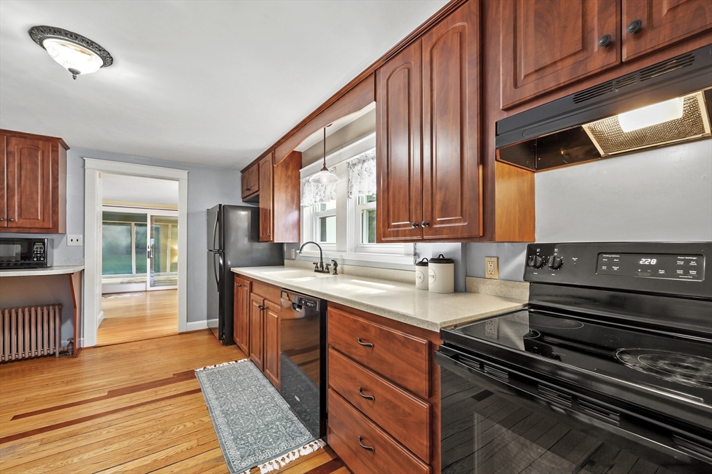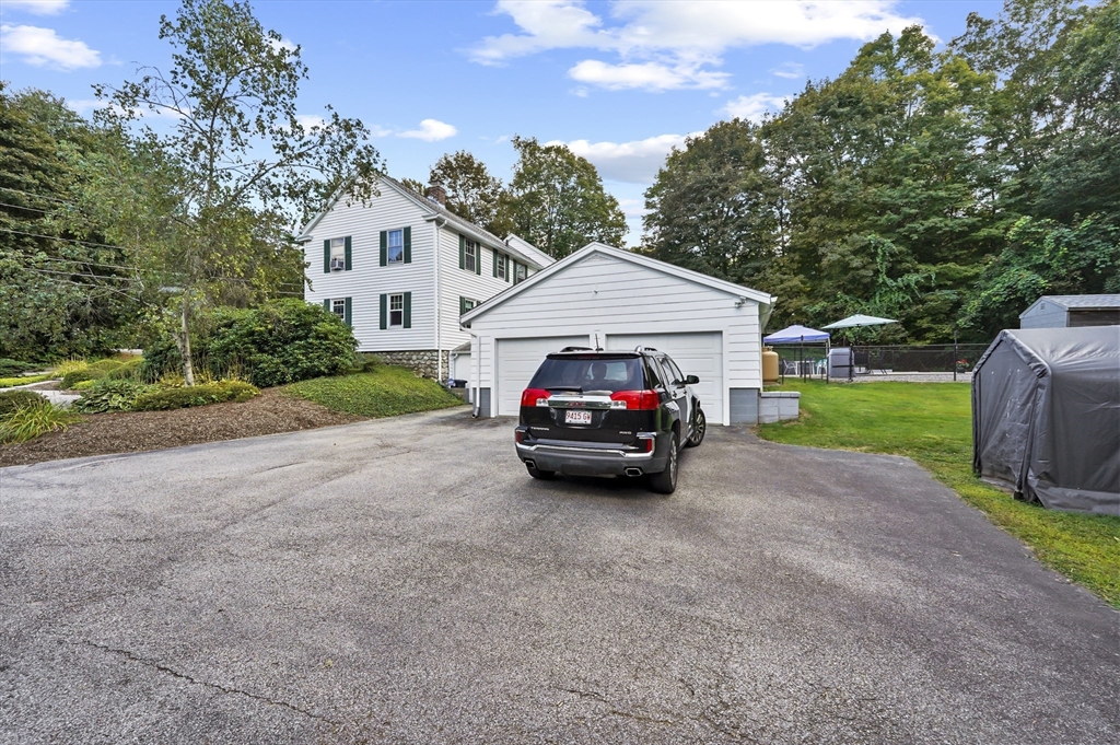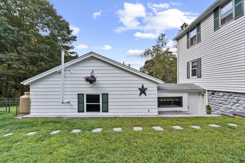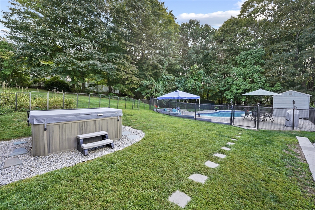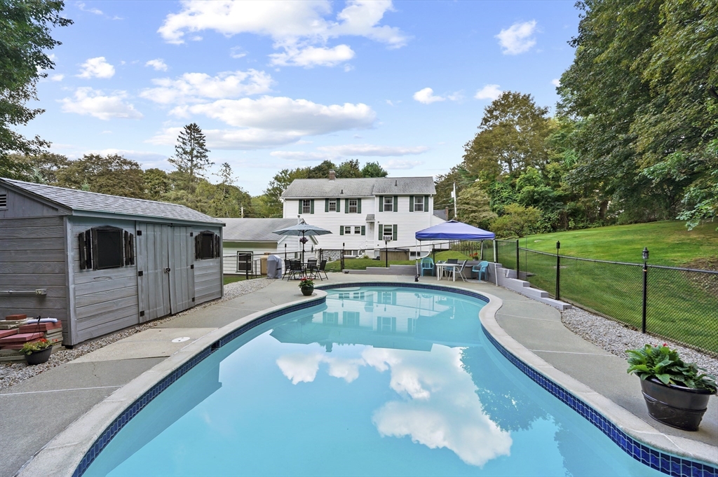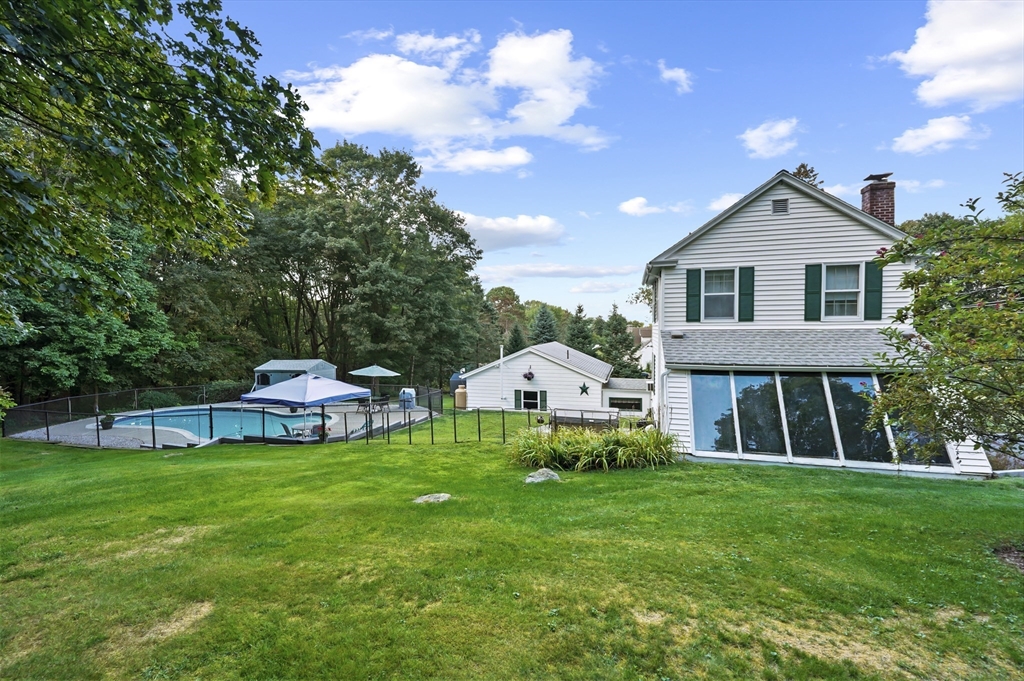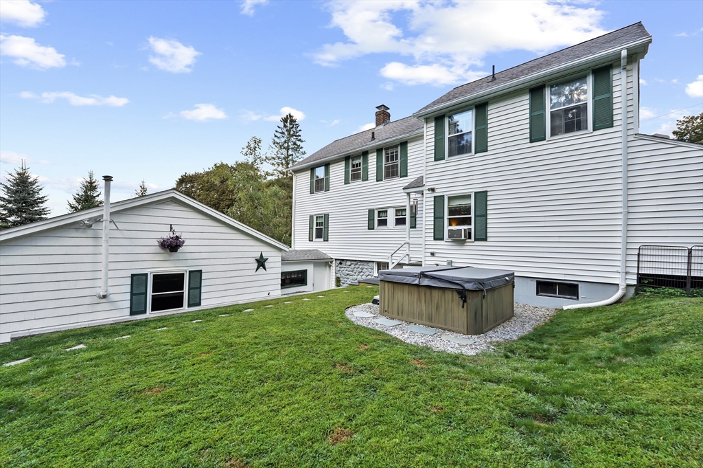 Welcome to this beautifully maintained home on over an acre of landscaped grounds. Enjoy a Gunite pool, hot tub, and spacious yard—perfect for entertaining or relaxing. Inside, hardwood floors flow throughout the main level, featuring a spacious living room with fireplace, a bright three-season porch, and an inviting entryway, along with a kitchen boasting cherry cabinets and Corian countertops. Upstairs offers three bedrooms and a versatile bonus area ideal for an office, playroom, or sitting nook. The finished lower level, heated by propane, adds flexible space for guests, a gym, or hobbies. Recent updates include a new furnace and bulkhead (2025), pool pump (2021), pool replastered and retiled (2017), backyard retaining wall (2023), and roof replacements for the home (2014), garage (2009), and shed (2023). With excellent curb appeal and a commuter-friendly location near major routes, this home is ready to enjoy inside and out.