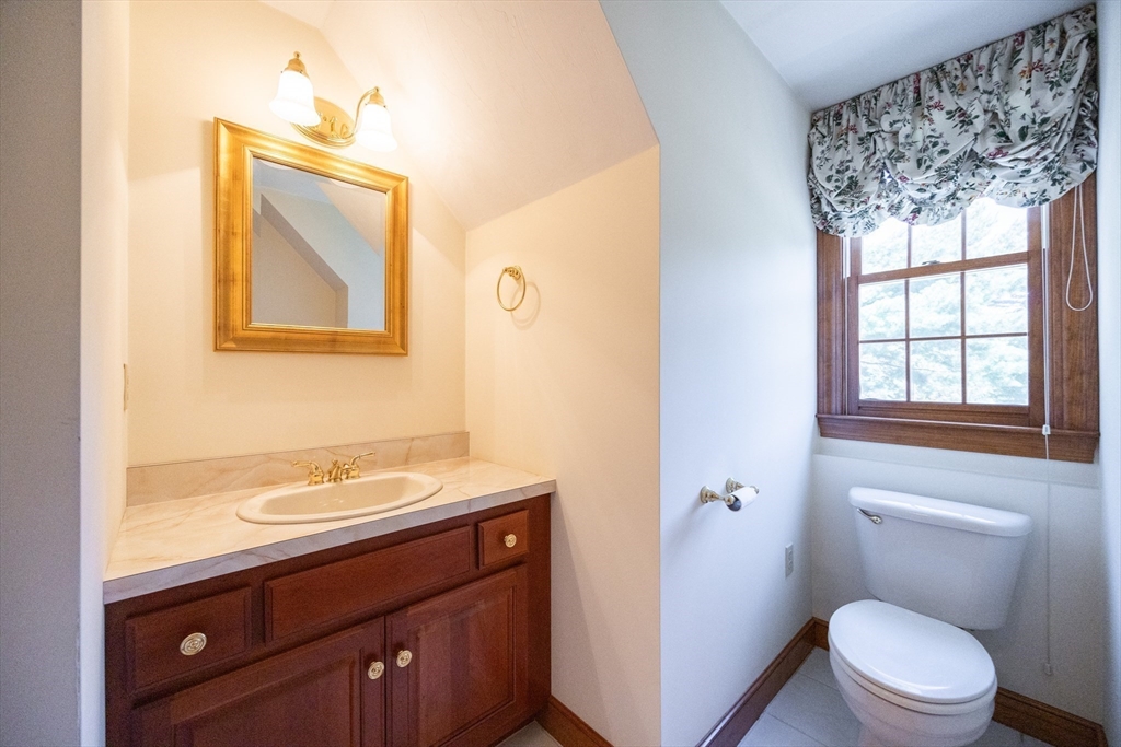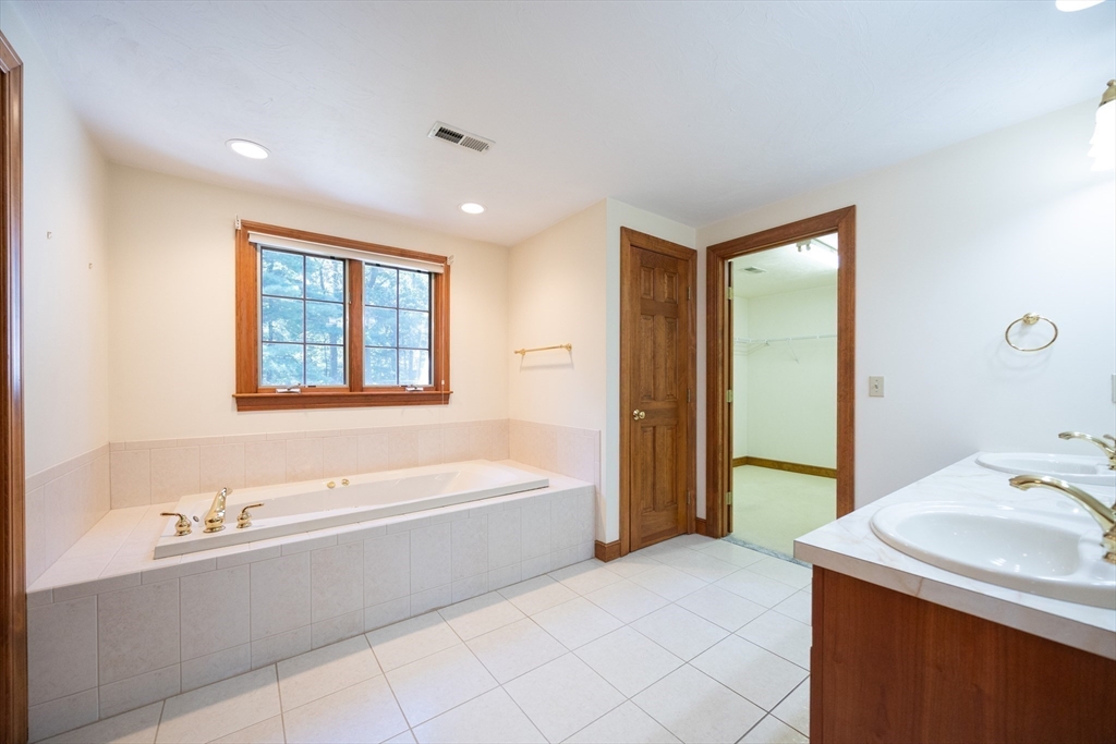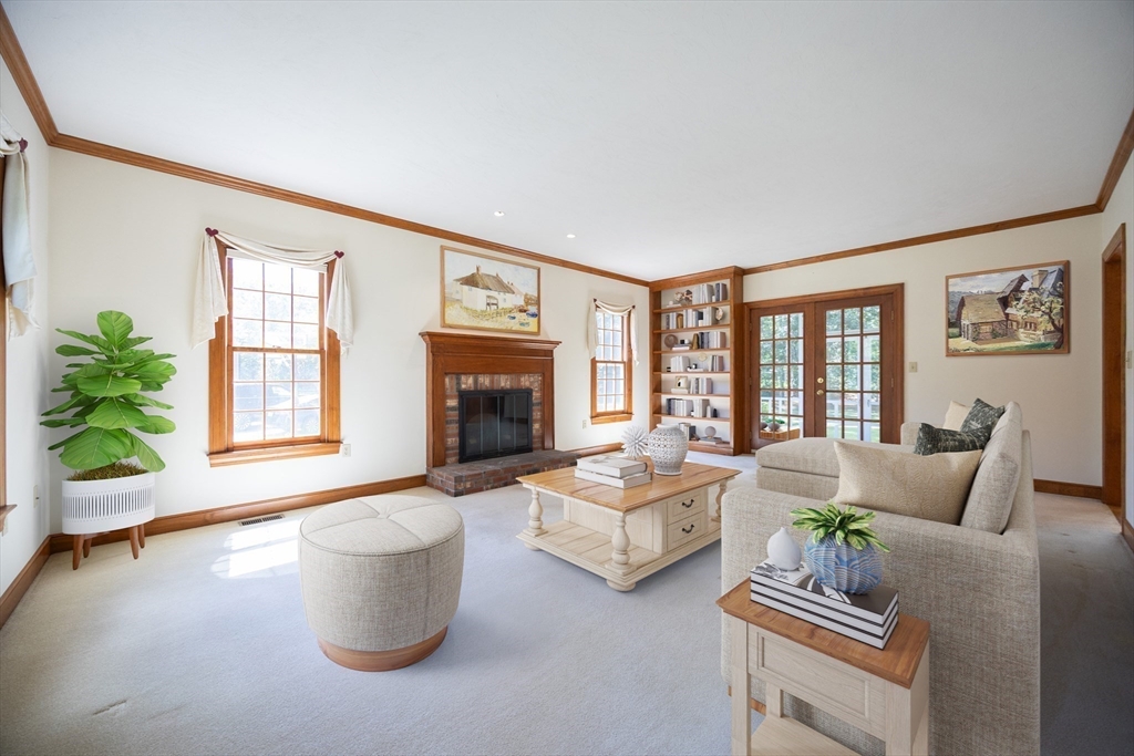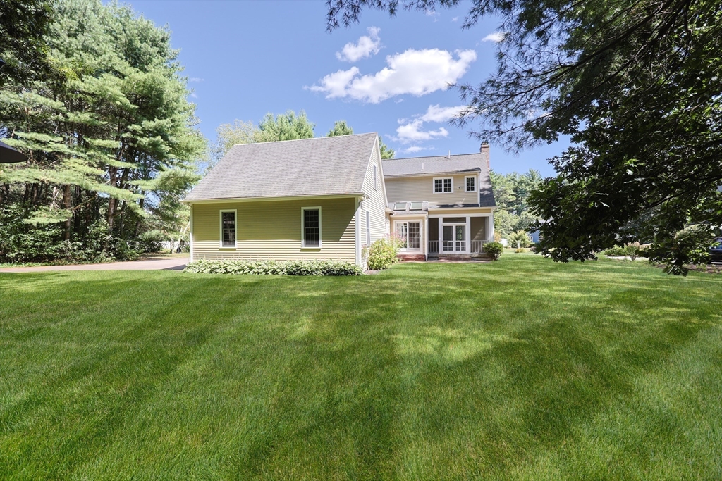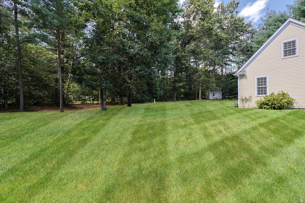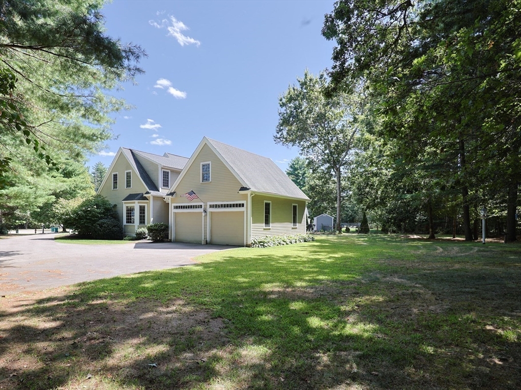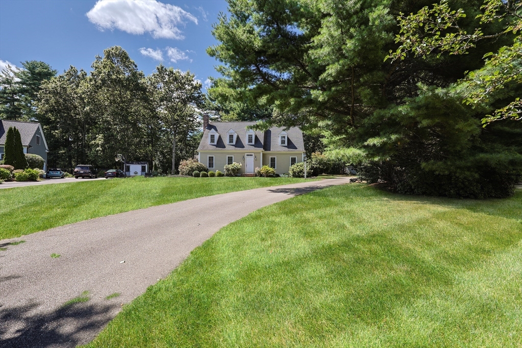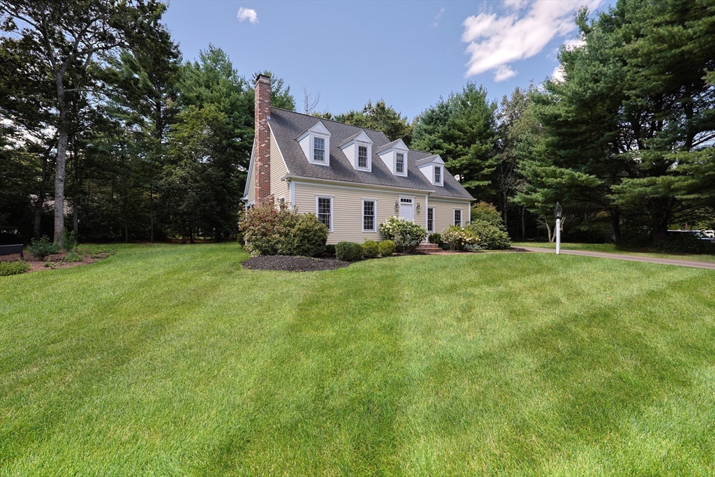 Beautiful custom Cape located in Andrews Farm Estates near schools. Cul-de-sac location, approximately one acre lot, two-car side entry garage plus a large shed. The kitchen has cherry cabinets, stainless steel appliances, granite countertop and dining area with sliders leading to backyard and screen porch. The first floor has a spacious family room with a fireplace and built-ins (carpet), formal dining room plus a first-floor study/kids play room/living room with hardwood floors. The primary suite has a large walk-in closet and private bath with Jacuzzi tub and double sinks. Large unfinished space over the garage (26x22), full basement with stairs to garage, natural gas heat, central air, central vac, Title 5 approved, irrigation system and much more! Floor plan attached.