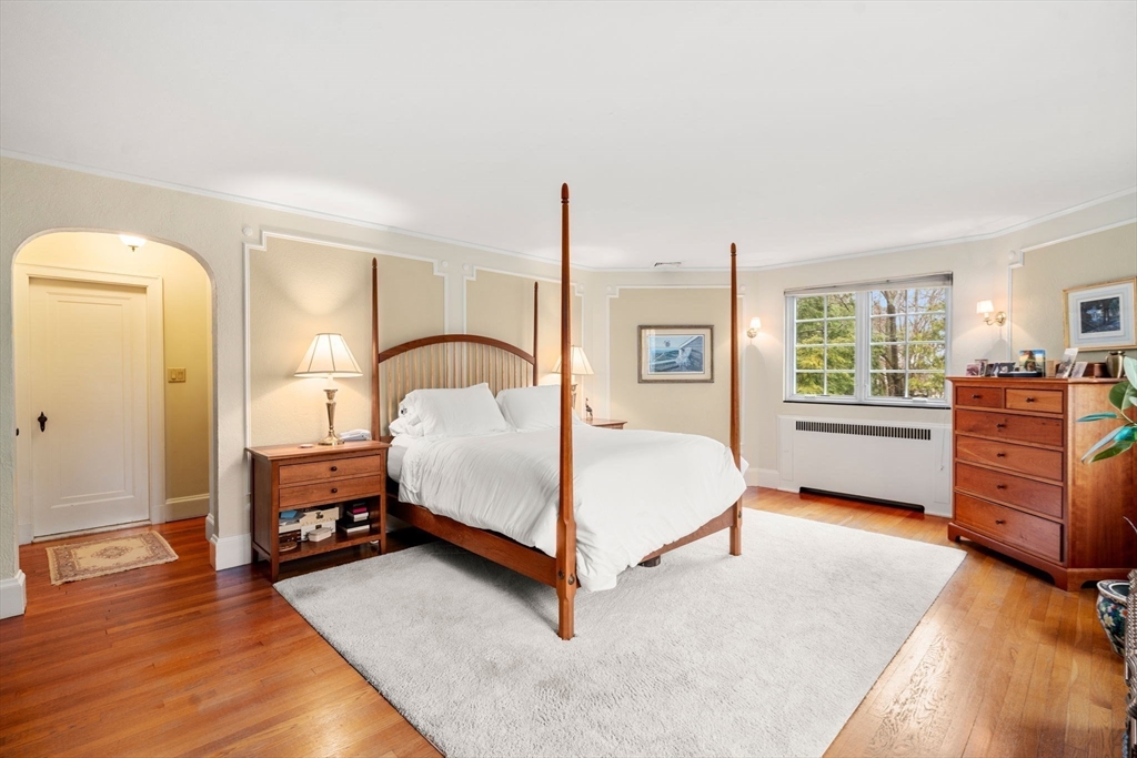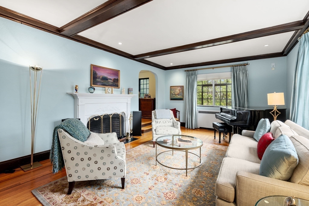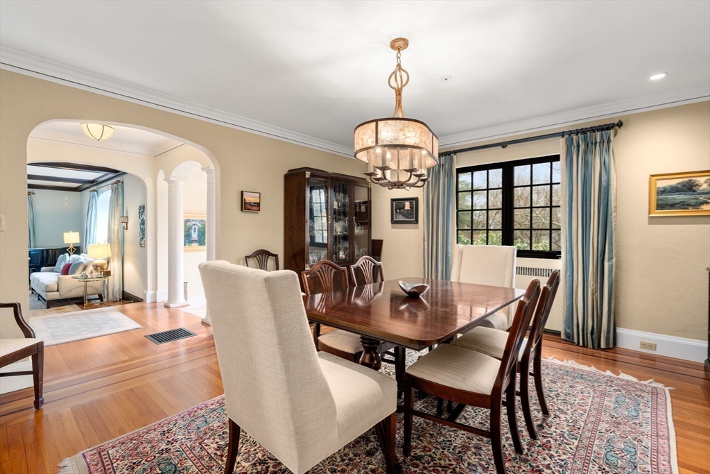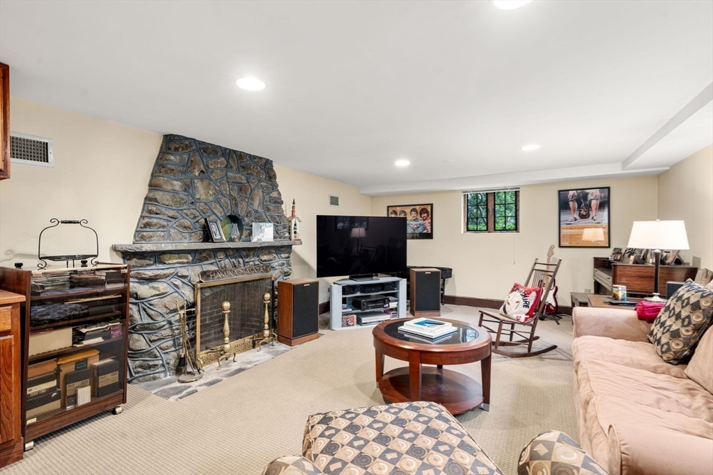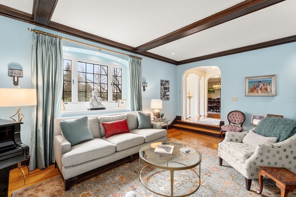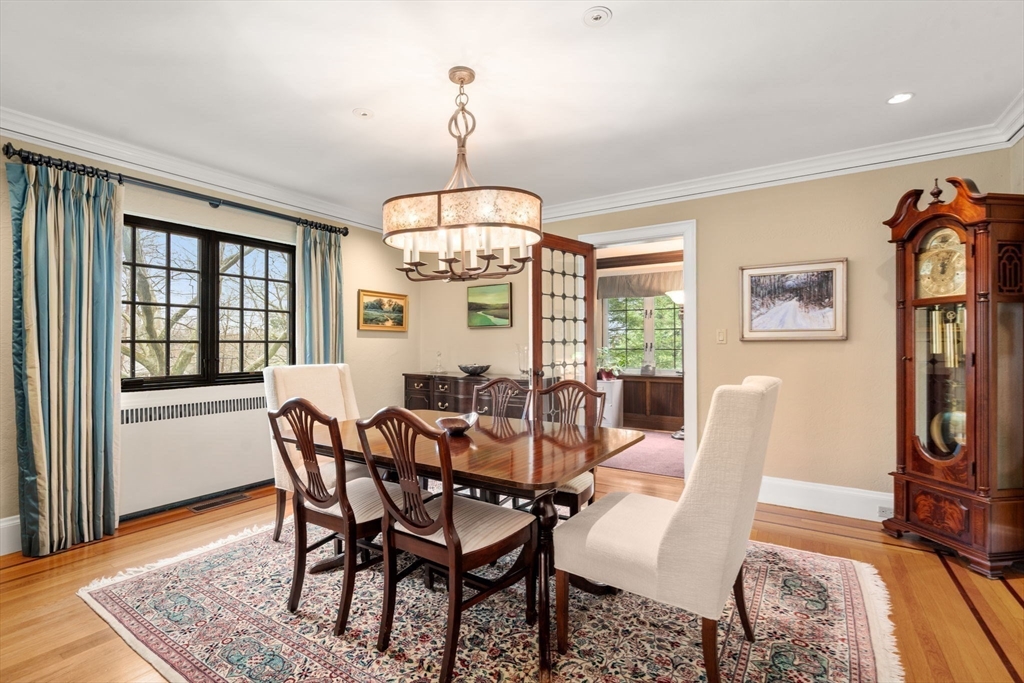 Nestled atop a gentle knoll on a tree-lined street, this English Tudor offers timeless elegance with thoughtful updates. Located in the Baker School district and minutes from Chestnut Hill, this 5-bedroom, 5-bath home combines character with inviting living spaces. A sun-filled step-down living room with fireplace, a formal dining room, and oversized windows set the tone for gracious entertaining. Intricate crown moldings, inlaid hardwood floors, and soaring ceilings showcase the home’s craftsmanship. The 1st floor also includes a bright eat-in kitchen, family room, private office, & full bath. Upstairs, the primary suite features an ensuite bath and walk-in closet, joined by two bedrooms with balcony and a charming turret room. The 3rd floor adds two more bedrooms and full bath. The lower level includes a direct-entry 2-car garage, a versatile family room w/kitchenette, exercise room, full bath, and laundry. Outside, relax in a private, beautifully landscaped yard w/bluestone patio.