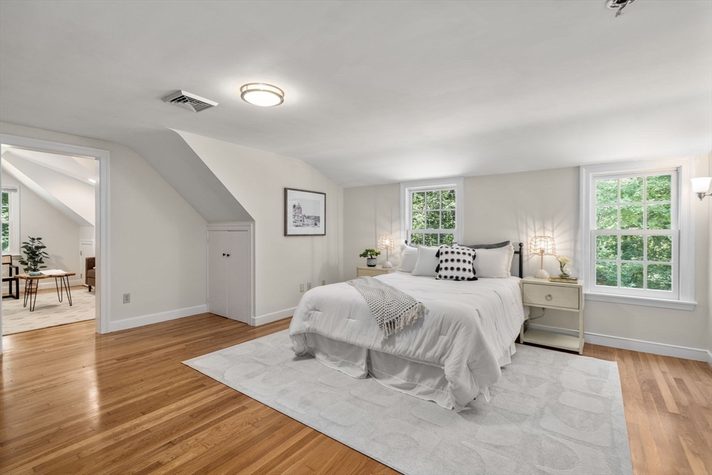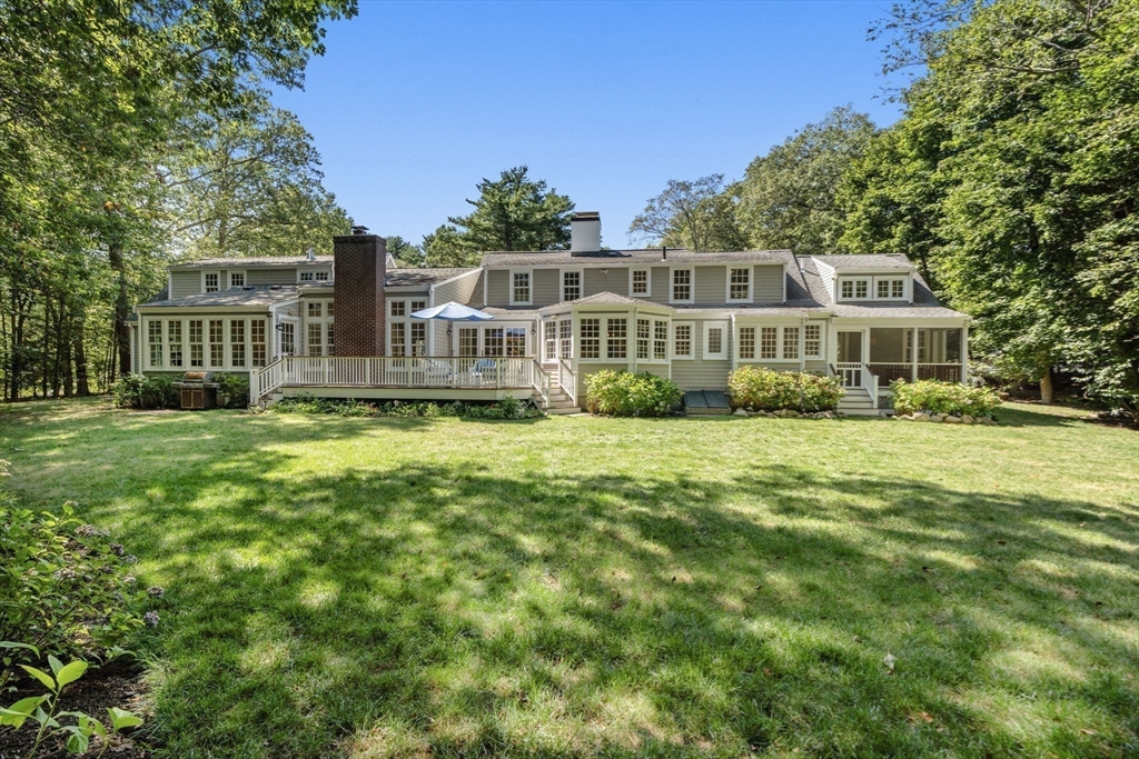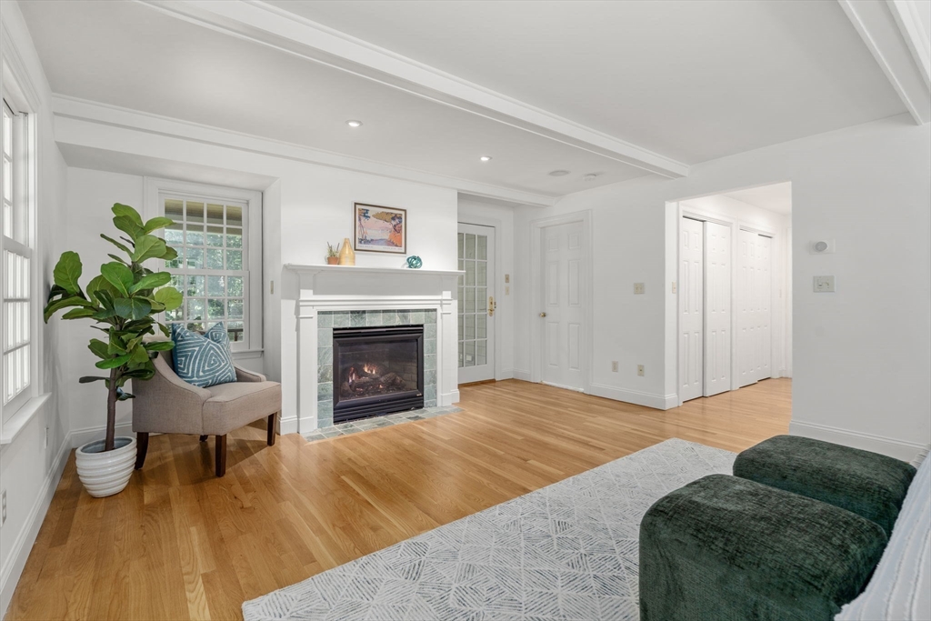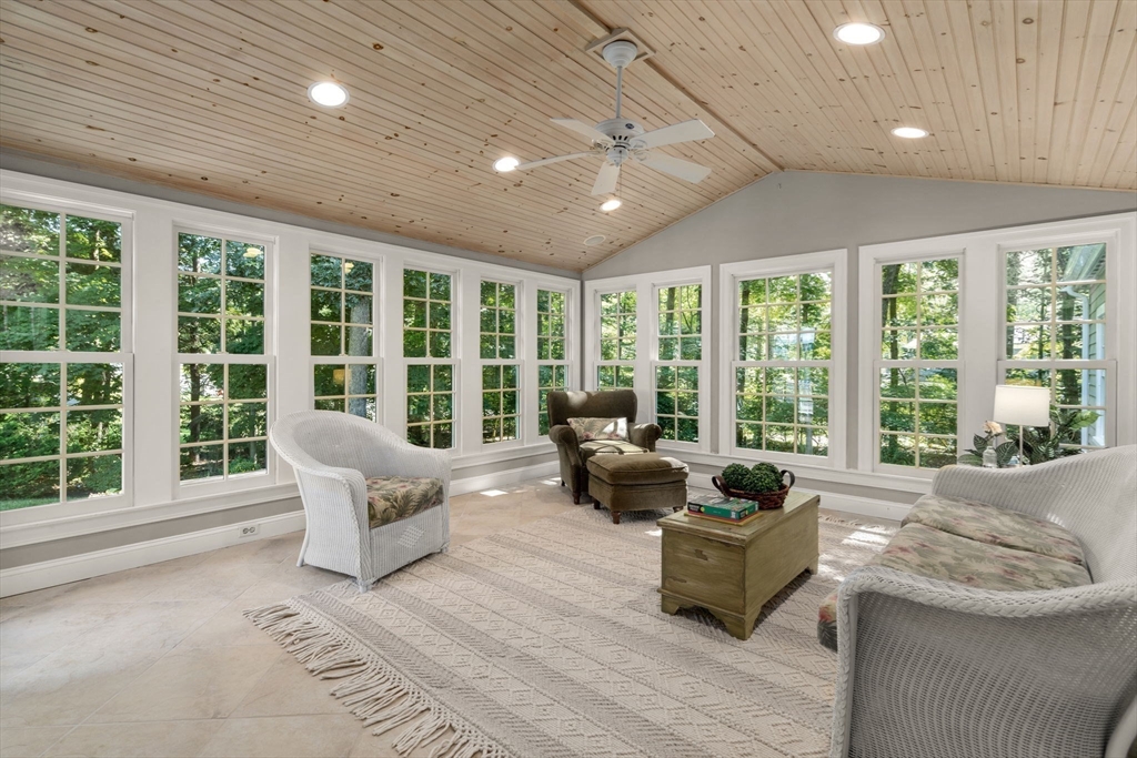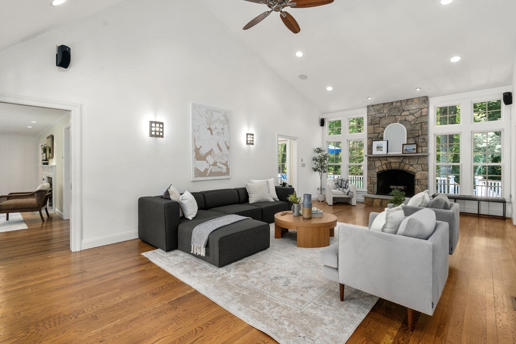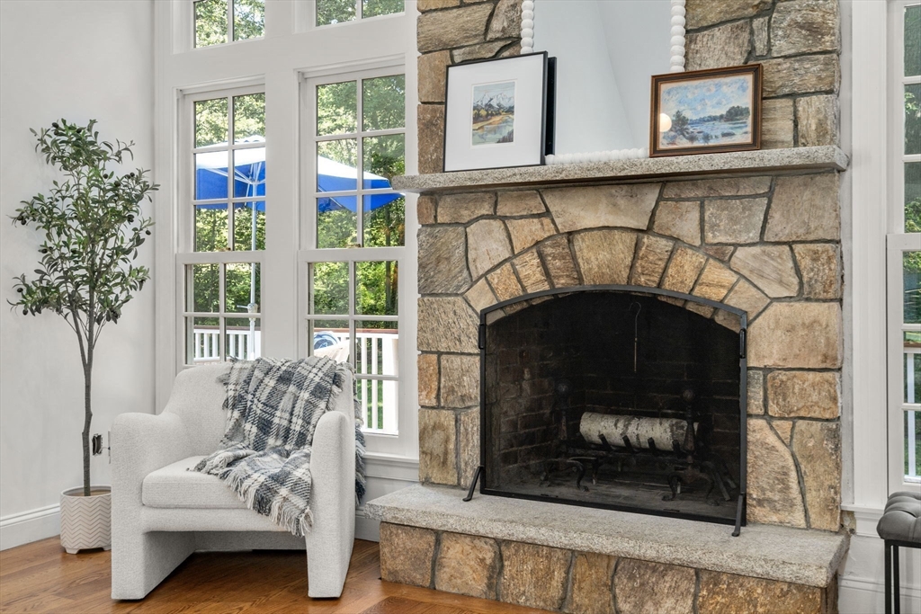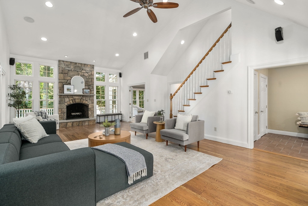 Stunning Architect-Designed Estate Home in south Wayland. Experience luxury in this 2004 fully renovated and expanded estate home on 29,800 sq ft of landscaped grounds. Enjoy a walk-to-everything lifestyle in a sought-after neighborhood. With over 4,500 sq ft of living space, including 2,700 sq ft on the main level, this home features 5 bedrooms, 4 bathrooms, and 5 fireplaces. Flexible living spaces include a grand family room with a cathedral ceiling and dramatic fieldstone fireplace, a chef's kitchen with premium appliances, and a stunning sunroom with floor-to-ceiling windows. Beautiful primary bedrooms on both floors, each with a fireplace, create a private sanctuary. Bonus/office room adds charm. The home boasts over 70 premium windows, a new hydro air HVAC system, a whole-house stereo, and mahogany porches and deck. Walk to ALL schools, town pool, trails, eateries & minutes to major commuter routes. The architecturally designed layout maximizes space and flexible family living.