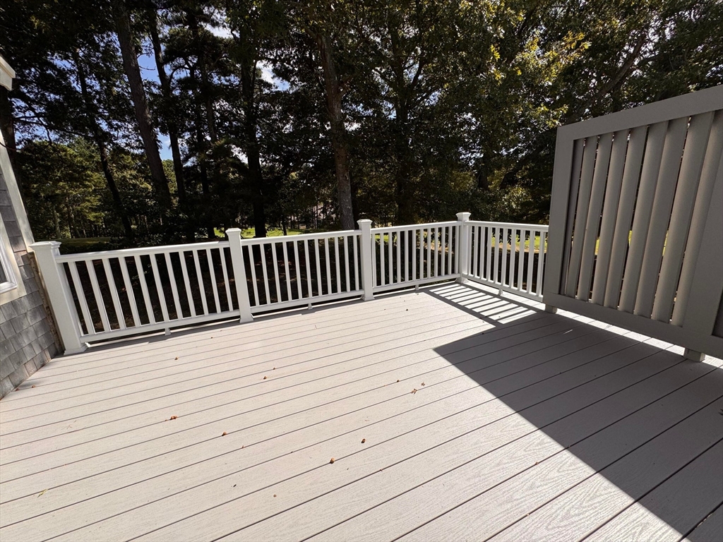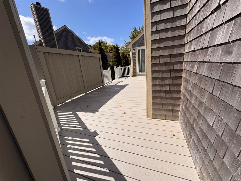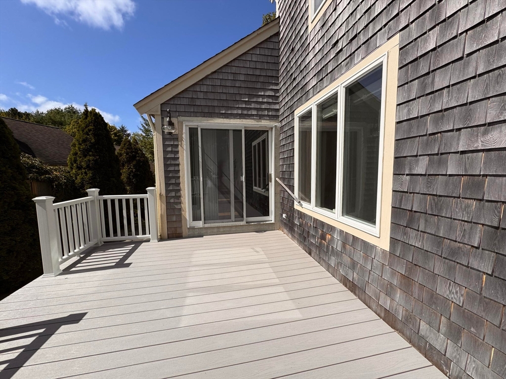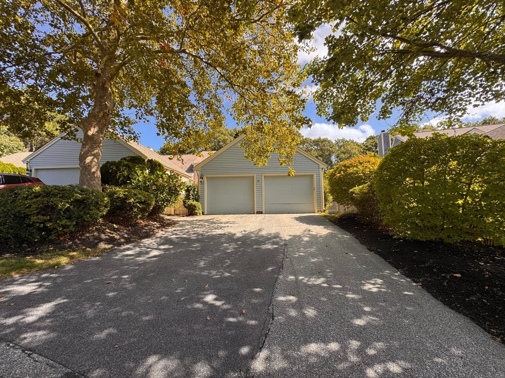 Welcome to one of Kings Way’s most desirable residences—an elegant “H” style end unit with 1,829 sq ft on a private cul-de-sac bordering conservation land. Among the community’s largest layouts and one of its newer buildings, it enjoys a premier location overlooking the 11th hole. A private courtyard leads to a light-filled open floor plan with cathedral ceilings, skylights, and floor-to-ceiling windows. The living room with gas fireplace flows to a kitchen with cherry cabinets, granite counters, updated appliances, pantry, and direct access to the oversized two-car garage with new doors. The first-floor primary suite is handicapped accessible, while a brand-new wraparound deck and patio extend the living space outdoors. Upstairs offers a second bedroom, full bath, and loft, with a walkout lower level and cedar storage ready to finish. With abundant closets, new carpet, and resort-style amenities, this rare offering combines comfort, style, and lifestyle at Kings Way