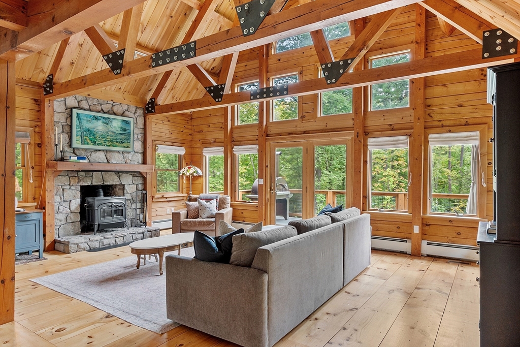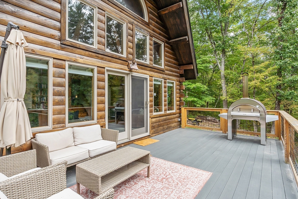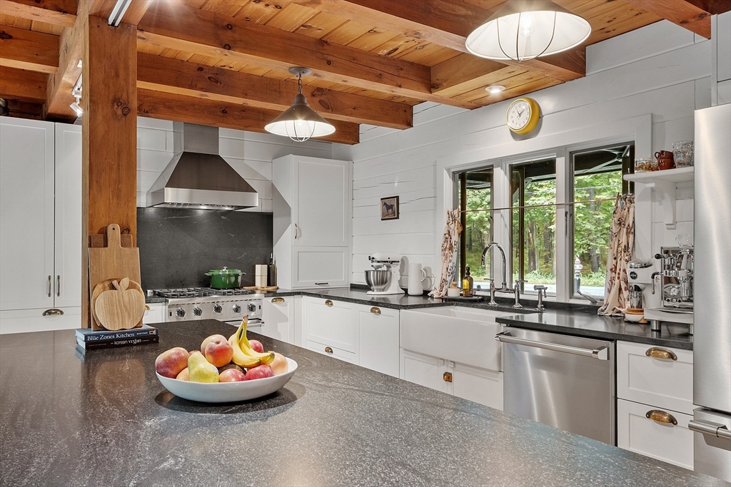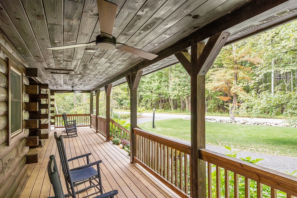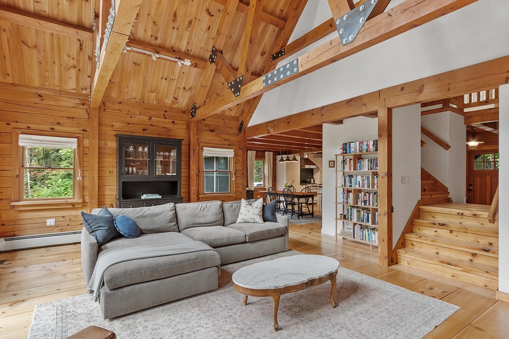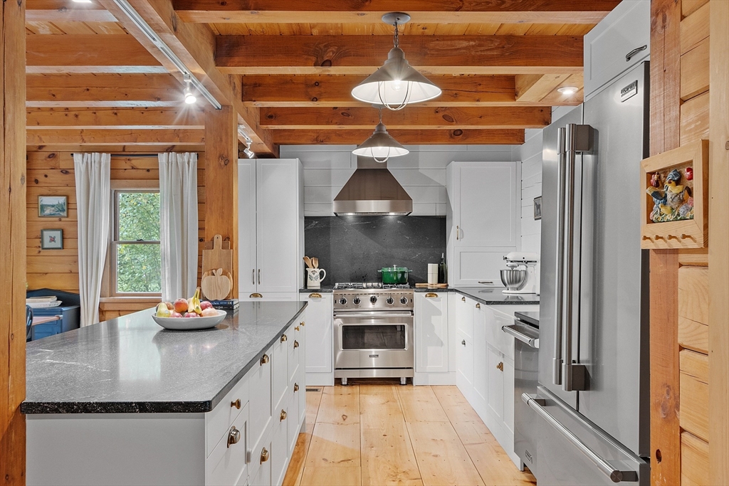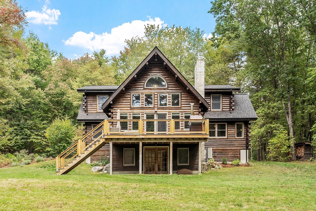 This beautifully reimagined post-and-beam log home offers timeless design with thoughtful modern enhancements. The striking kitchen features granite counters, a premium Viking oven and dishwasher, and blends seamlessly with the home’s natural charm. A spacious first-floor primary suite includes a luxurious bath with shower, double vanity, and quartz countertops. Upstairs, the full bath features elegant marble countertops. Refinished hardwood floors run throughout, and the dramatic log-beam living room is anchored by a cozy fireplace. The finished basement adds valuable living space with a home office and playroom. Enjoy the welcoming farmer’s porch or entertain on the back deck overlooking a peaceful yard. Extensive updates throughout, including a new roof and new water treatment system. Nestled on a scenic lot just a short walk from conservation trails and the Ryan playing fields, this home offers convenient access to major commuter routes and the highly rated Harvard school system.