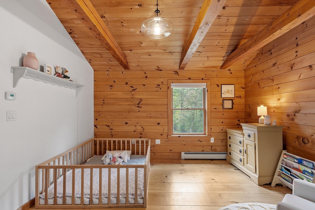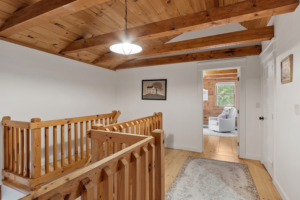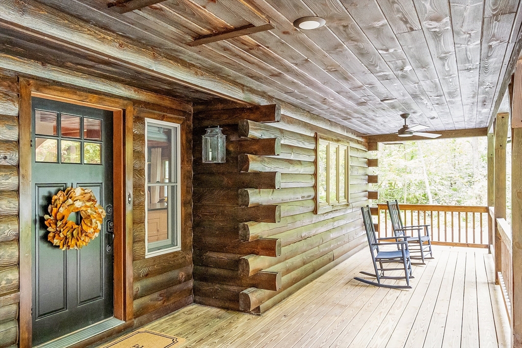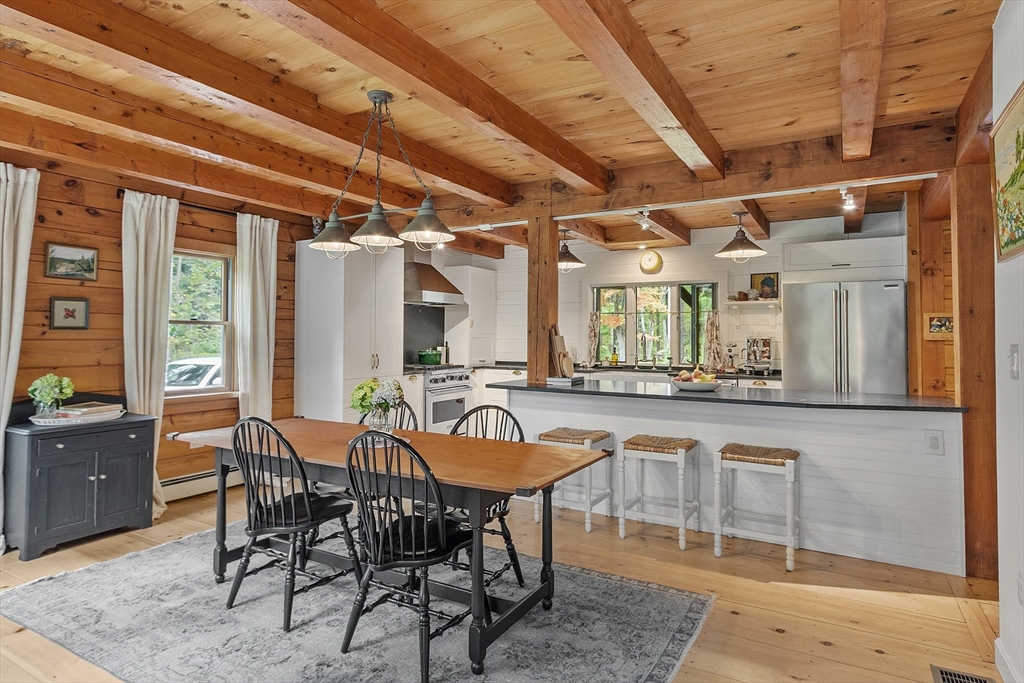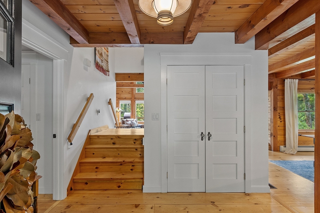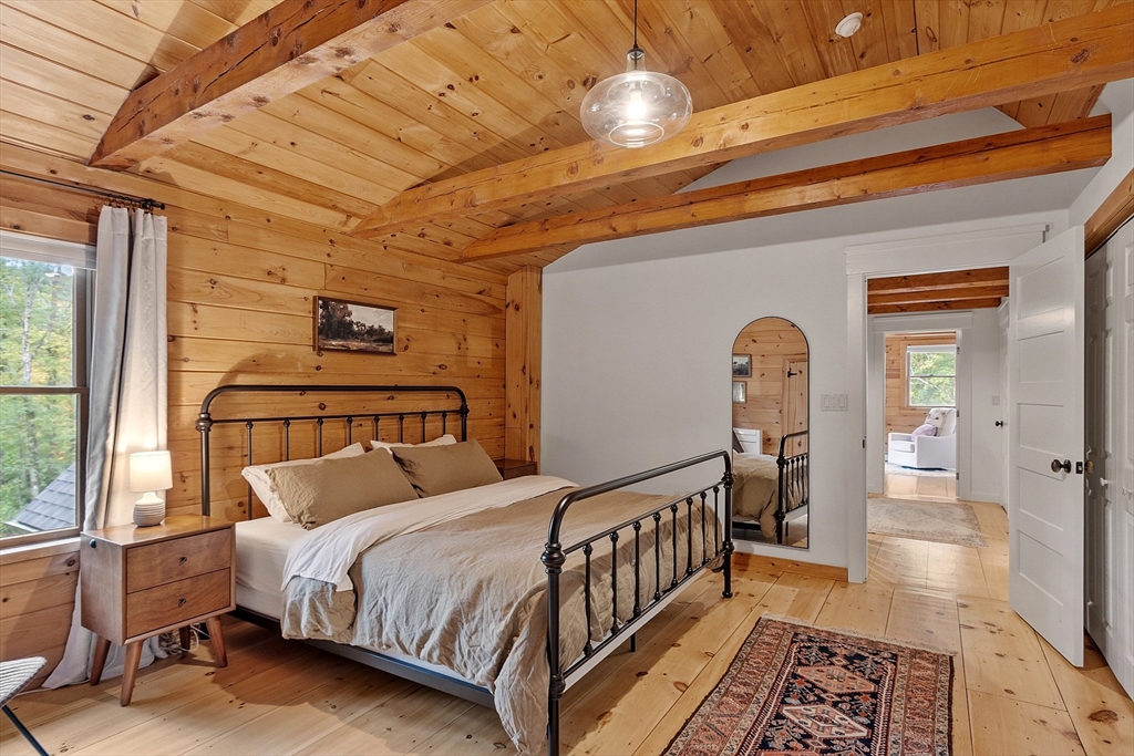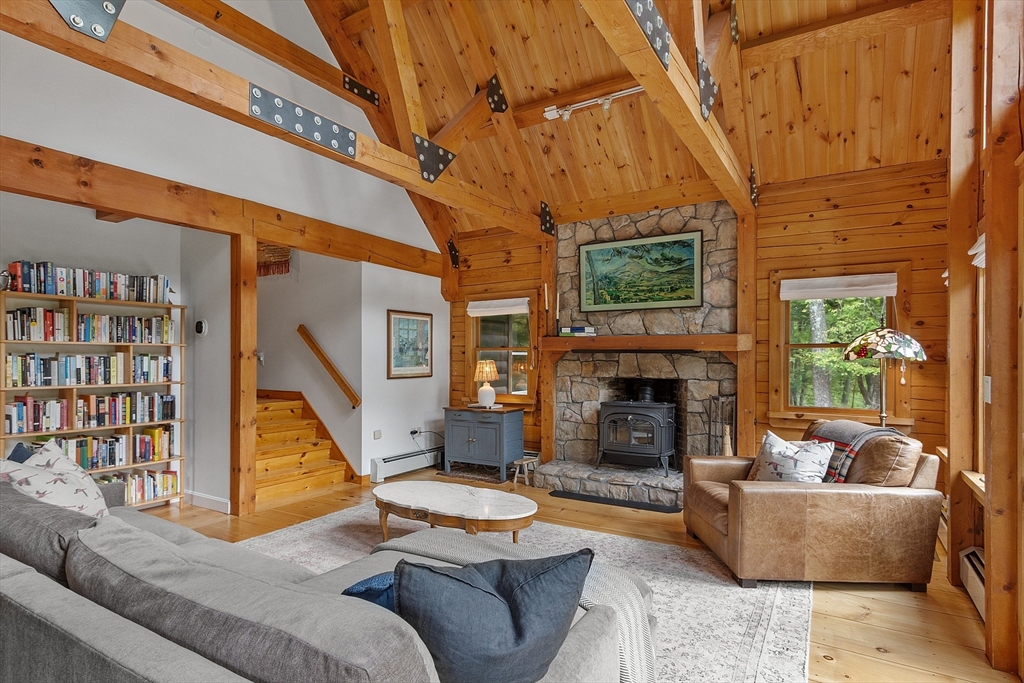 This beautifully reimagined post-and-beam log home offers timeless design with thoughtful modern enhancements. The striking kitchen features granite counters, a premium Viking oven and dishwasher, and blends seamlessly with the home’s natural charm. A spacious first-floor primary suite includes a luxurious bath with shower, double vanity, and quartz countertops. Upstairs, the full bath features elegant marble countertops. Refinished hardwood floors run throughout, and the dramatic log-beam living room is anchored by a cozy fireplace. The finished basement adds valuable living space with a home office and playroom. Enjoy the welcoming farmer’s porch or entertain on the back deck overlooking a peaceful yard. Extensive updates throughout, including a new roof and new water treatment system. Nestled on a scenic lot just a short walk from conservation trails and the Ryan playing fields, this home offers convenient access to major commuter routes and the highly rated Harvard school system.