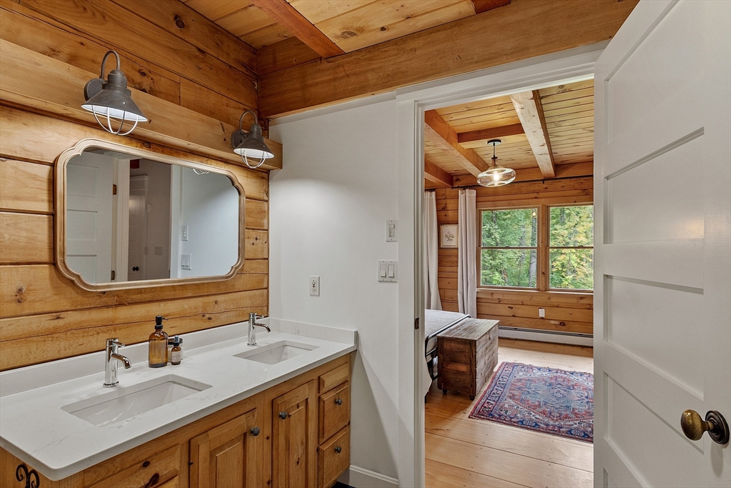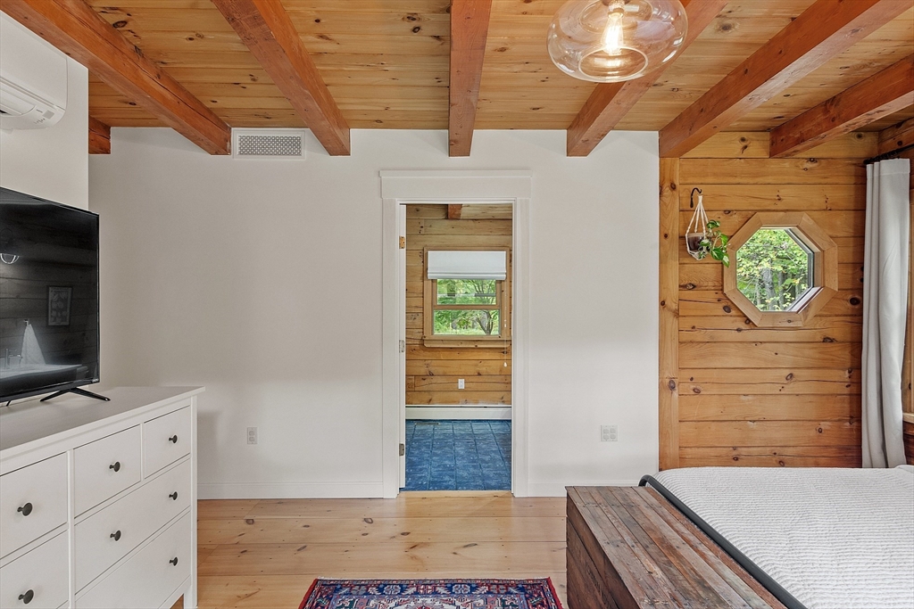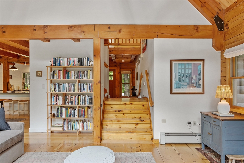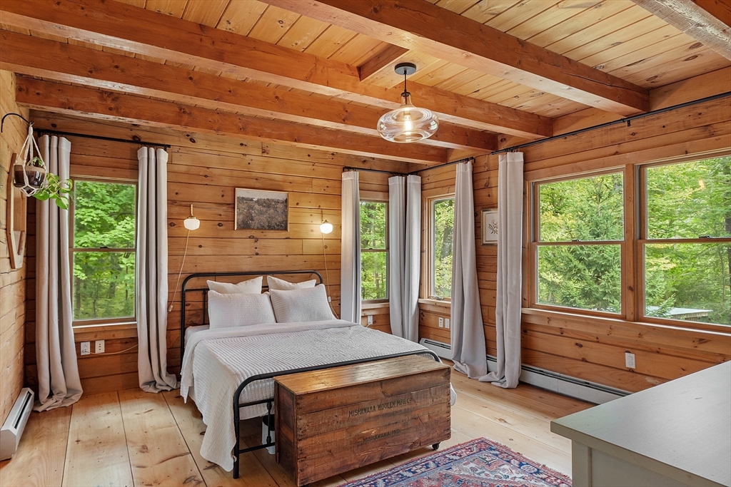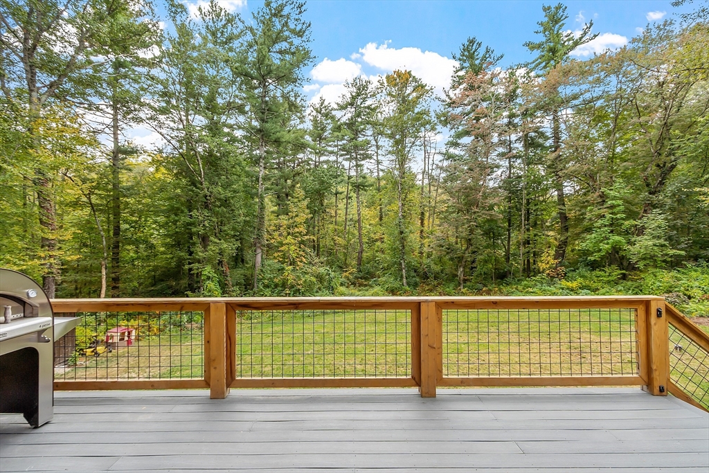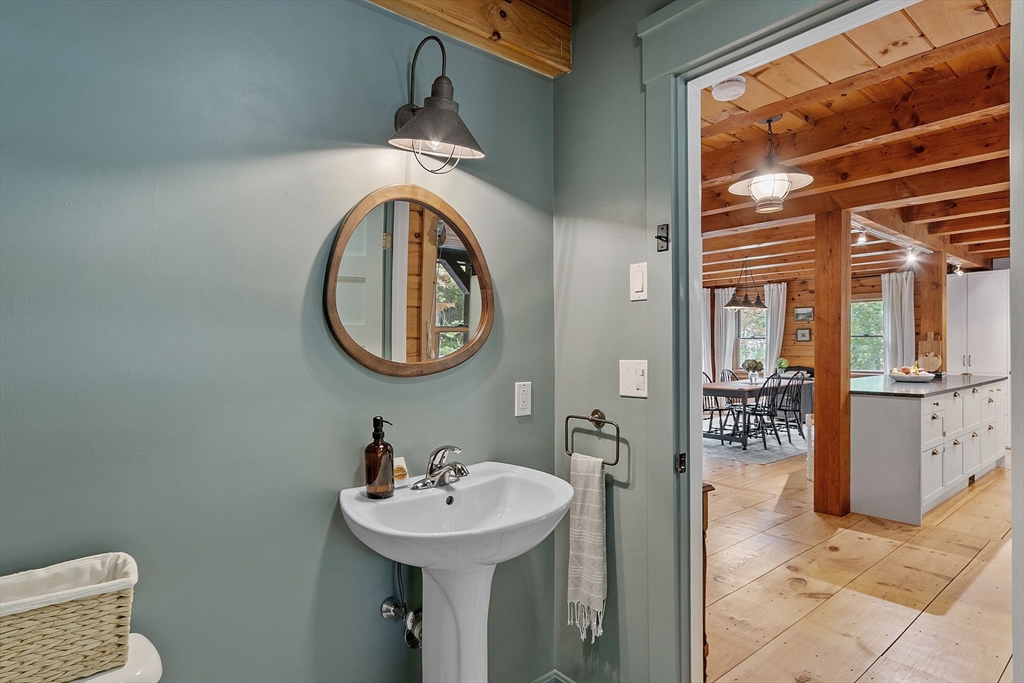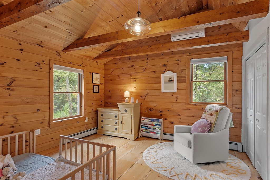 This beautifully reimagined post-and-beam log home offers timeless design with thoughtful modern enhancements. The striking kitchen features granite counters, a premium Viking oven and dishwasher, and blends seamlessly with the home’s natural charm. A spacious first-floor primary suite includes a luxurious bath with shower, double vanity, and quartz countertops. Upstairs, the full bath features elegant marble countertops. Refinished hardwood floors run throughout, and the dramatic log-beam living room is anchored by a cozy fireplace. The finished basement adds valuable living space with a home office and playroom. Enjoy the welcoming farmer’s porch or entertain on the back deck overlooking a peaceful yard. Extensive updates throughout, including a new roof and new water treatment system. Nestled on a scenic lot just a short walk from conservation trails and the Ryan playing fields, this home offers convenient access to major commuter routes and the highly rated Harvard school system.