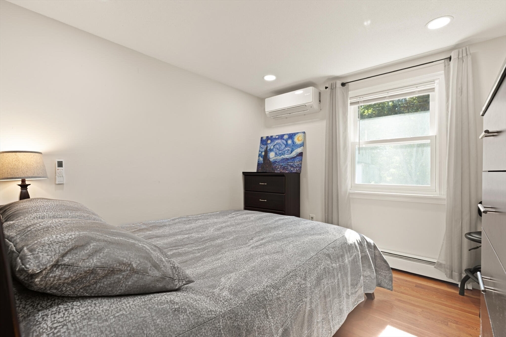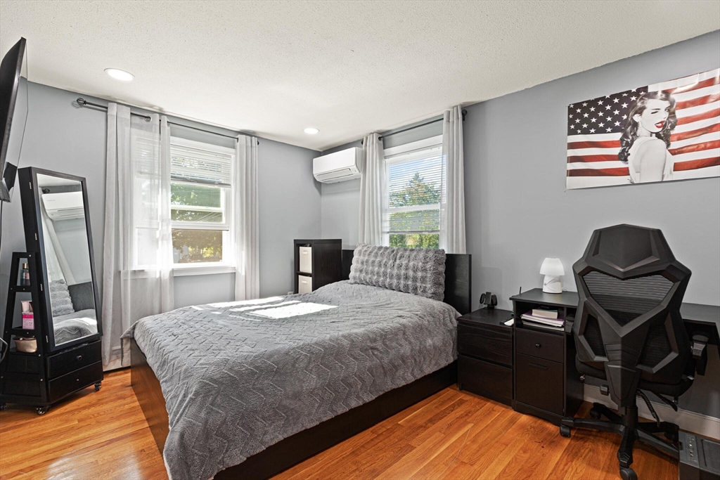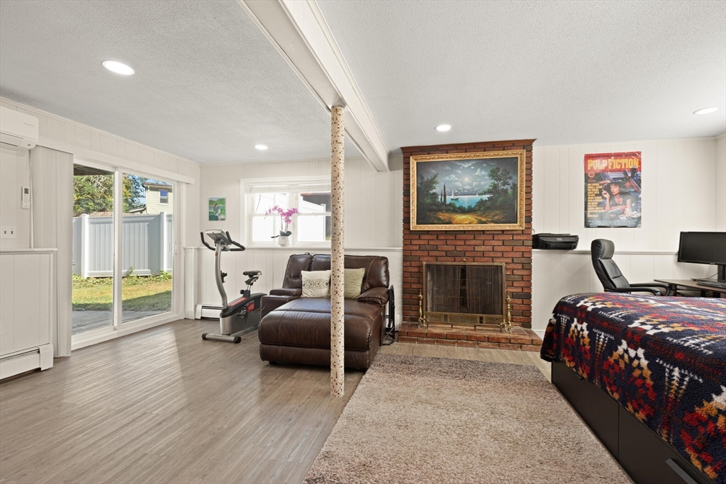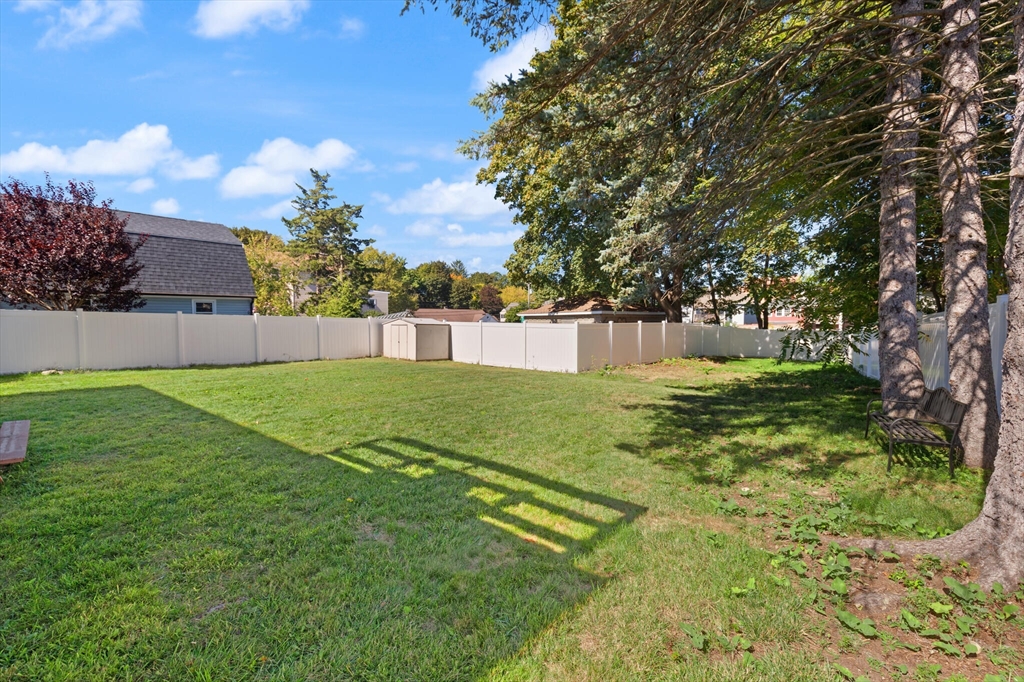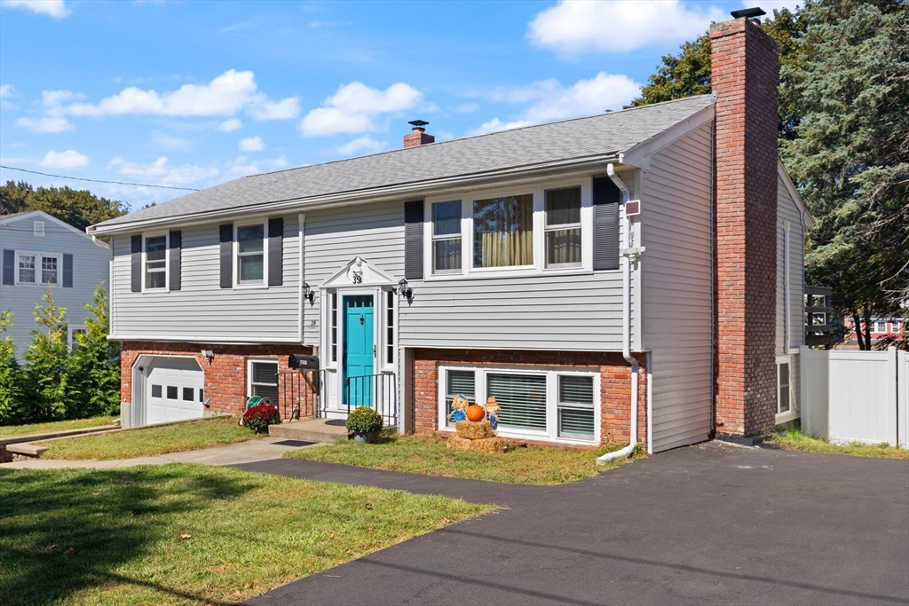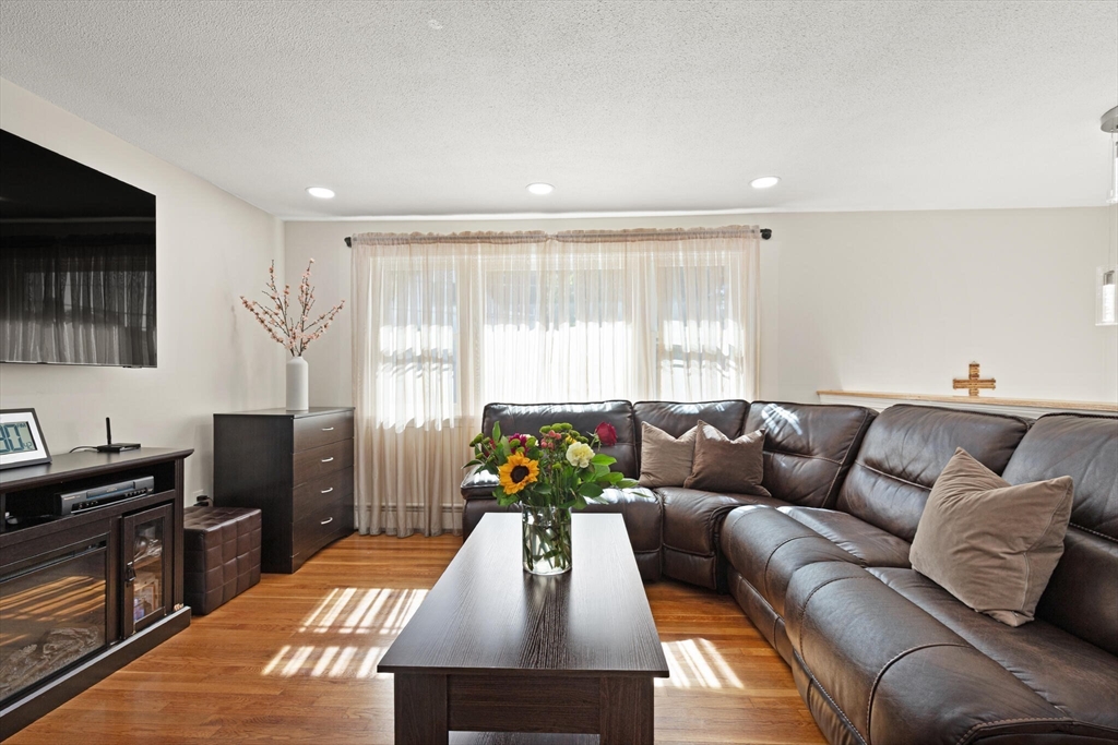 This sun-filled, well-maintained split-level home is move-in ready with 3 bedrooms and 2 full baths, 2 driveways. Hardwood floors span much of main level, where a brand-new kitchen w/sleek cabinetry, countertops, appliances (2025), and an oversized island that seats 8 comfortably, opens to the living room and deck—perfect for gatherings. The living room features a large picture window, filling the space with natural light. Down the hall are three comfortable bedrooms and a full bath with dual access. The walk-out lower level offers a front-to-back family room with fireplace, sliders to the fenced yard, a second full bath, and a spacious laundry room with cabinetry and granite countertops. Recent updates include roof (2023), windows, driveway, recessed lighting, sliding doors, and heat pump ( all 2025), plus a mini-split A/C (2025) and EV charger. Sited on a level 10,000 sq. ft. lot across from a park, and close to shopping/dining, a lake with beach, and the T for easy ride to Boston.