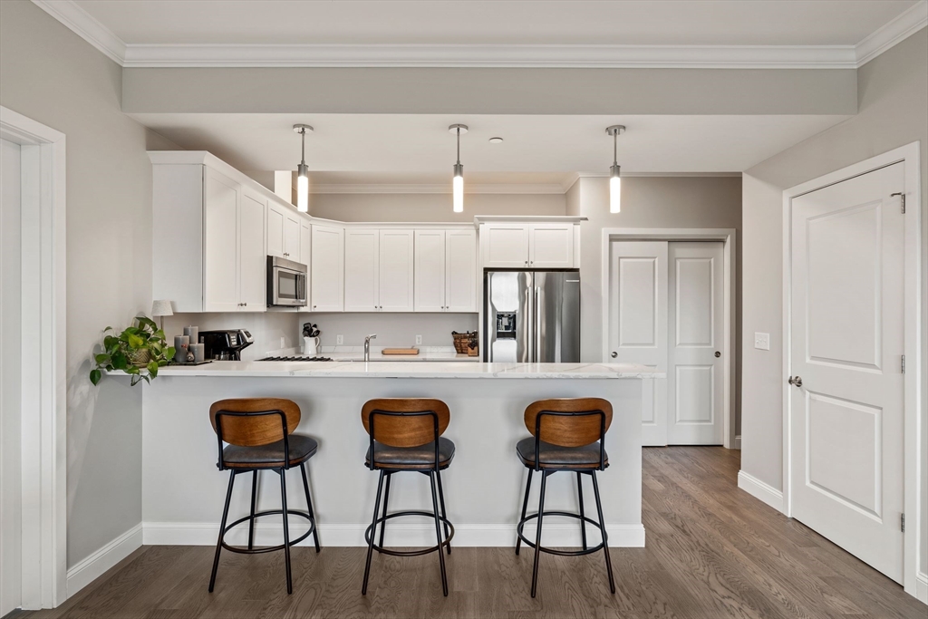 Riverside luxury living in a penthouse corner residence with 2 car garage parking! Discover effortless single-level comfort in this sun-splashed 2-bed/2-bath at Hendries at Central Station, a newly built 38-unit community in Milton’s historic Lower Mills.This thoughtfully designed home pairs modern finishes w/ timeless comfort, featuring 9-foot ceilings, expansive windows and an open floor plan ideal for entertaining. The chef’s kitchen showcases Bosch appliances, quartz counters & custom cabinetry. The private balcony offers a serene retreat with sweeping river views.The primary suite boasts a spacious walk-in closet, spa-inspired bath w/glass-enclosed shower & double sink vanity. A generous second bedroom provides excellent closet space w/flexibility for guests or home office. Enjoy the convenience of in-unit washer/dryer and sleek flooring. Steps to shops, dining and trails @ Neponset River Greenway. Incredibly convenient access to Boston