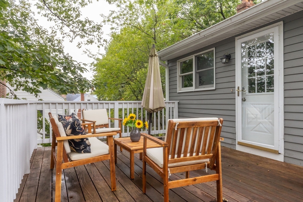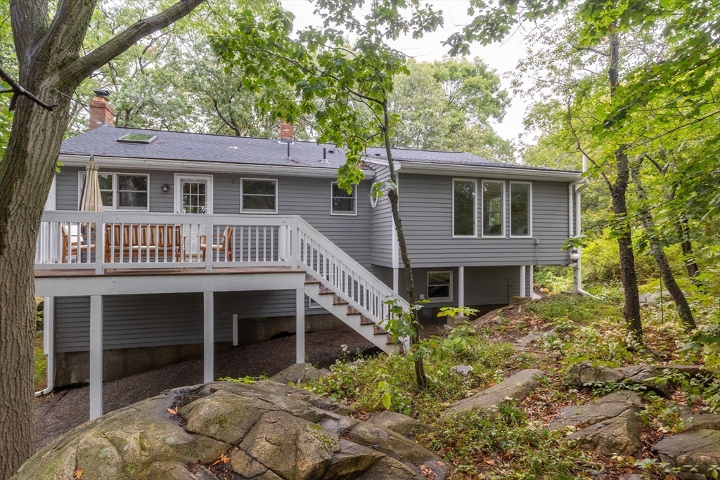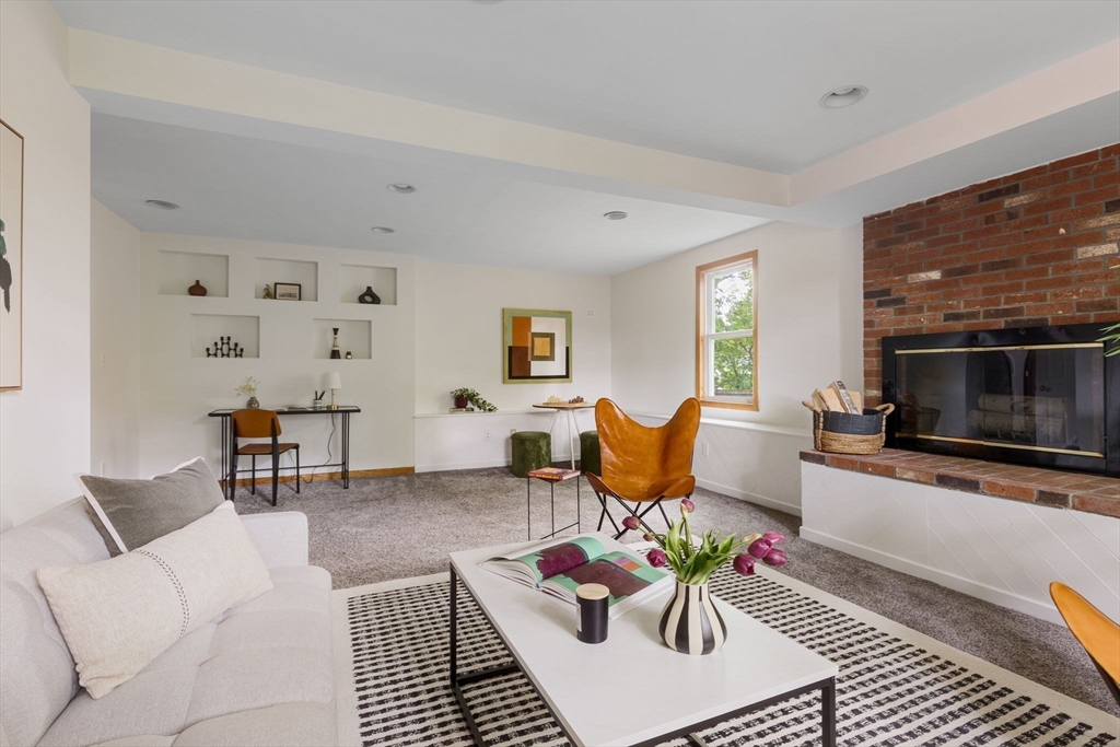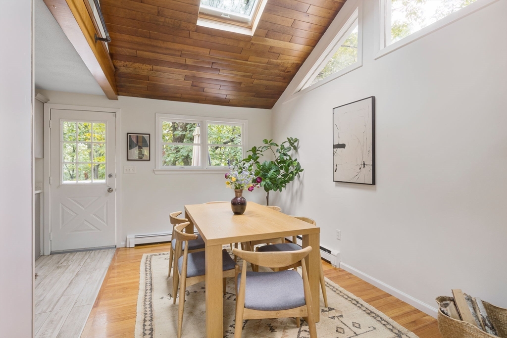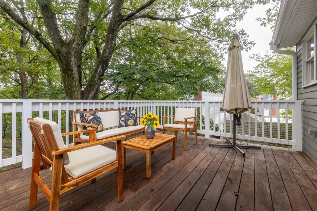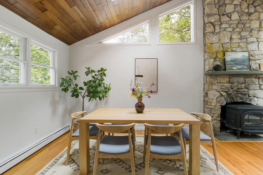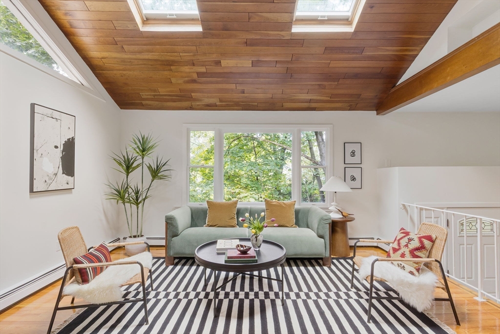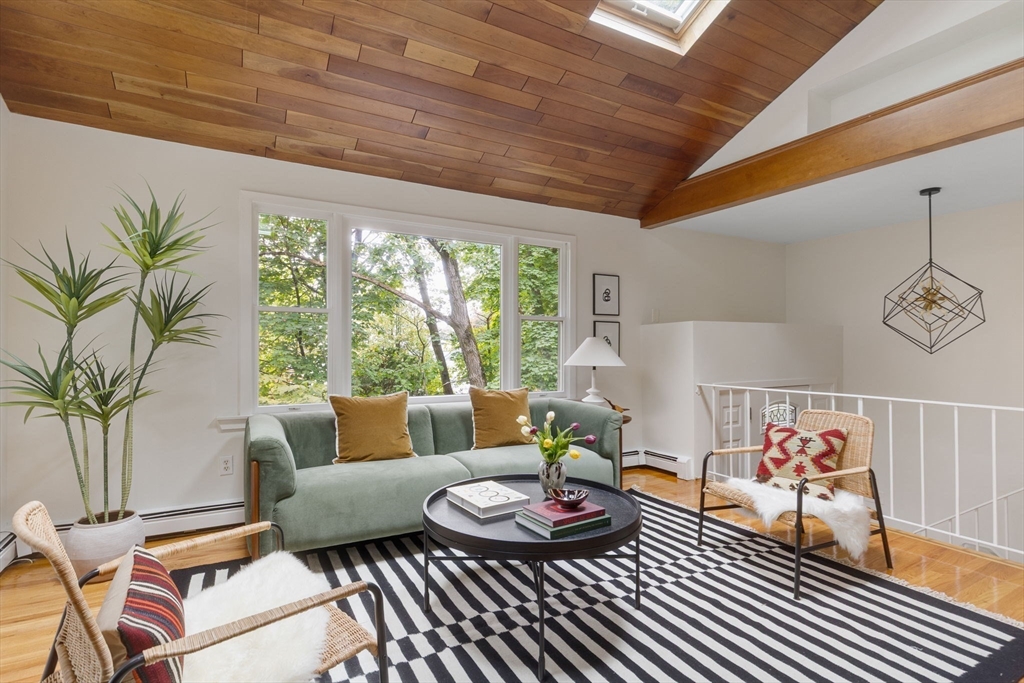 Tucked in serene Fulton Heights, this serene retreat offers 4 bedrooms and 2.5 bathrooms with mid-century flair, rustic charm, and modern updates. Vaulted wood-paneled ceilings, skylights, and walls of windows create a warm, airy setting filled with natural light. The open living, dining, and kitchen area features a stone fireplace, built-ins, and direct access to an expansive deck overlooking wooded views. The renovated kitchen boasts quartz counters, stainless steel appliances, and ample cabinetry. A full bathroom serves two spacious bedrooms, while the large ensuite primary offers a spa-like bathroom, glorious windows, generous closets, and a sitting area. The lower level adds versatility with a second fireplace, half bathroom, laundry, and garage access—perfect as a family room, guest suite, or office. Just minutes to Medford Square, Wright’s Pond, Middlesex Fells, and I-93, with Boston under 15 minutes away, this treehouse-like home offers the best of tranquility and convenience.