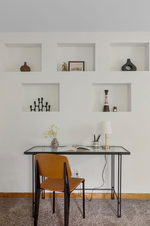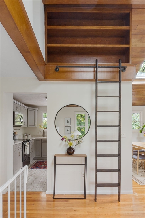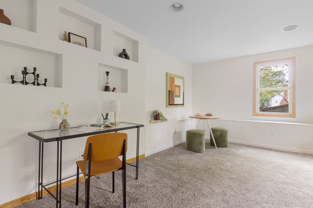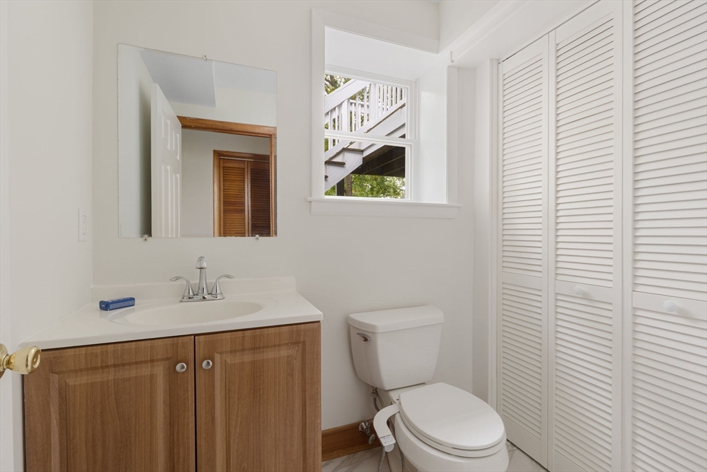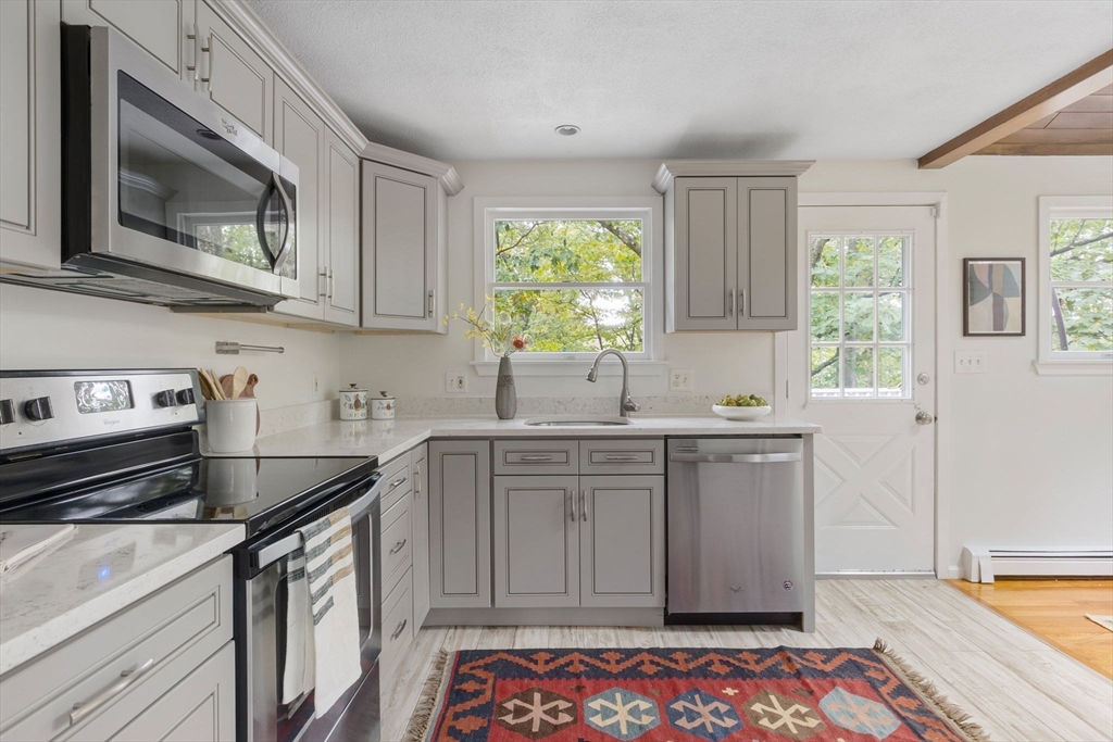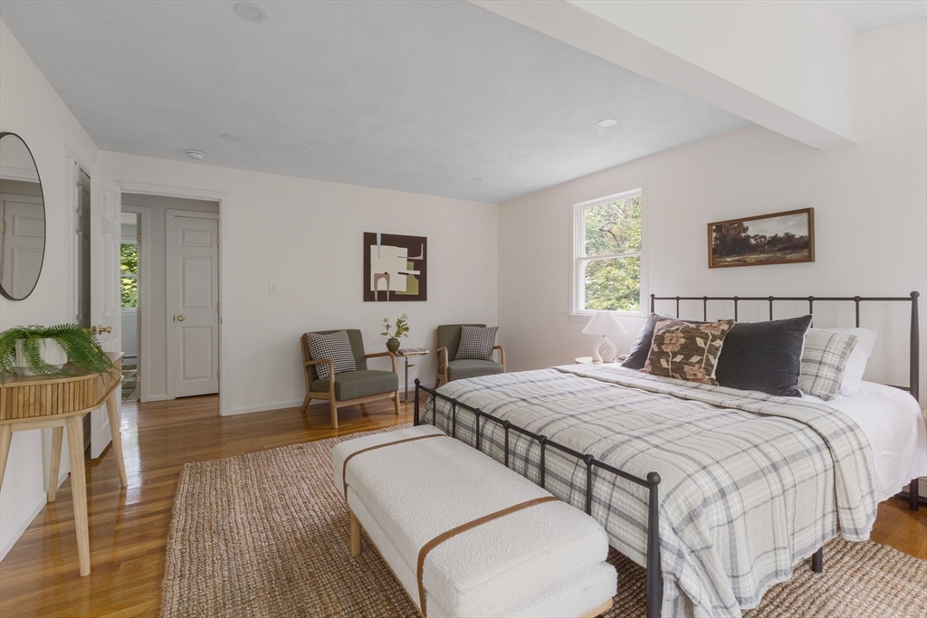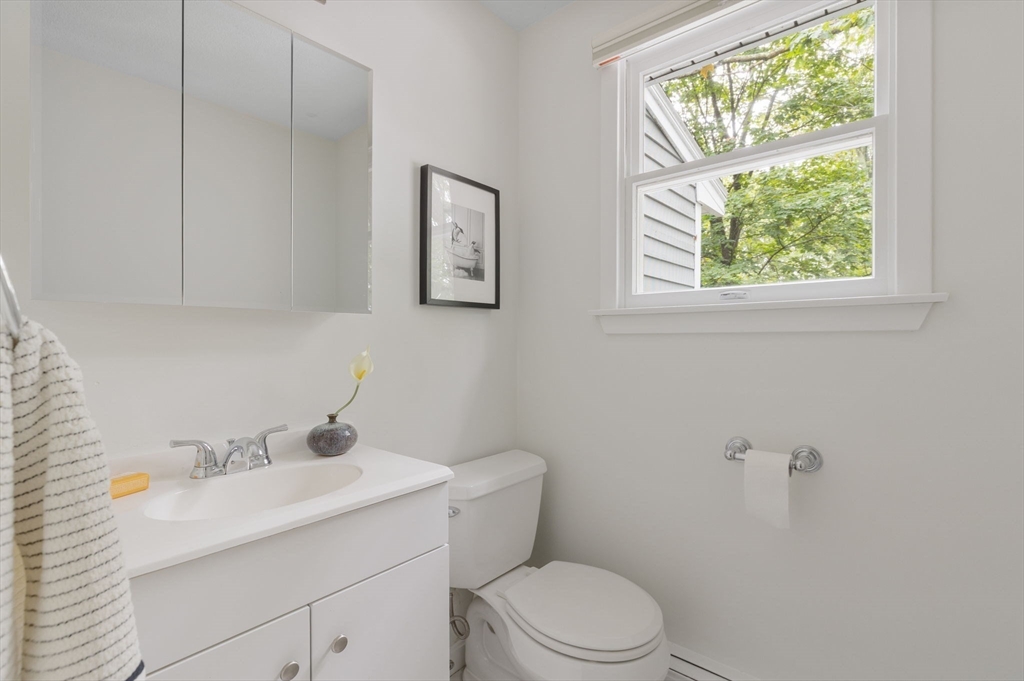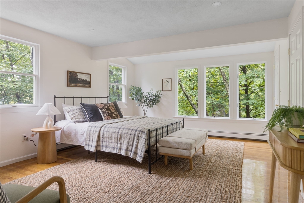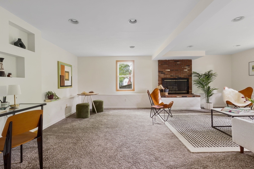 Tucked in serene Fulton Heights, this serene retreat offers 4 bedrooms and 2.5 bathrooms with mid-century flair, rustic charm, and modern updates. Vaulted wood-paneled ceilings, skylights, and walls of windows create a warm, airy setting filled with natural light. The open living, dining, and kitchen area features a stone fireplace, built-ins, and direct access to an expansive deck overlooking wooded views. The renovated kitchen boasts quartz counters, stainless steel appliances, and ample cabinetry. A full bathroom serves two spacious bedrooms, while the large ensuite primary offers a spa-like bathroom, glorious windows, generous closets, and a sitting area. The lower level adds versatility with a second fireplace, half bathroom, laundry, and garage access—perfect as a family room, guest suite, or office. Just minutes to Medford Square, Wright’s Pond, Middlesex Fells, and I-93, with Boston under 15 minutes away, this treehouse-like home offers the best of tranquility and convenience.