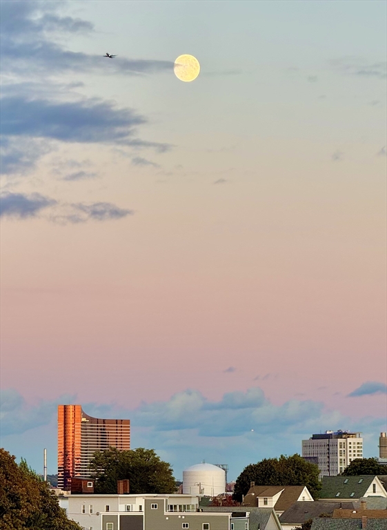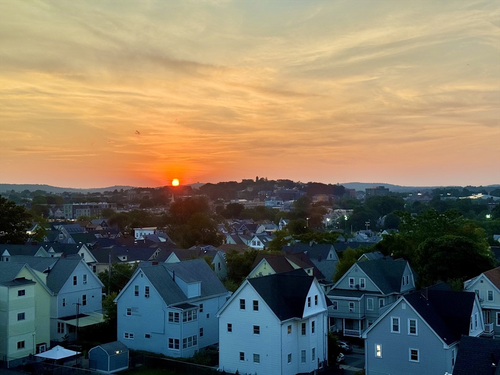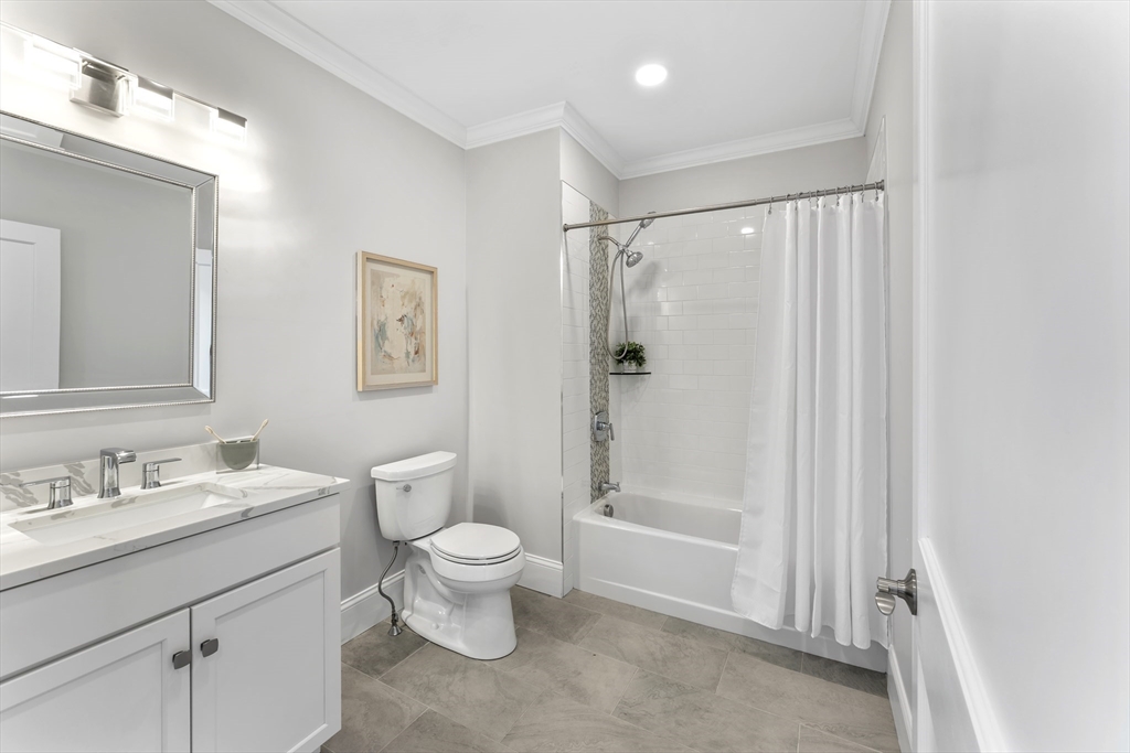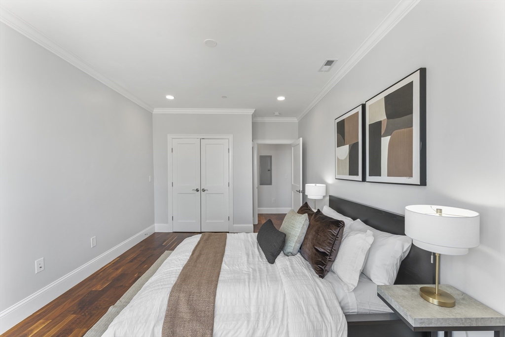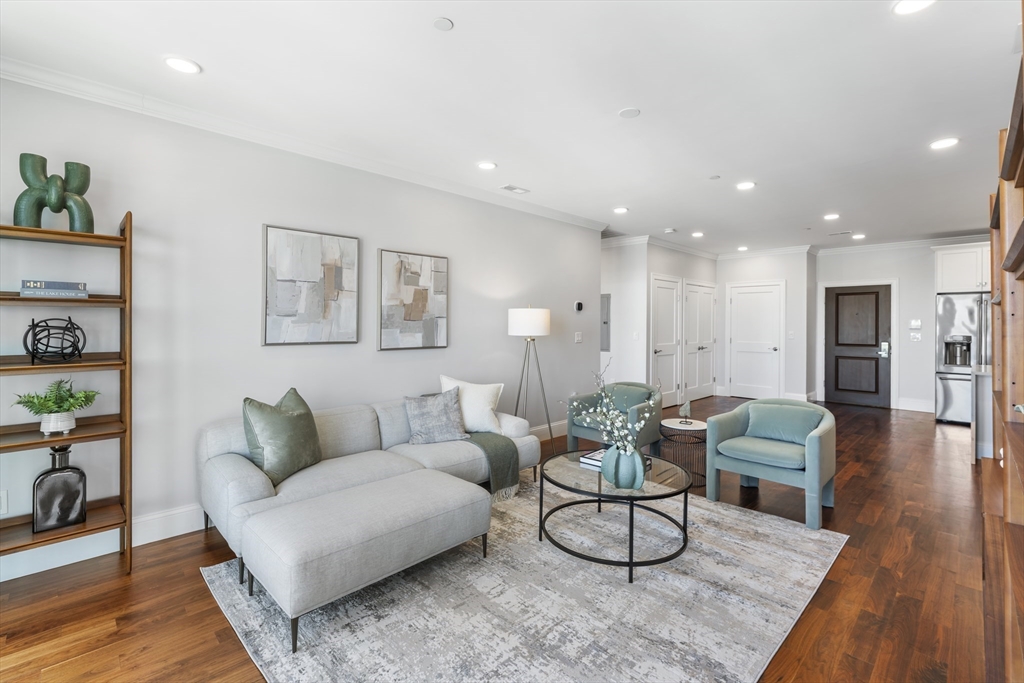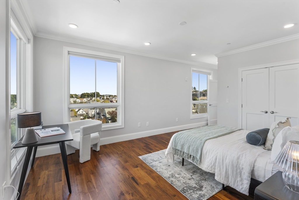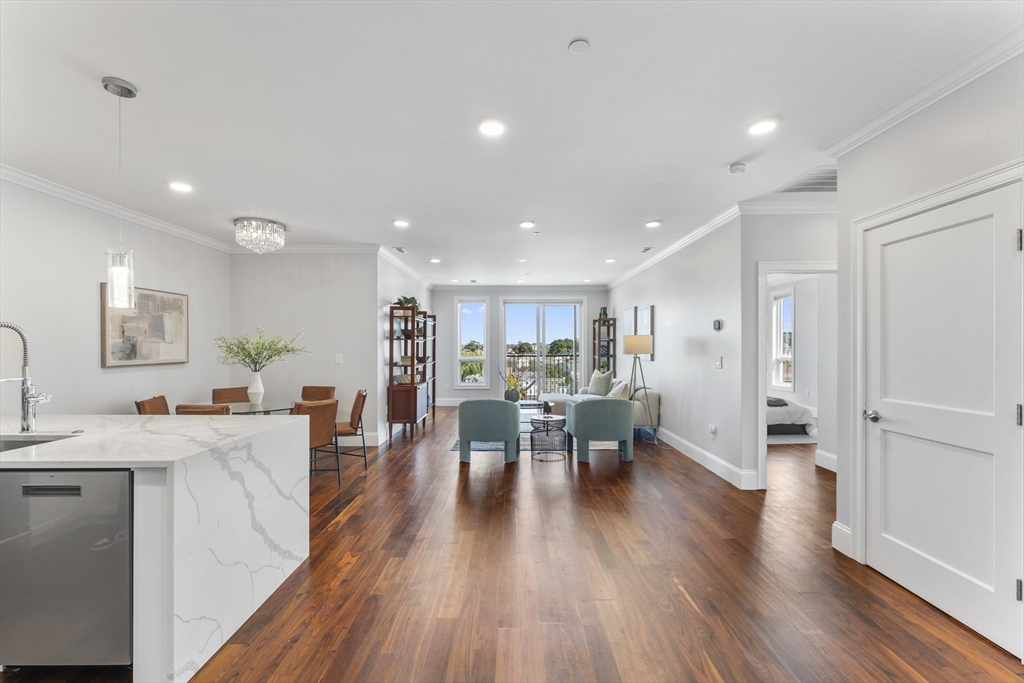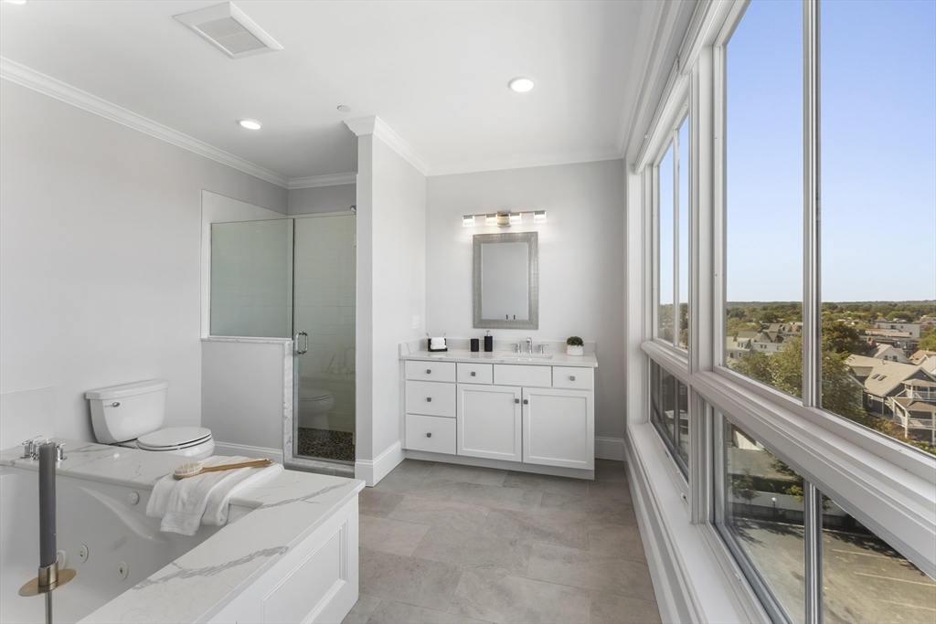 Penthouse luxury living on the Medford/Somerville line! This 1,369 sq ft corner unit offers 2 garage parking spots, private roof deck, and storage in a 2020 elevator building with premium amenities: gym, movie theater, co-working space, and rooftop clubhouse with kitchen and city views. The open-concept layout features hardwood floors, recessed lighting, high ceilings, and a spacious living room with large windows and Juliet balcony. Chef’s kitchen includes GE Café stainless appliances, quartz countertops, white shaker cabinetry, and waterfall peninsula. The primary suite boasts a walk-in closet and spa-like bath with frameless glass shower and whirlpool tub. Central A/C, tankless water heater, and in-unit laundry included. Enjoy easy access to Ball Square Green Line T, Somerville dining, and major highways.