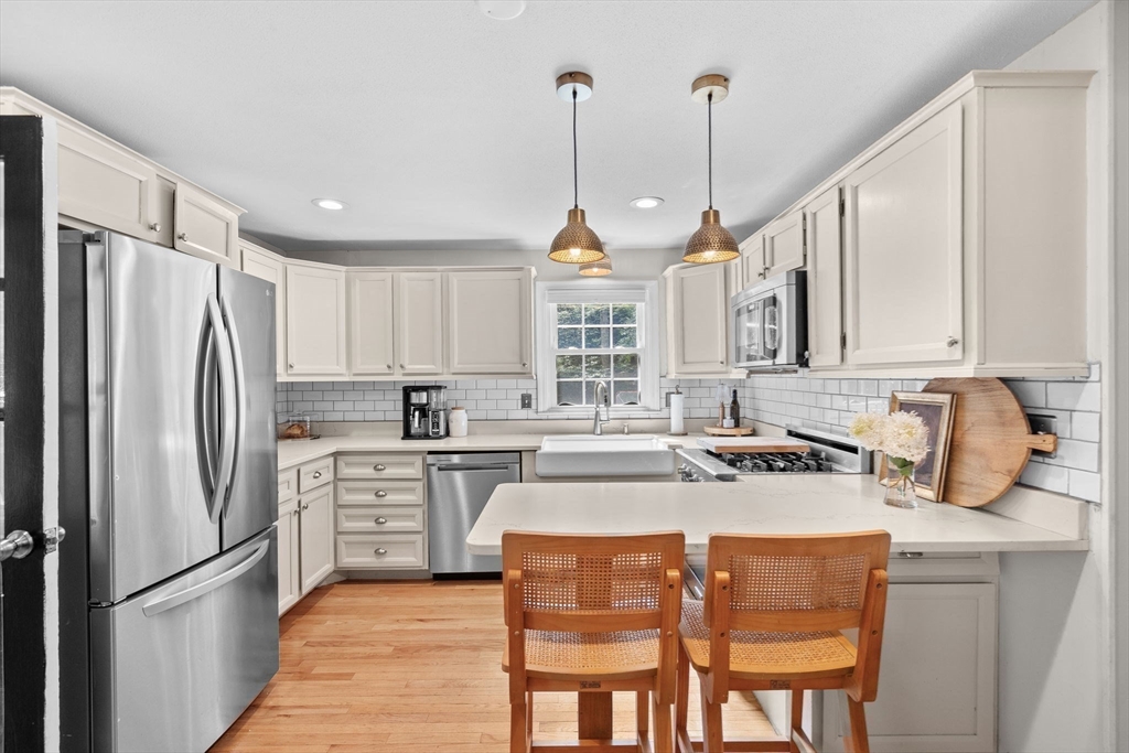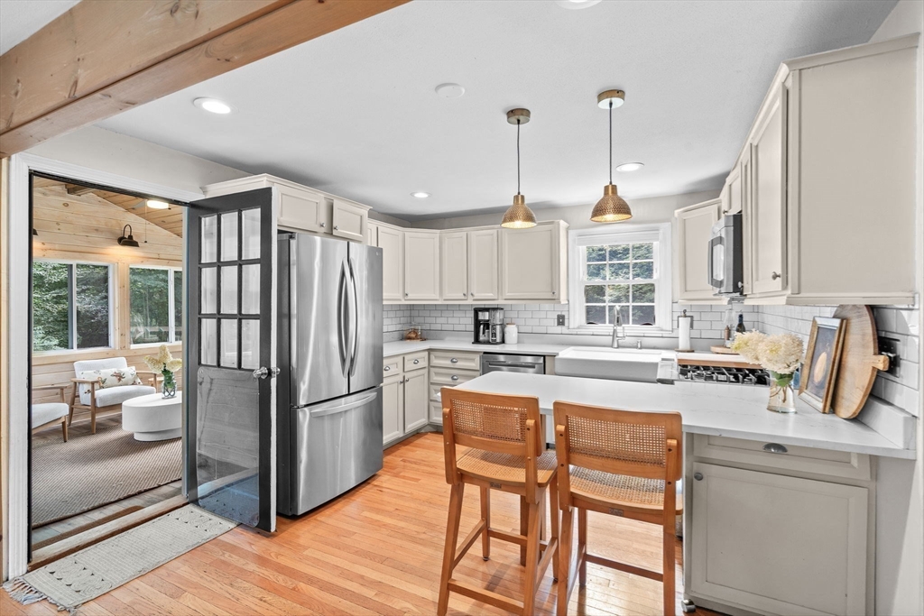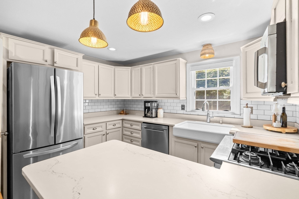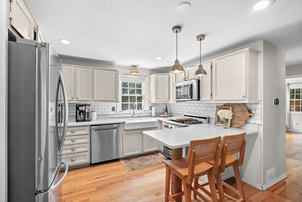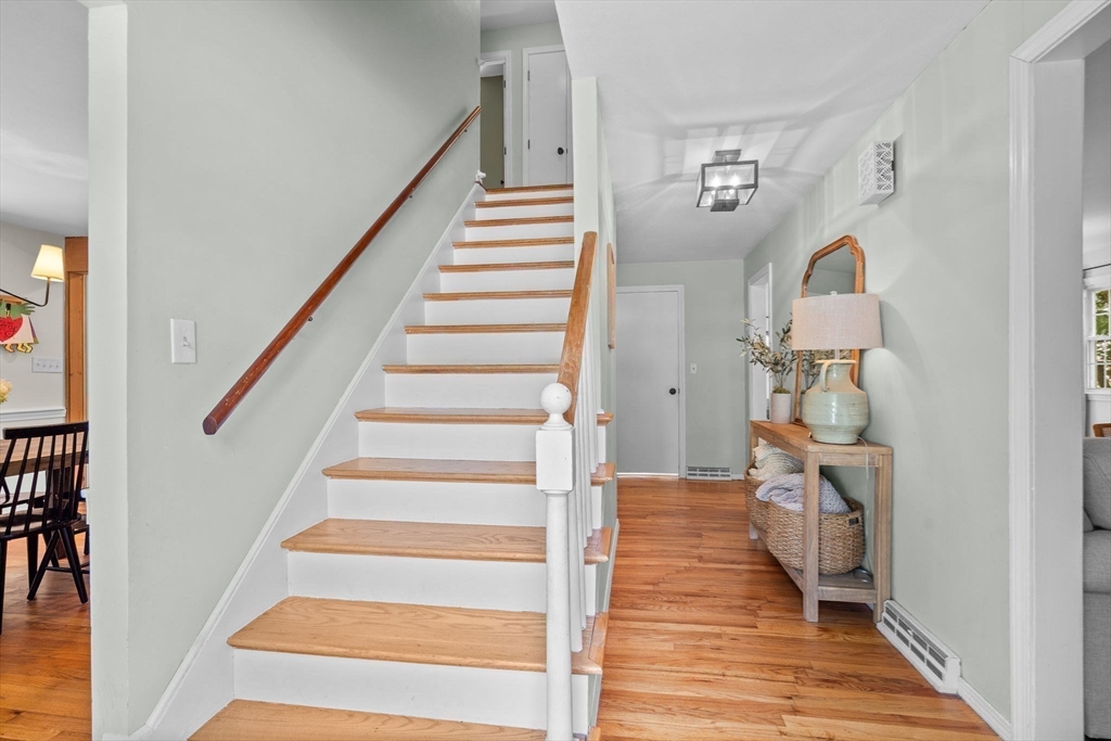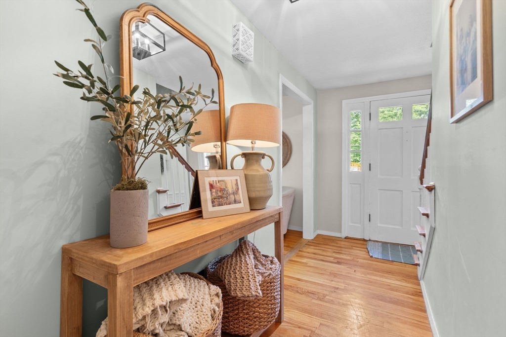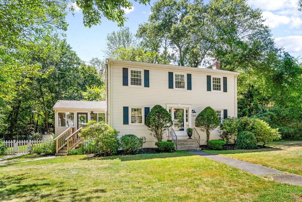 Beautifully updated Colonial in desirable Stagecoach neighborhood! Gleaming hardwood floors throughout main and second floors. Updated kitchen features white cabinetry, stainless steel appliances, quartz counters, subway tile backsplash, and gas stove—all with farmhouse chic style. Front-to-back living room is perfect for entertaining. Upstairs offers four spacious bedrooms and full bath. Enjoy your morning coffee in the charming three-season room, accessed from the new front porch, while overlooking the fully fenced backyard — ideal for pets, play, or quiet evenings. Major updates include 4-bedroom septic (2017), mass save insulation (2022), central air (2023), furnace (2024), and 200-amp electrical (2025). Truly move-in ready, this home offers comfort, style, and peace of mind — all in a community known for Charles River Rail Trail, Lake Winthrop, Warren Woods, Traditional/French/Montessori schools and quaint downtown. Don’t miss your chance to make this Holliston gem your own!