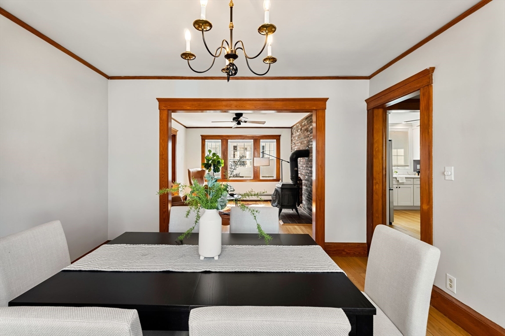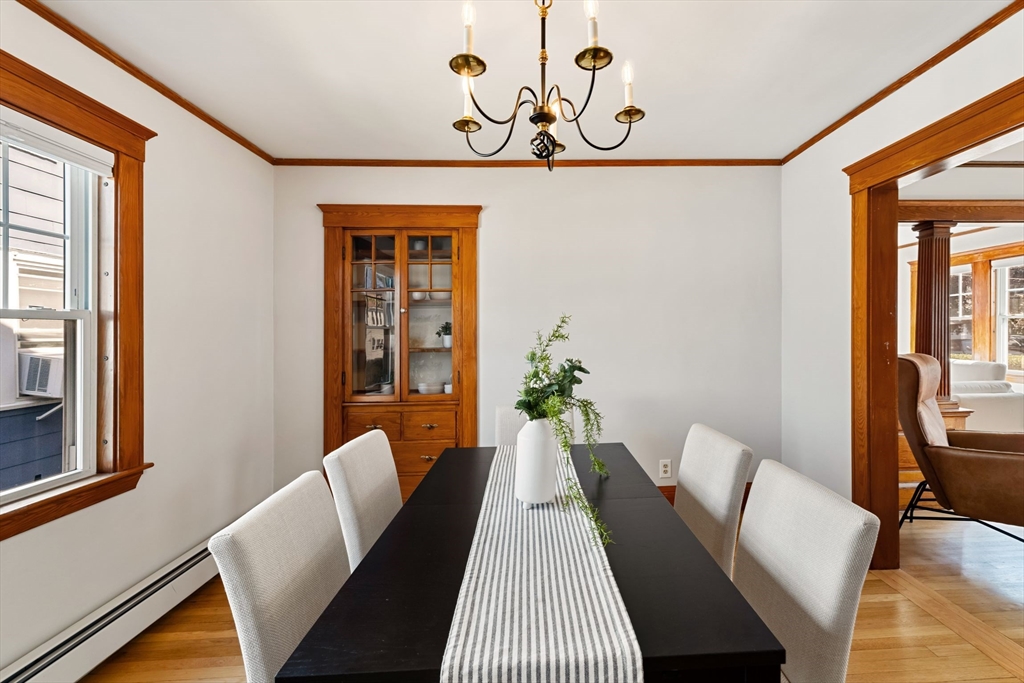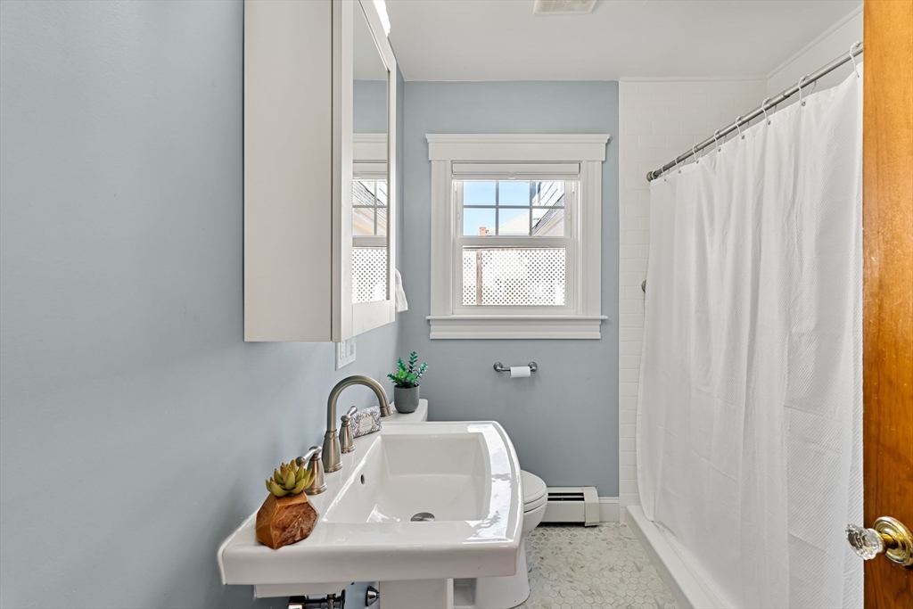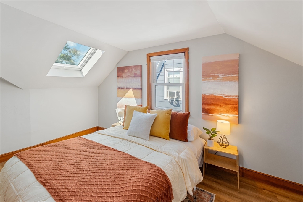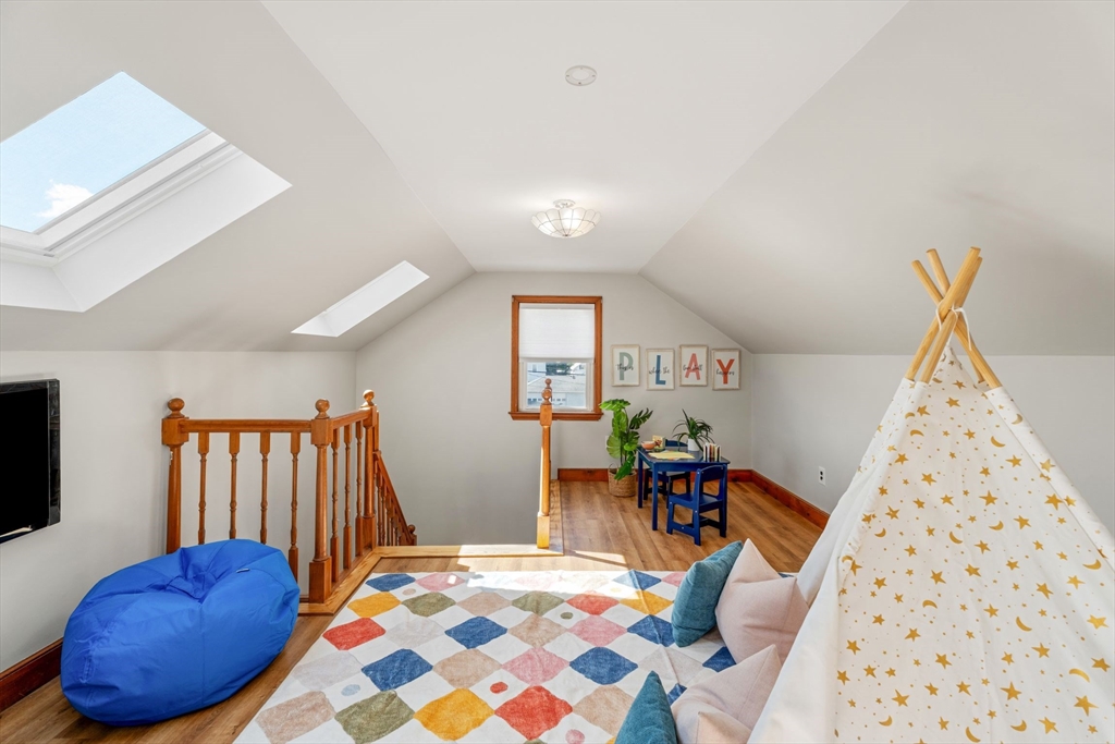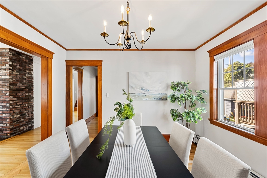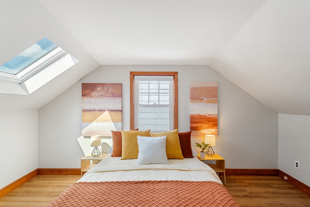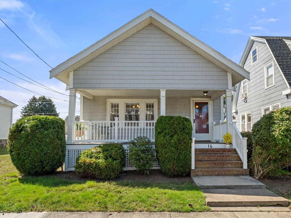 Charming Emerson Park home on quiet, dead end, tree-lined street. 16 Ethel Ave blends modern finishes & timeless character, creating a comfortable, inviting home w/ spacious rooms & optimal floor plan. Newly renovated farmers porch provides warm welcome for relaxation & entertainment, & leads into front entry, complete w/ coat closet & double doors to sunny living room. Adjacent dining room & fully renovated kitchen w/ quartz counters & stainless steel appliances. Also on this floor is a spacious bedroom & extra den area, plus completely renovated bathroom & laundry room. 2 additional bedroom areas upstairs, plus play room area & loads of storage. Full basement for additional storage & shop area, w/ walkout bulkead. Detached garage accessed off Palmer Avenue. New roof and electrical panel (2023) & HW heater (2024). Close to the vibrant shops & restaurants in downtown Peabody. Walkable to Center Elementary and Higgins Middle School. Super easy access to 128 and 95.