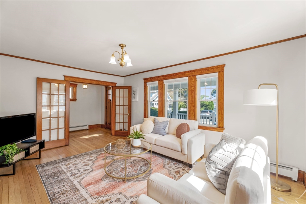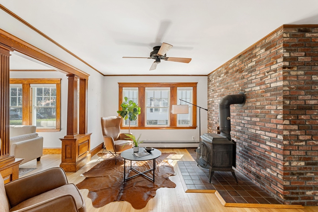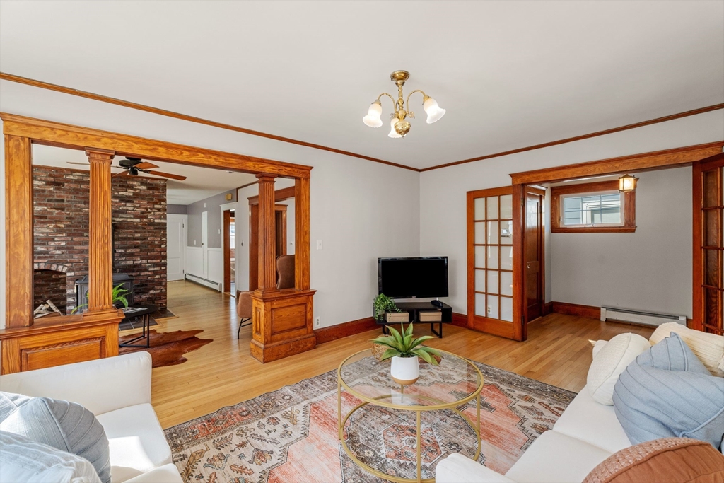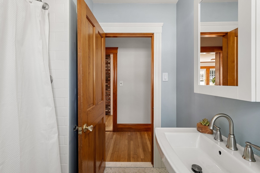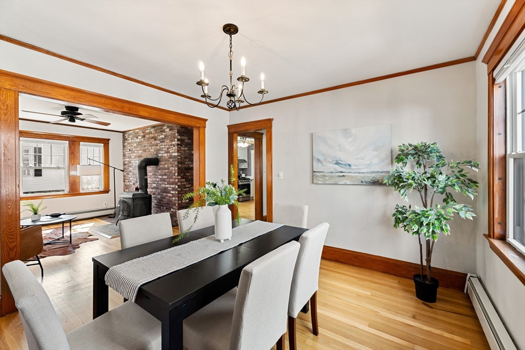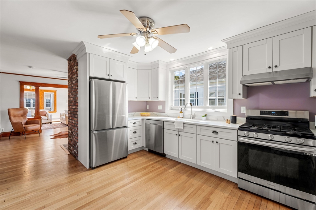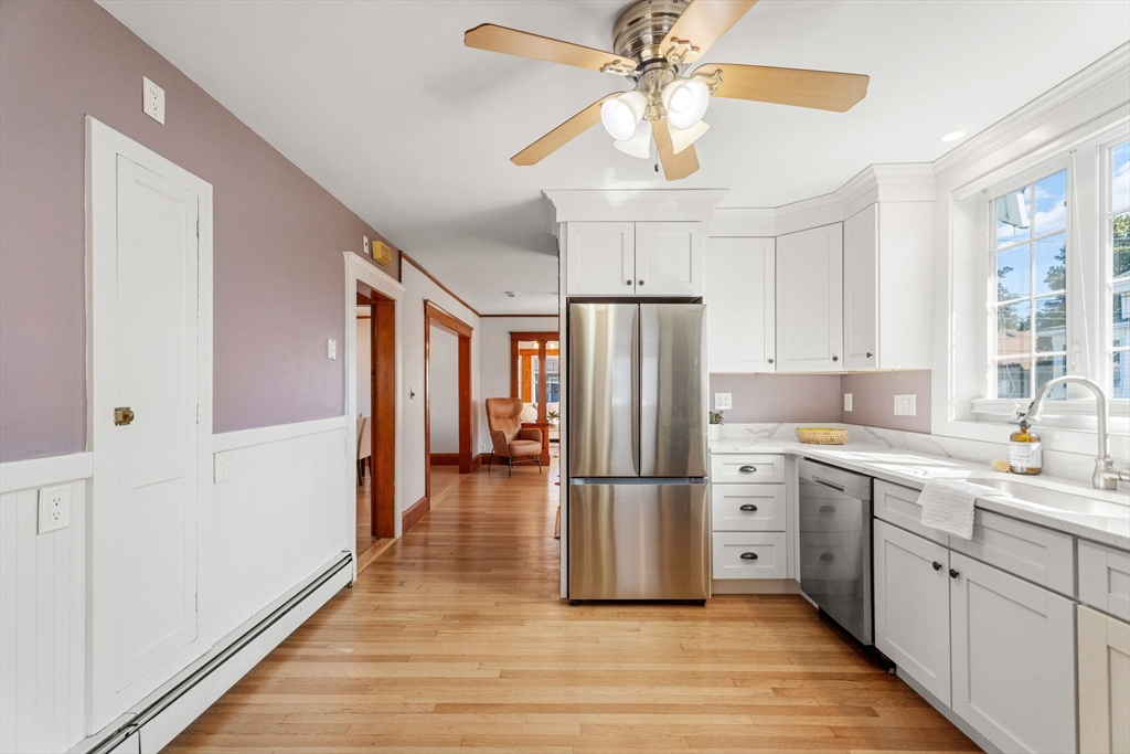 Charming Emerson Park home on quiet, dead end, tree-lined street. 16 Ethel Ave blends modern finishes & timeless character, creating a comfortable, inviting home w/ spacious rooms & optimal floor plan. Newly renovated farmers porch provides warm welcome for relaxation & entertainment, & leads into front entry, complete w/ coat closet & double doors to sunny living room. Adjacent dining room & fully renovated kitchen w/ quartz counters & stainless steel appliances. Also on this floor is a spacious bedroom & extra den area, plus completely renovated bathroom & laundry room. 2 additional bedroom areas upstairs, plus play room area & loads of storage. Full basement for additional storage & shop area, w/ walkout bulkead. Detached garage accessed off Palmer Avenue. New roof and electrical panel (2023) & HW heater (2024). Close to the vibrant shops & restaurants in downtown Peabody. Walkable to Center Elementary and Higgins Middle School. Super easy access to 128 and 95.