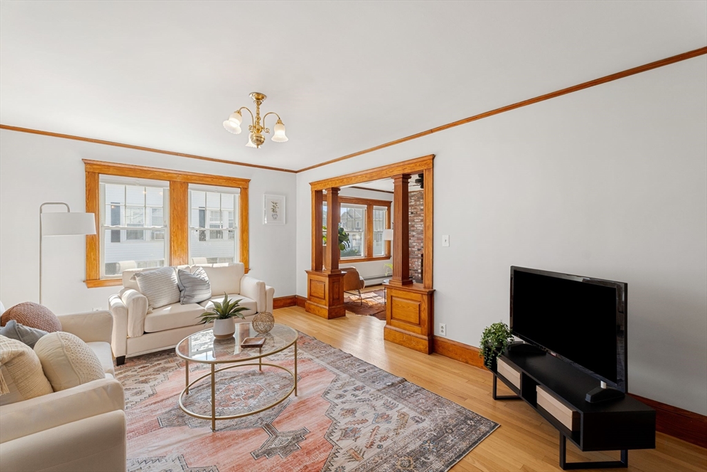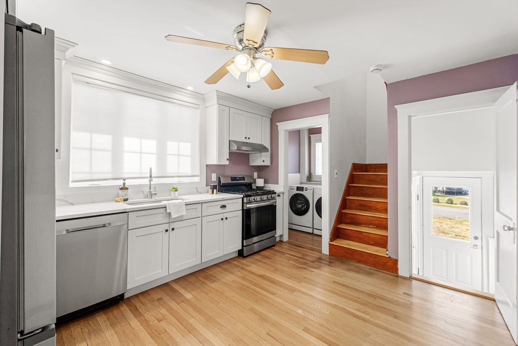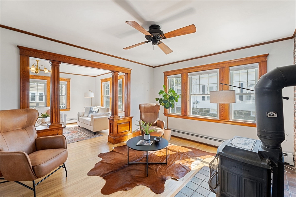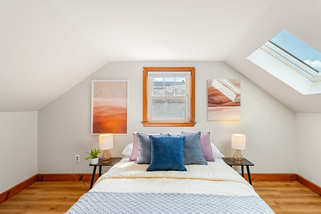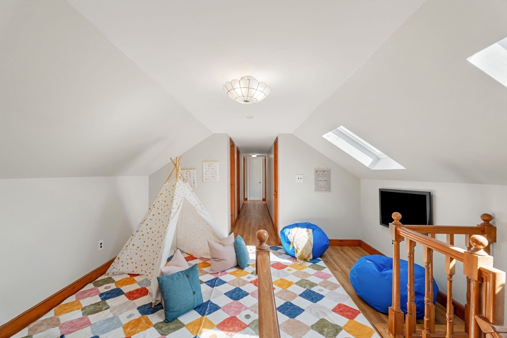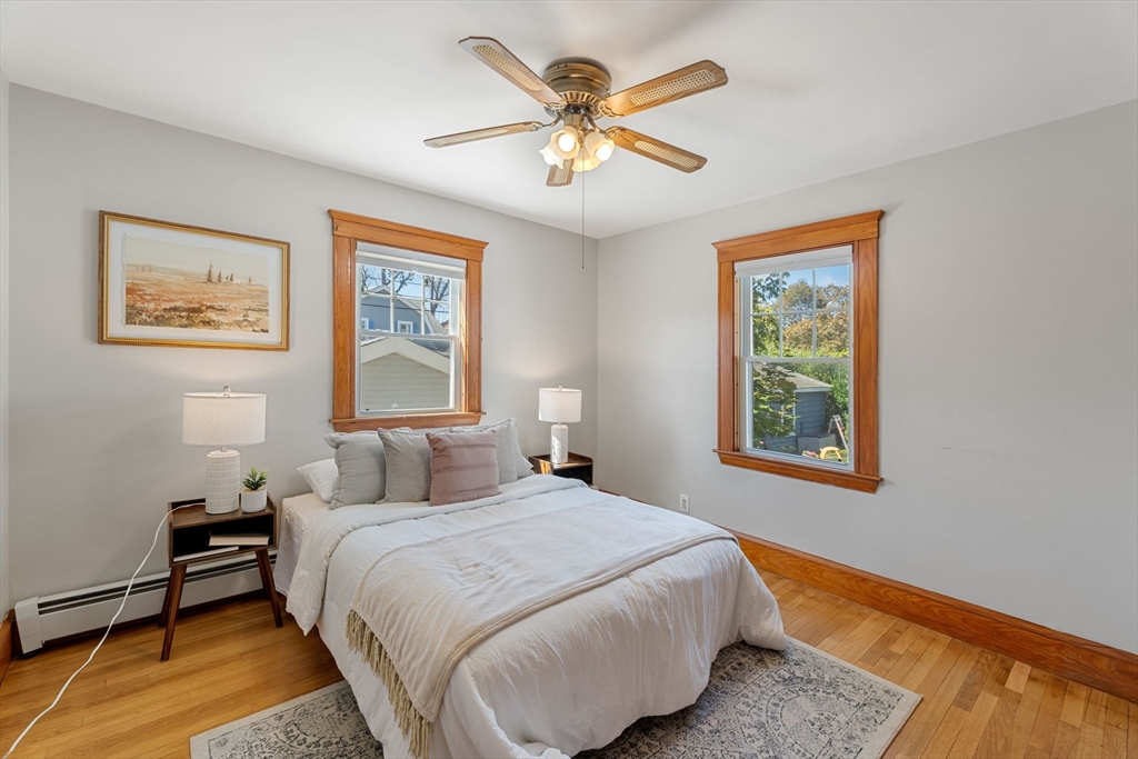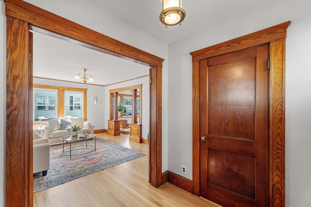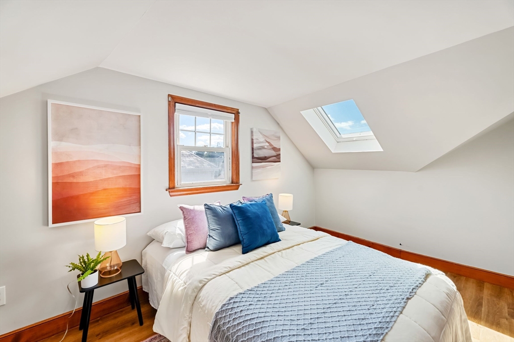 Charming Emerson Park home on quiet, dead end, tree-lined street. 16 Ethel Ave blends modern finishes & timeless character, creating a comfortable, inviting home w/ spacious rooms & optimal floor plan. Newly renovated farmers porch provides warm welcome for relaxation & entertainment, & leads into front entry, complete w/ coat closet & double doors to sunny living room. Adjacent dining room & fully renovated kitchen w/ quartz counters & stainless steel appliances. Also on this floor is a spacious bedroom & extra den area, plus completely renovated bathroom & laundry room. 2 additional bedroom areas upstairs, plus play room area & loads of storage. Full basement for additional storage & shop area, w/ walkout bulkead. Detached garage accessed off Palmer Avenue. New roof and electrical panel (2023) & HW heater (2024). Close to the vibrant shops & restaurants in downtown Peabody. Walkable to Center Elementary and Higgins Middle School. Super easy access to 128 and 95.