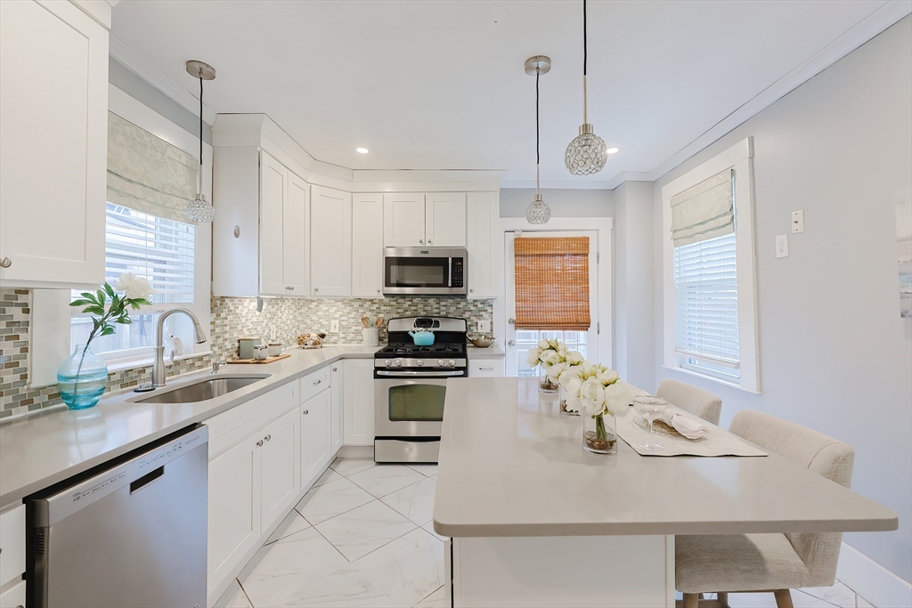 Well loved family home in the heart of Brighton Center! Updated kitchen with large island, quartz countertops, SS appliances. Newly refinished pine floors throughout. Amazing location walkable to several bars, restaurants, parks, shopping, and other amenities including 57 and 501 buses (across the street), green line (B and C, .5 miles) and commuter rail (Boston Landing, ~ 1 mile). Tucked down a quiet side street, resident parking is easy to find! Fenced-in covered outdoor space offers seasonal entertainment space. Other updates include roof, gas heating, and 200 amp electrical. Skylight and open ceilings offer natural light year-round... your chance to love this home starts now.
