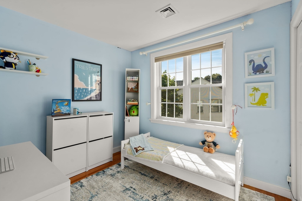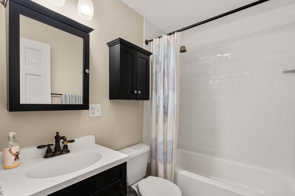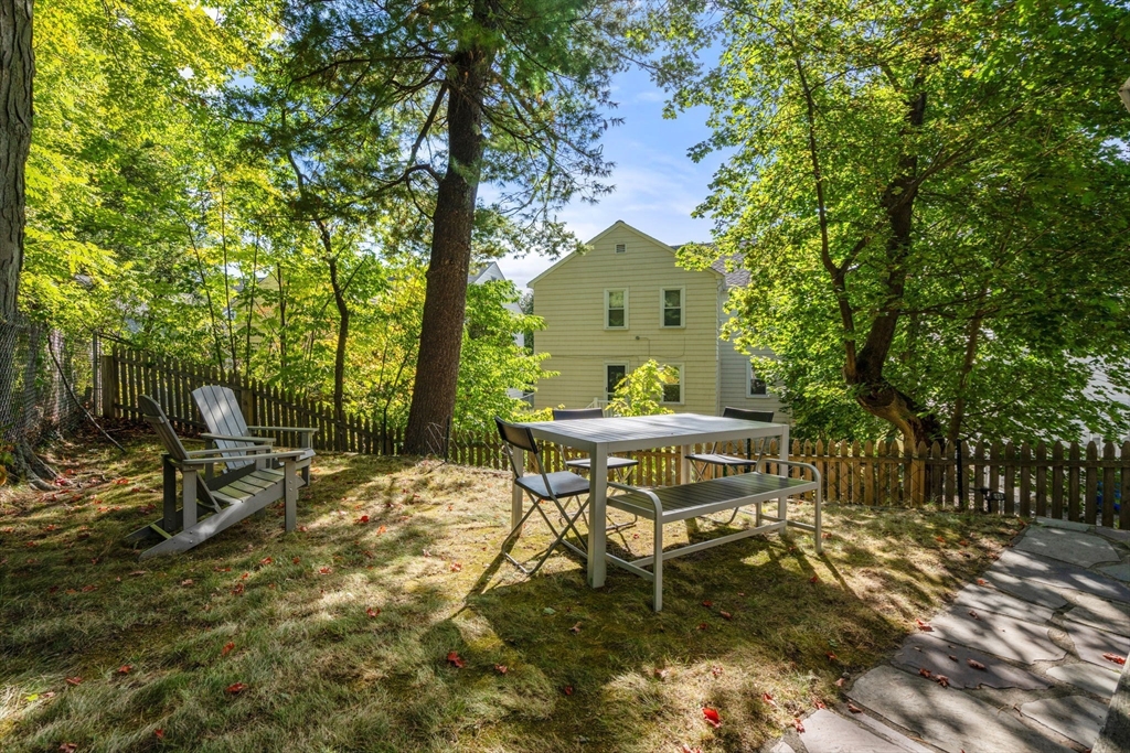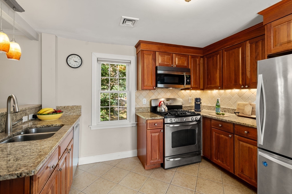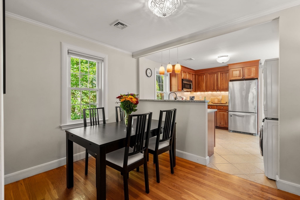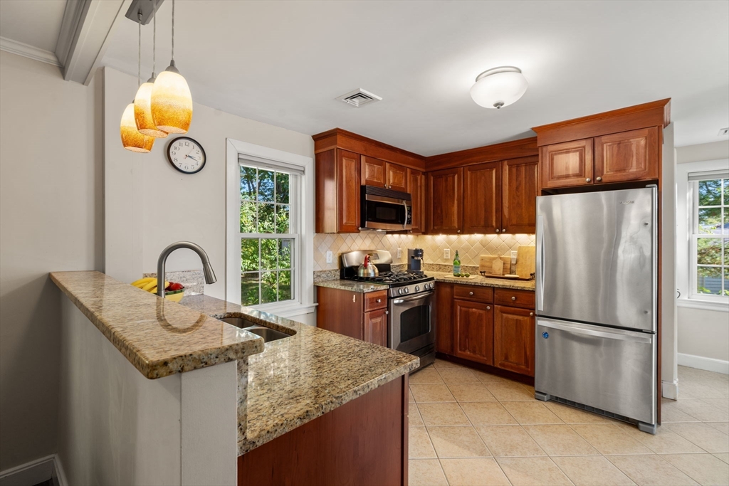 A rare find in the heart of Newton Centre! This move-in ready upper-level condo is located on a quiet, tree-lined street. Renovated in 2008, it features sun-filled spaces, hardwood floors, and an open floor plan. The living room is lined with built-ins and a cozy wood-burning fireplace. The updated kitchen includes a generous dining area, granite countertops, ample cabinetry, and new stainless steel appliances. The spacious primary bedroom has two closets (including a walk-in) and attic access for extra storage. Two additional bedrooms and a full bath complete the unit. Recent updates include a new boiler/water heater (2024), roof (2019), and the exterior painted in 2023. Deeded storage is also available in the basement. Parking includes 1 deeded garage spot and off-street parking for 3+ cars. Enjoy a shaded backyard and unbeatable access to the Newton Centre T, Mason Rice school, shopping, dining, Crystal Lake, and local parks. A perfect blend of comfort, convenience and charm!