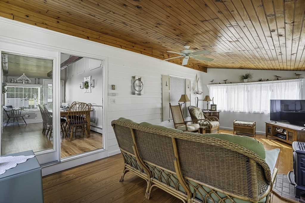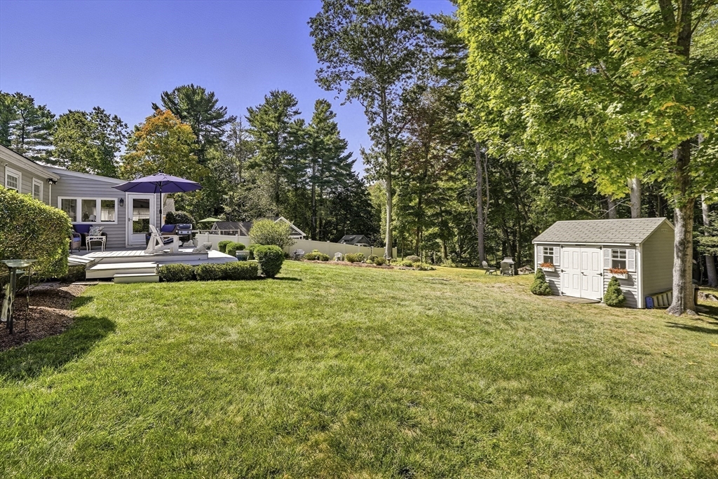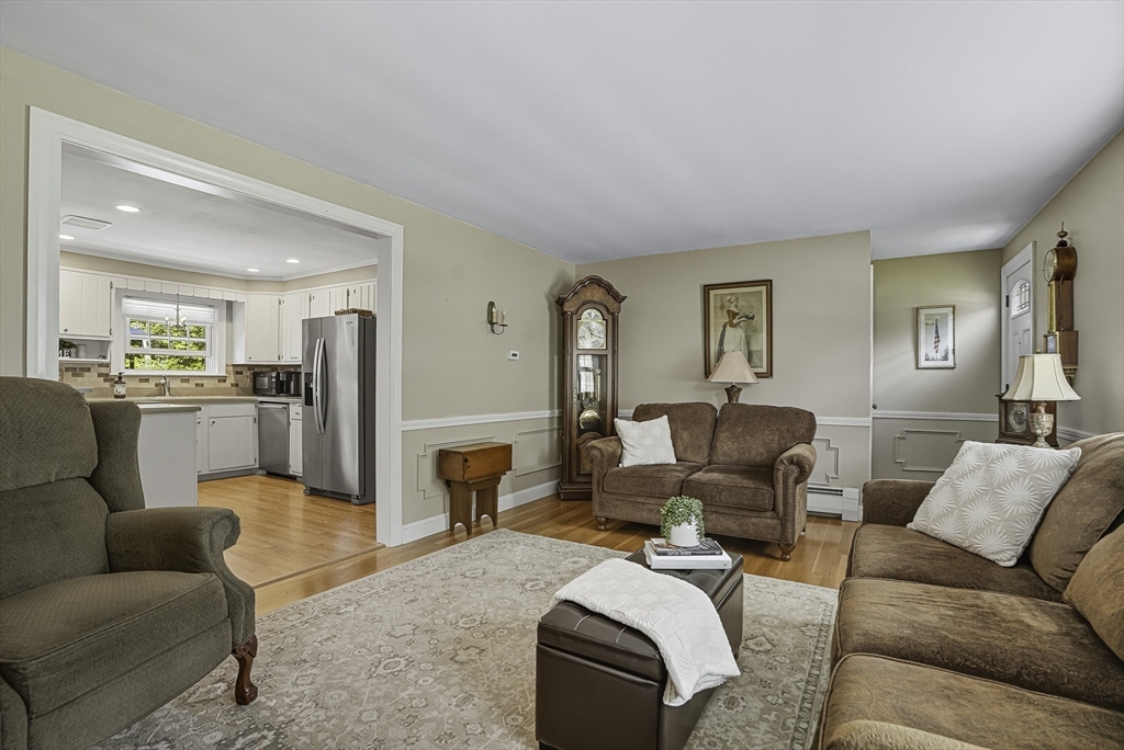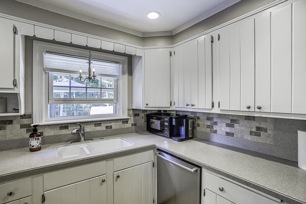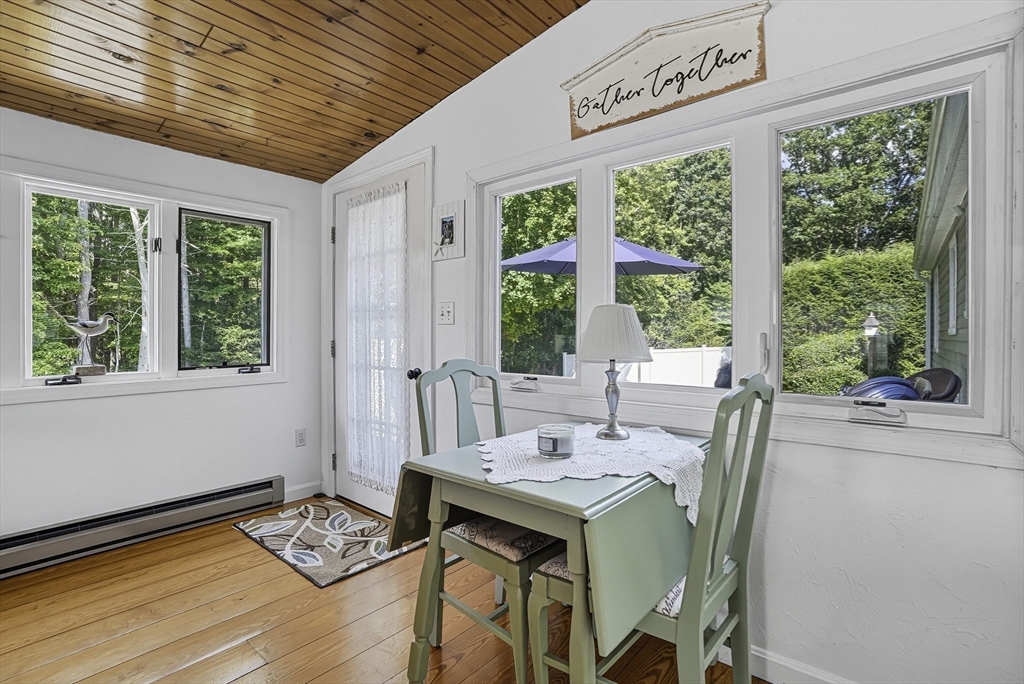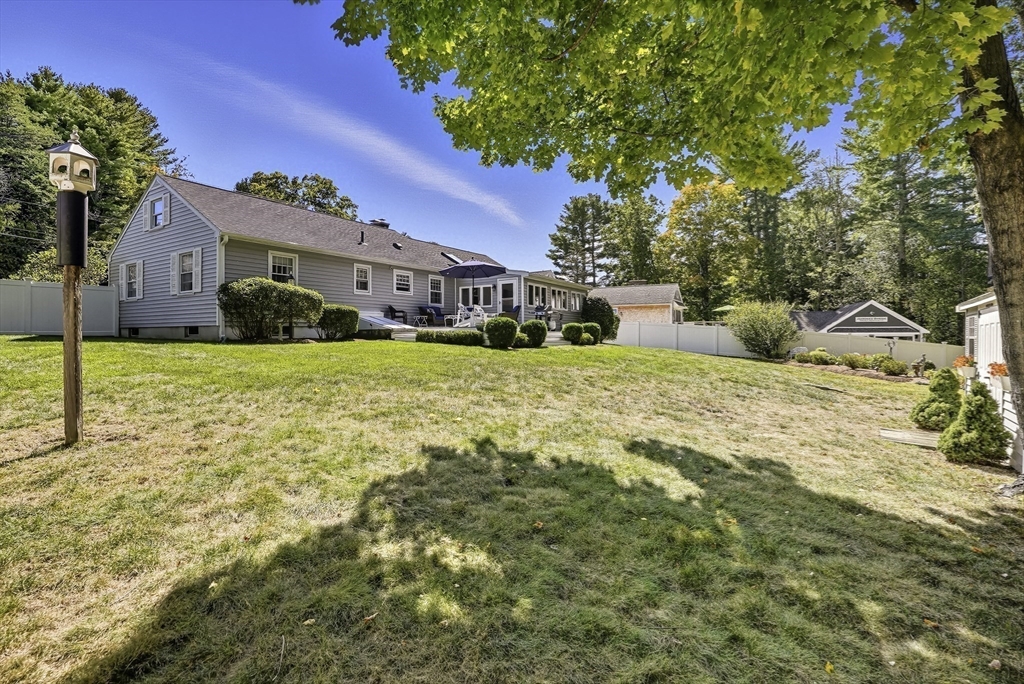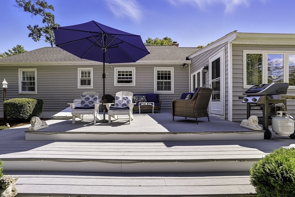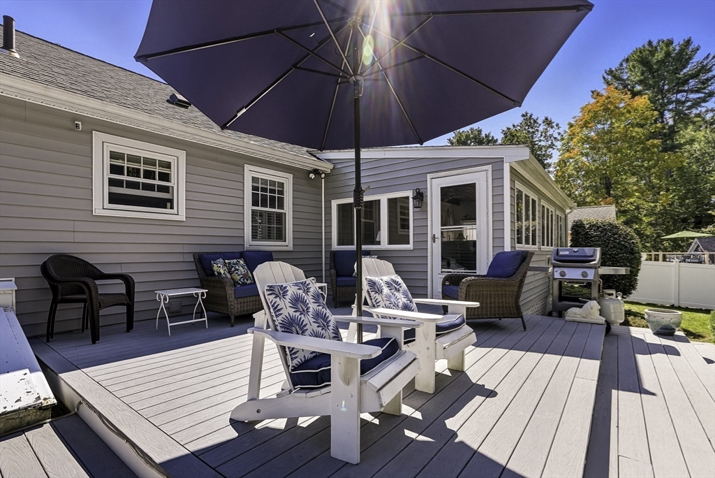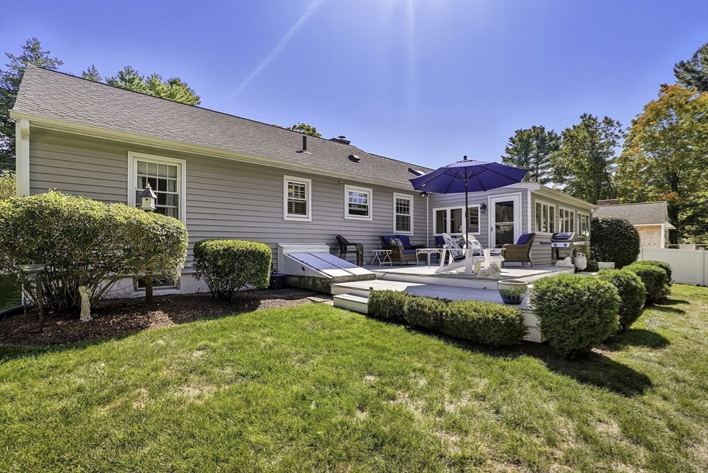 Beautifully maintained and updated oversized ranch with a bright, open floor plan. Features two spacious bedrooms, a full bath with walk-in shower, and improvements throughout. Expansion potential with walk-up attic with a finished staircase and large unfinished basement—plenty of room to grow! Light-filled dining room with cathedral ceiling and skylights open to the bright and sunny remodeled kitchen with stainless appliances and counter seating. Fireplaced living room has stunning wainscoting with built-in bookcases and storage. Highlight of the home is the huge sunroom overlooking the stunning back yard with its own gas stove for those cool evenings. Enjoy mature landscaping on your oversize deck and fenced-in private back yard. Perfect for those looking for one-level living! Pride of ownership and quality is apparent throughout! Conveniently located near all Upton's amenities and schools. A great commuter location!