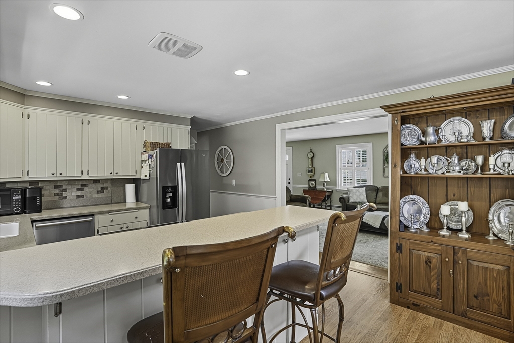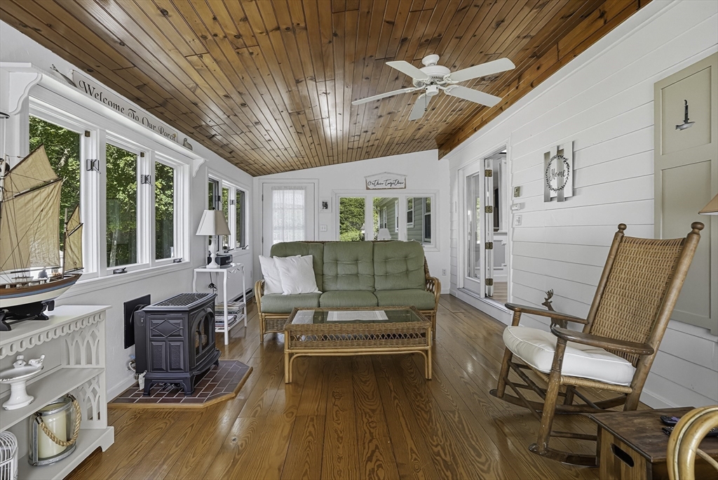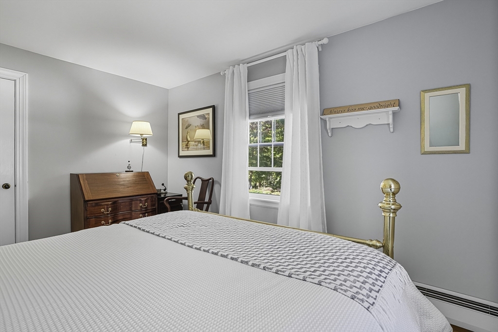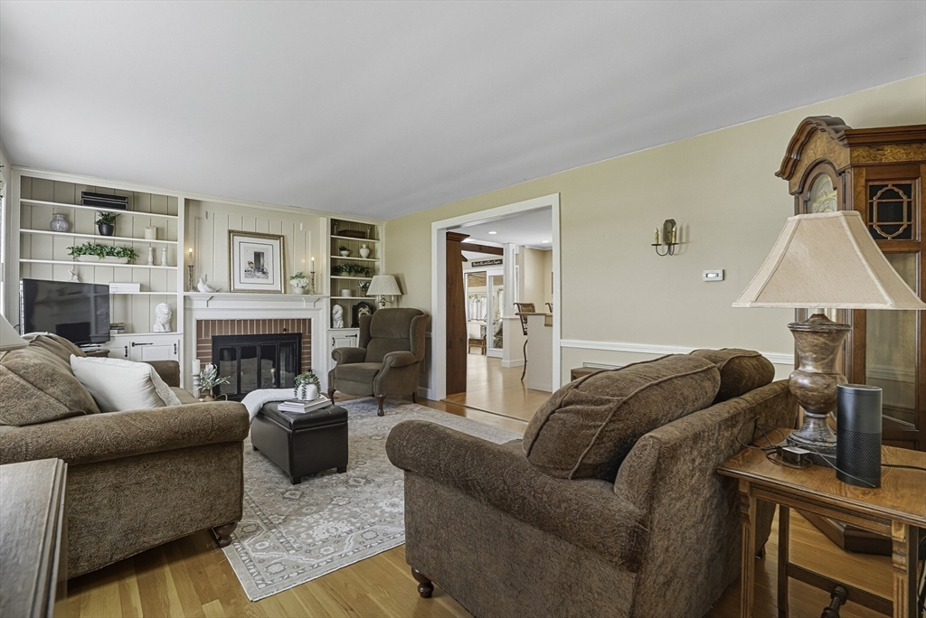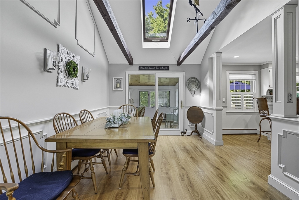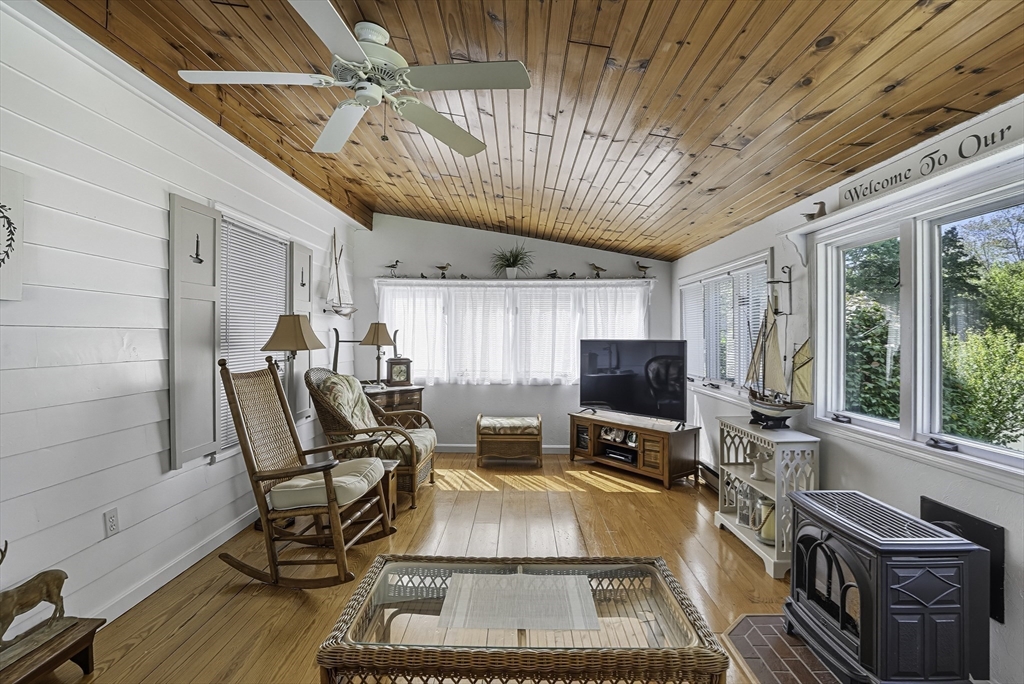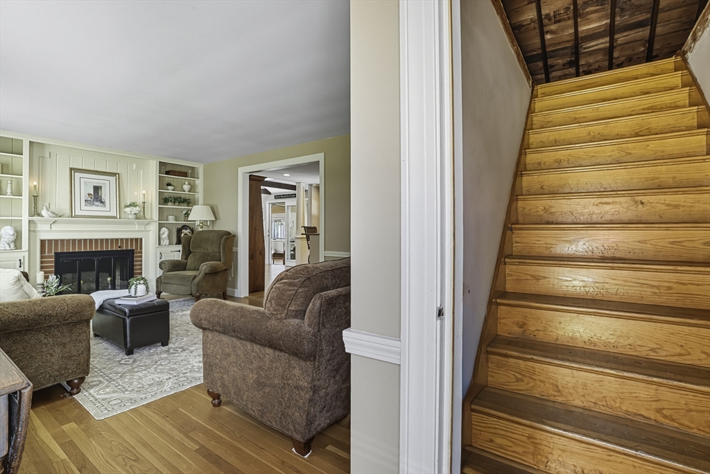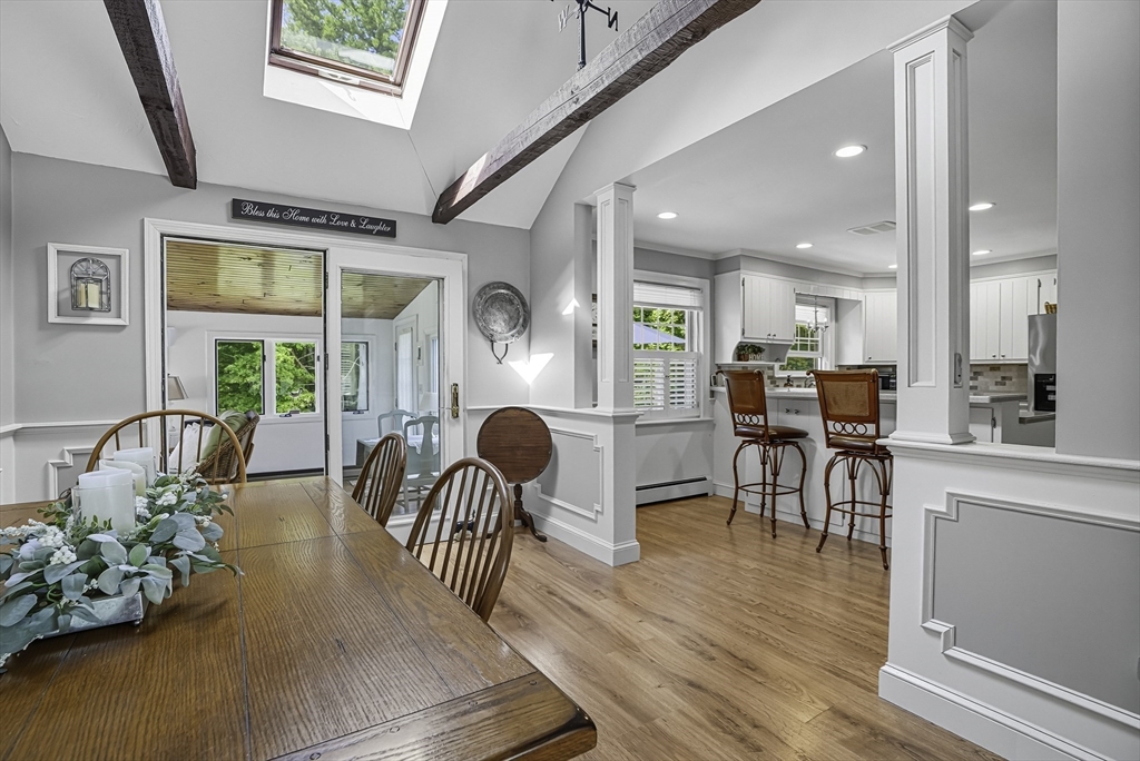 Beautifully maintained and updated oversized ranch with a bright, open floor plan. Features two spacious bedrooms, a full bath with walk-in shower, and improvements throughout. Expansion potential with walk-up attic with a finished staircase and large unfinished basement—plenty of room to grow! Light-filled dining room with cathedral ceiling and skylights open to the bright and sunny remodeled kitchen with stainless appliances and counter seating. Fireplaced living room has stunning wainscoting with built-in bookcases and storage. Highlight of the home is the huge sunroom overlooking the stunning back yard with its own gas stove for those cool evenings. Enjoy mature landscaping on your oversize deck and fenced-in private back yard. Perfect for those looking for one-level living! Pride of ownership and quality is apparent throughout! Conveniently located near all Upton's amenities and schools. A great commuter location!