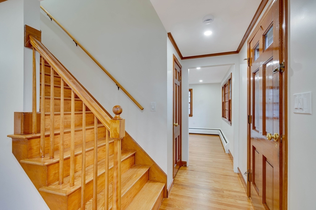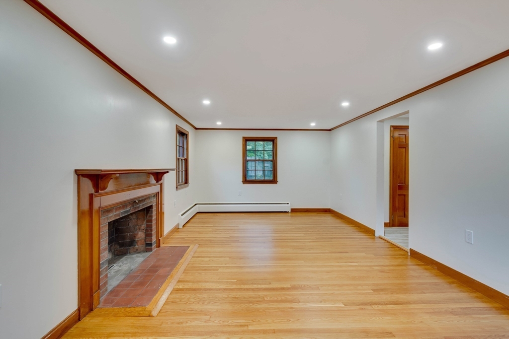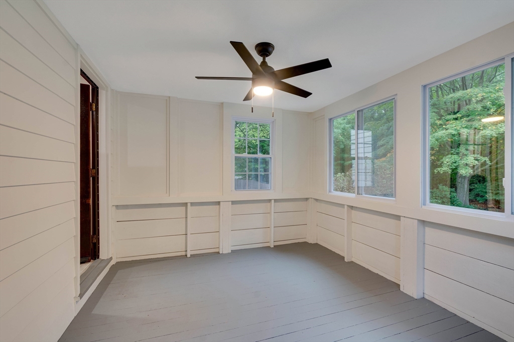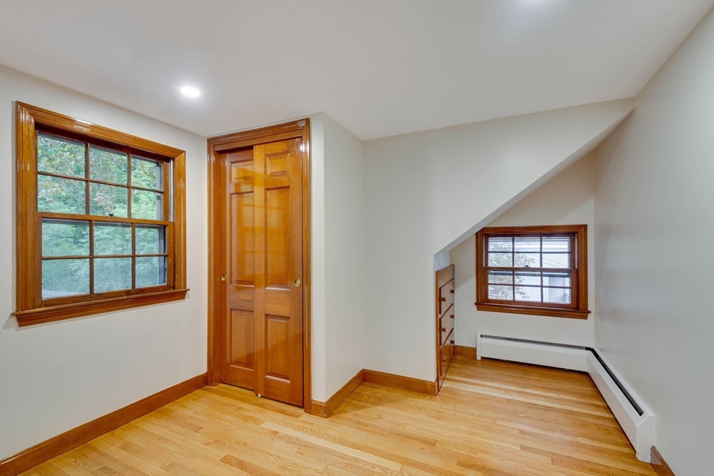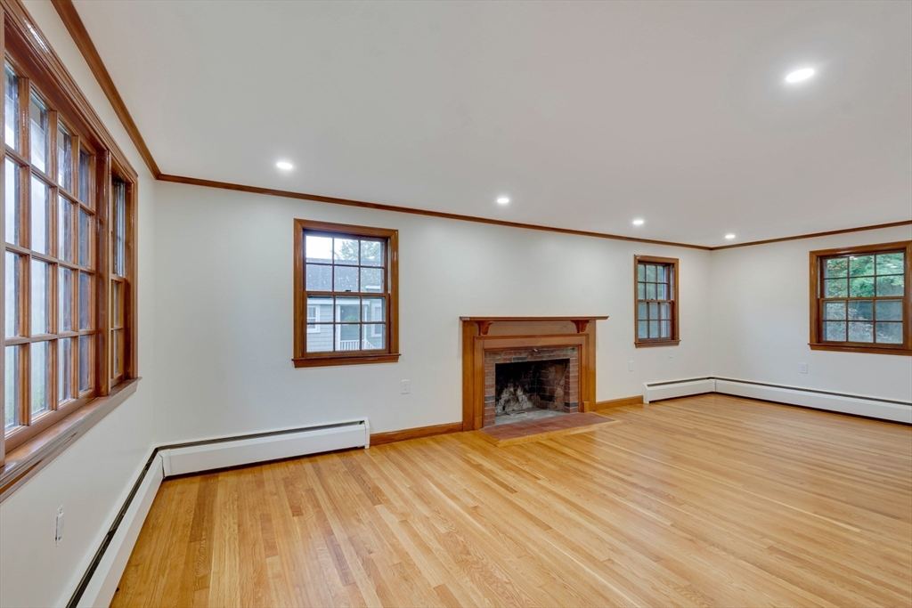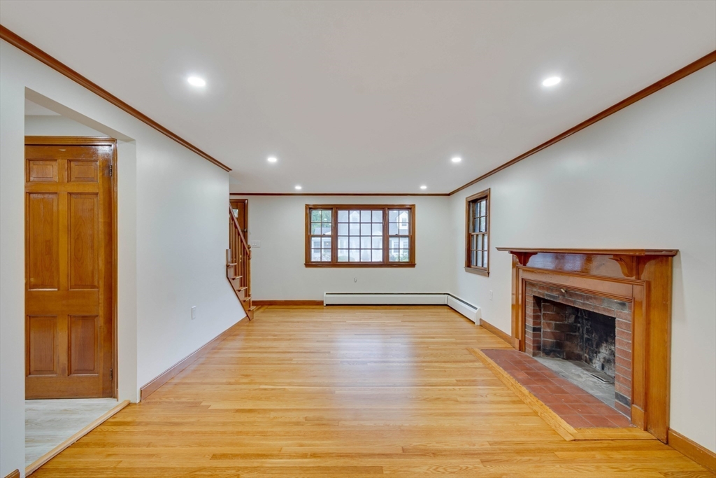 Renovated cape steps to town center w/large private yard and separate garage! This property combines character with modern features. Impressive hardwood floors, crown molding, built-in cabinets & drawers & window seats. First level showcases an eat-in-kitchen w/new SS appliances & countertops and deep pantry, front to back fireplaced living room, dining room w/built-in cabinets, half bath & new 120 sq.ft. sunroom overlooking large private yard. Main bedroom is front to back with built-in drawers & window seat. Two add'l cozy bedrooms w/built-ins. Renovated full bath. LL has ample storage and w/high ceilings and is ready for gym & family rm. New kitchen & bath floors, refinished hardwood floors & recessed lights. Freshly painted inside & out. New roof. This warm and inviting home is bright and airy with an ideal flow for both living and entertaining. $120K+ in recent updates! Garage & ample parking. Enjoy stroll to center's shops or commuter/bus stop. Minute ride to Rte 95 and shopping!