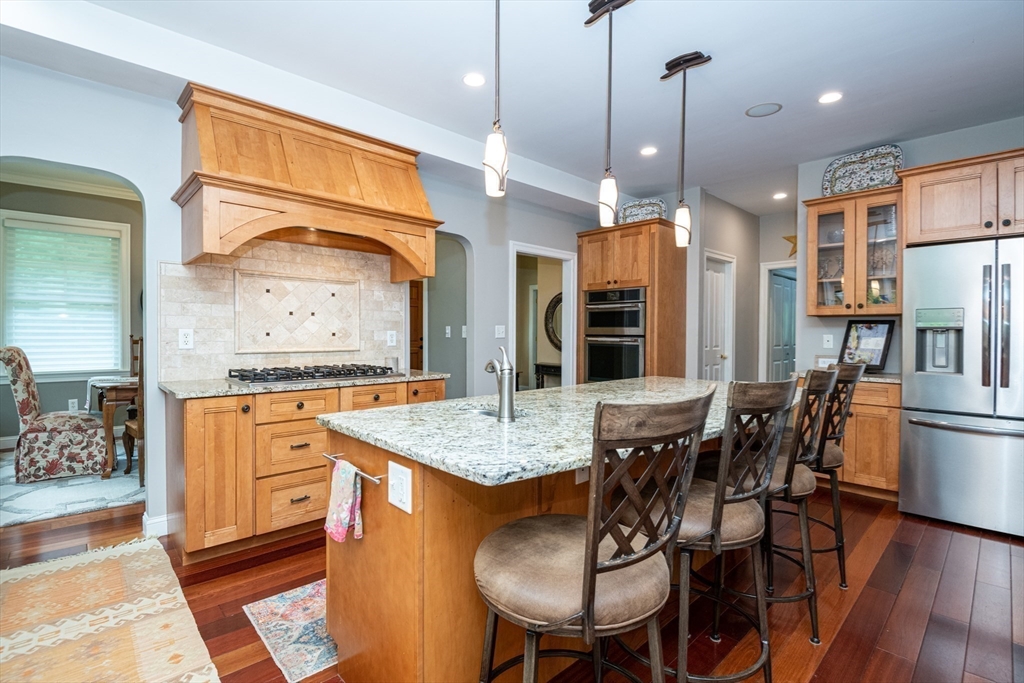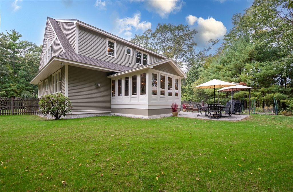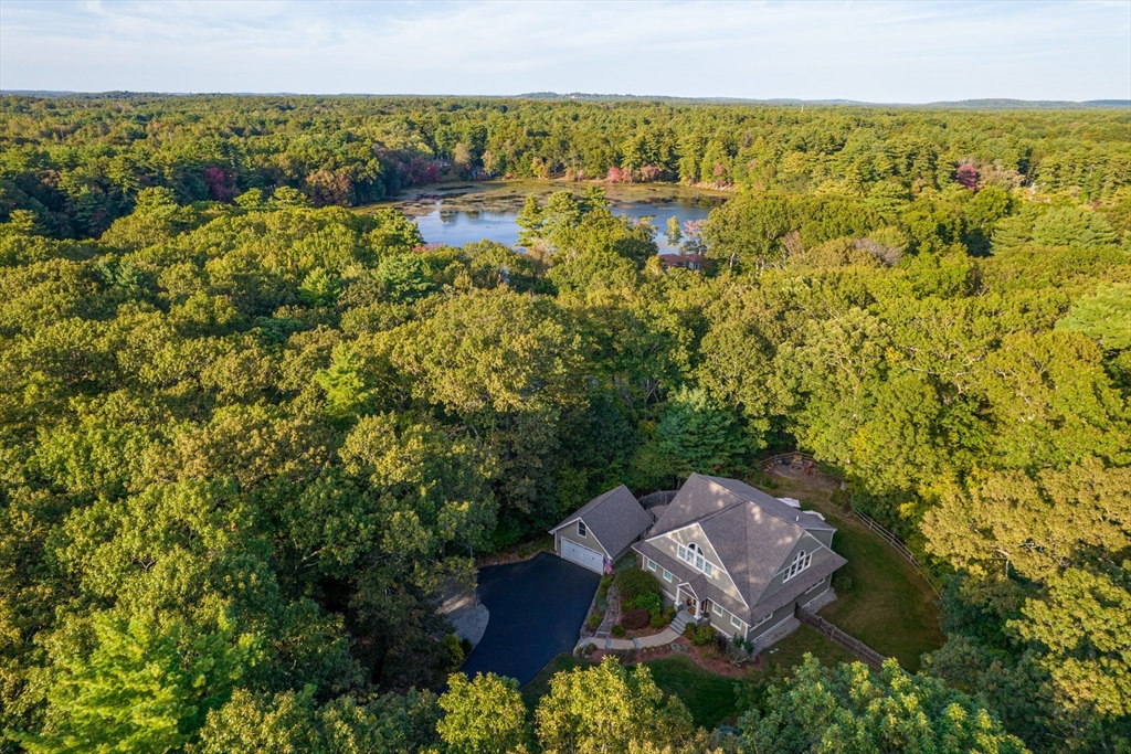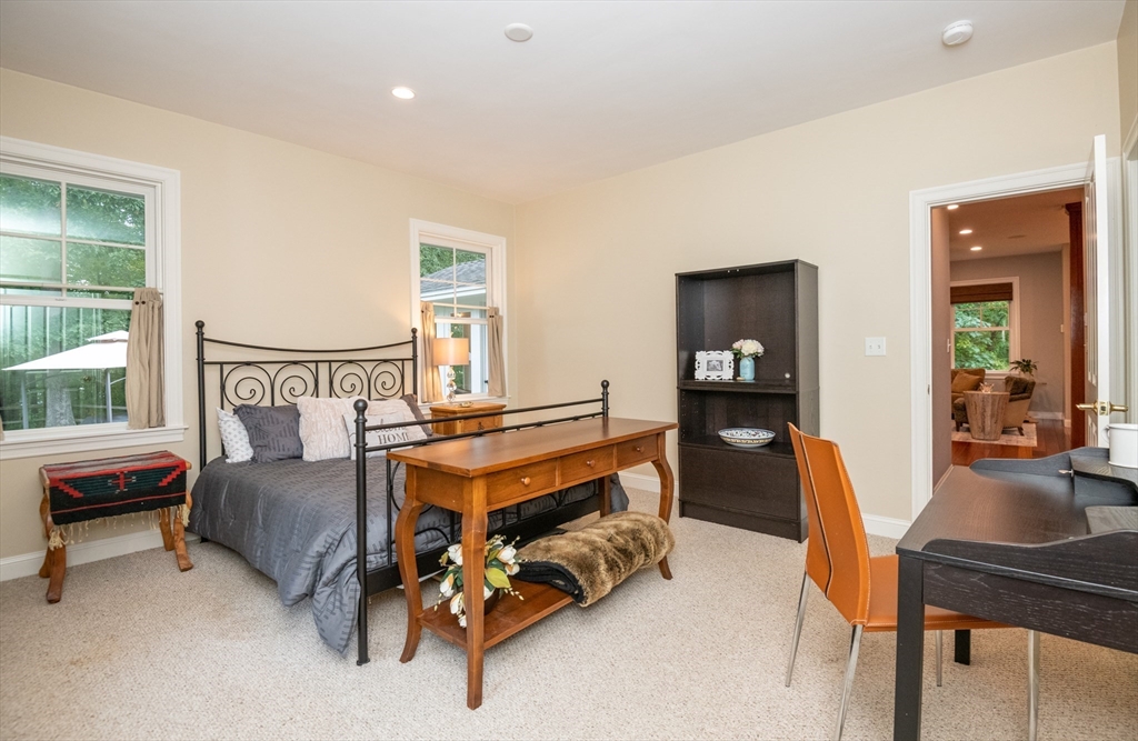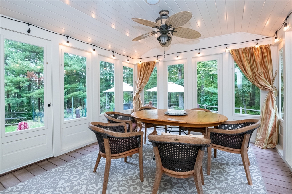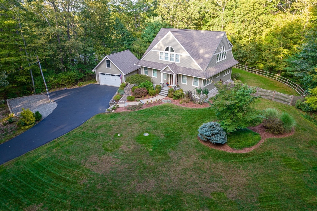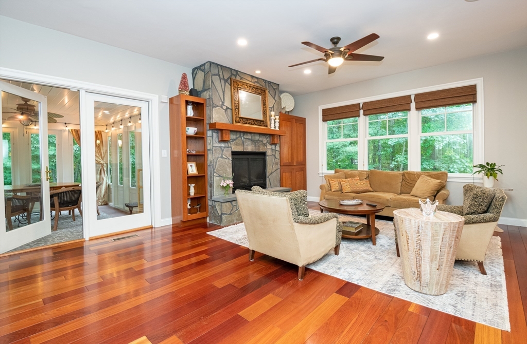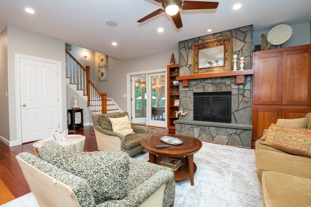 Custom-built Craftsman home set proudly on a 1.53-acre lot in desirable East Boxford. This beautifully designed home features 9-foot ceilings on the main level and a welcoming foyer with stone flooring. A versatile den/office, featuring custom cabinetry, is complemented by a main-level bedroom and full bath, offering flexible living options. The formal dining room, highlighted by Brazilian cherry wood flooring, flows seamlessly into the open concept kitchen and living room. The kitchen boasts a granite island with a six-burner Viking gas stove and stainless steel appliances. The living room is anchored by a stone fireplace with custom-built cabinetry, while the adjoining 3-season room extends the home's entertaining space. Upstairs, three en-suite bedrooms with soaring 11-foot ceilings are complemented by a cozy reading nook and a convenient laundry room. The primary suite includes a luxurious bath with a steam walk-in shower and soaking tub. The lower level is an ideal game room.