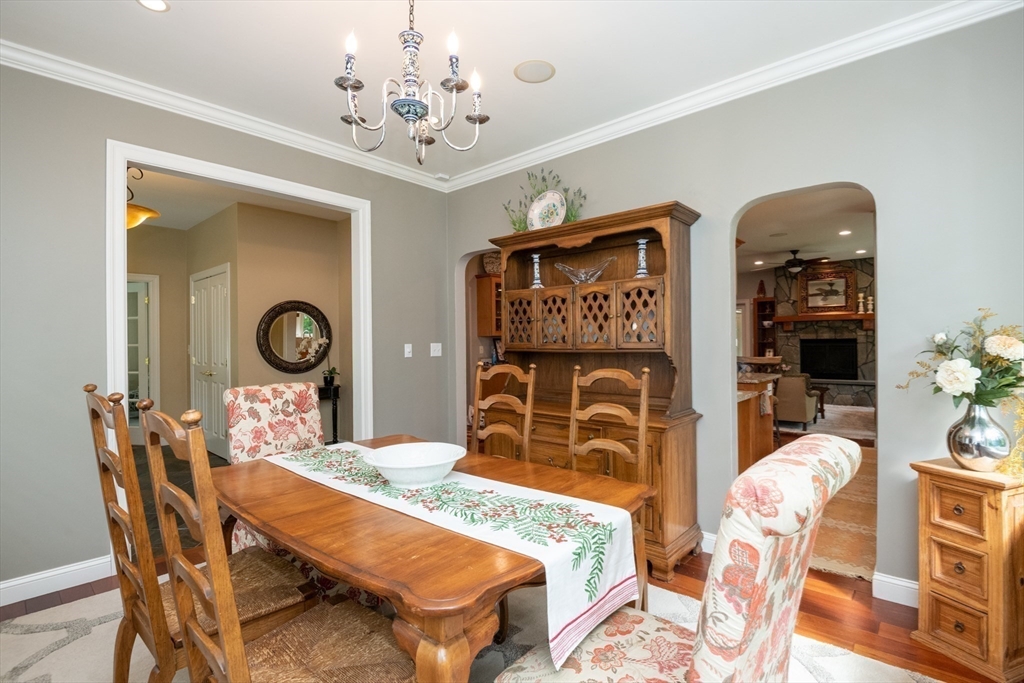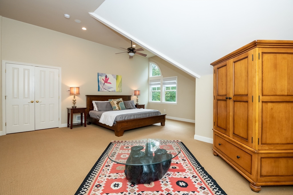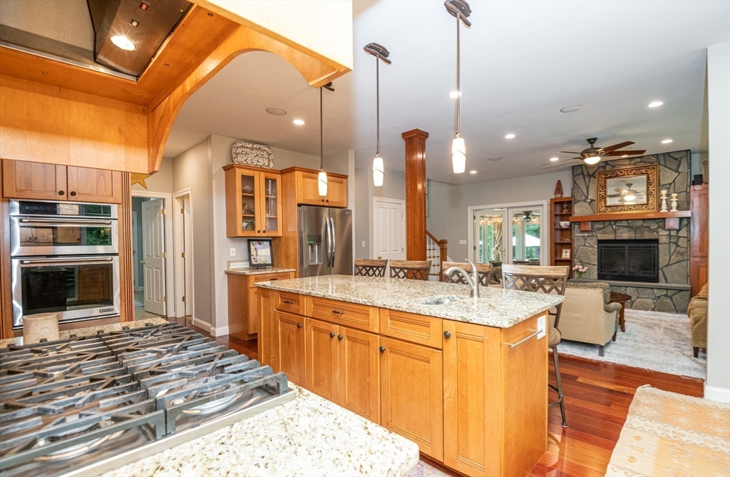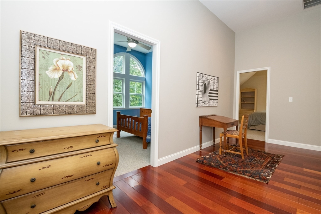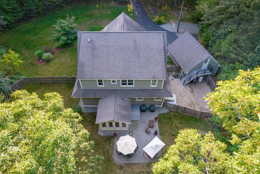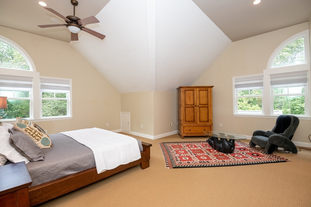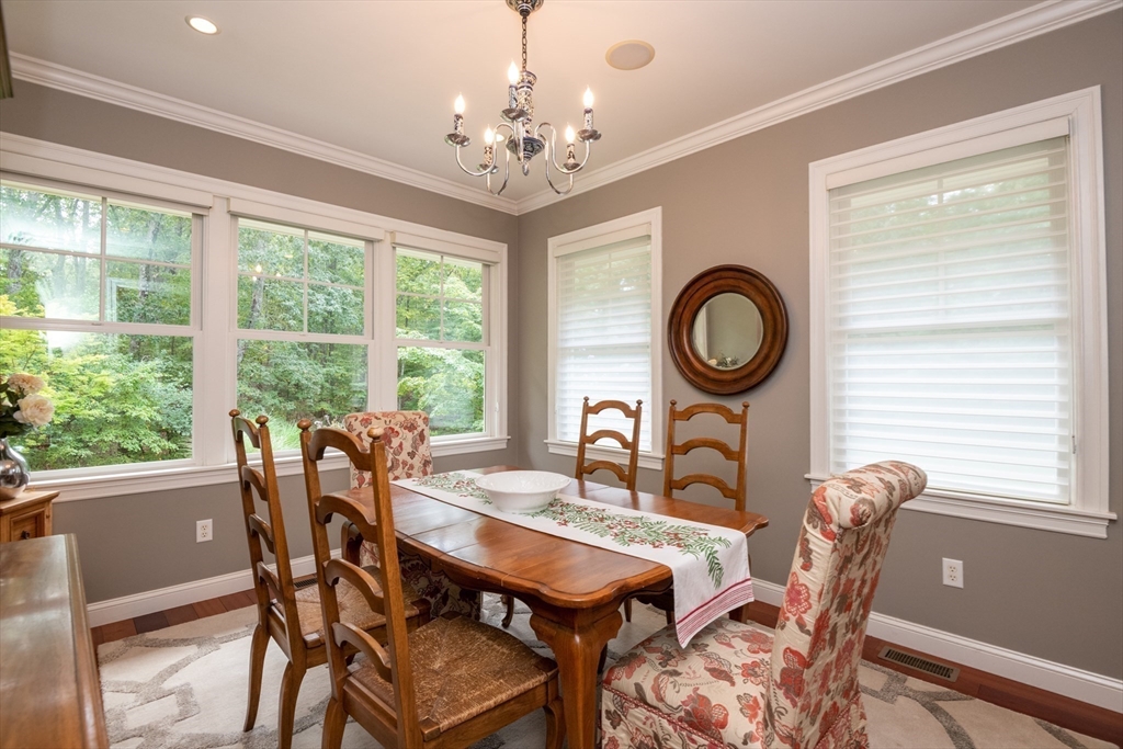 Custom-built Craftsman home set proudly on a 1.53-acre lot in desirable East Boxford. This beautifully designed home features 9-foot ceilings on the main level and a welcoming foyer with stone flooring. A versatile den/office, featuring custom cabinetry, is complemented by a main-level bedroom and full bath, offering flexible living options. The formal dining room, highlighted by Brazilian cherry wood flooring, flows seamlessly into the open concept kitchen and living room. The kitchen boasts a granite island with a six-burner Viking gas stove and stainless steel appliances. The living room is anchored by a stone fireplace with custom-built cabinetry, while the adjoining 3-season room extends the home's entertaining space. Upstairs, three en-suite bedrooms with soaring 11-foot ceilings are complemented by a cozy reading nook and a convenient laundry room. The primary suite includes a luxurious bath with a steam walk-in shower and soaking tub. The lower level is an ideal game room.