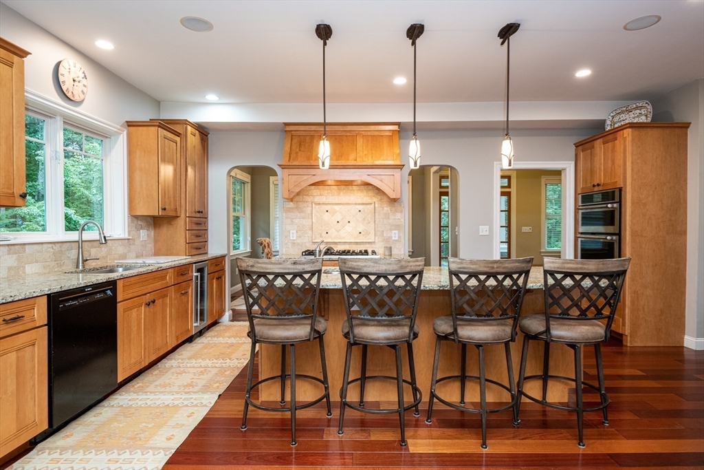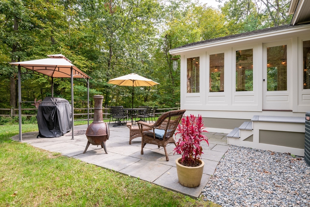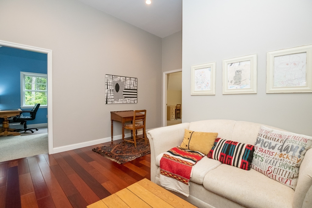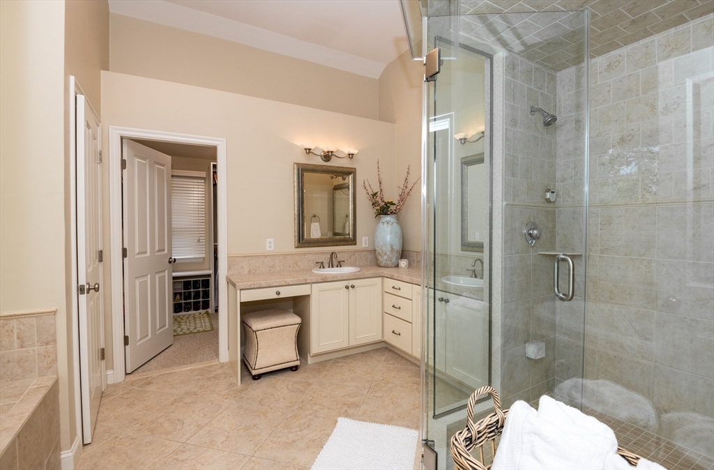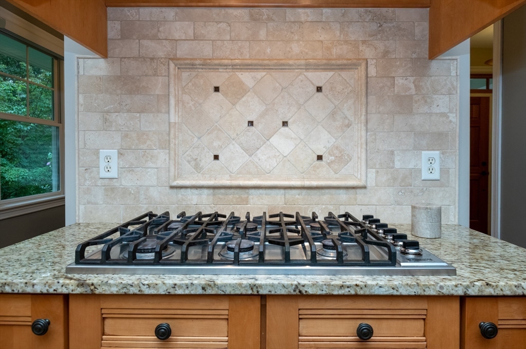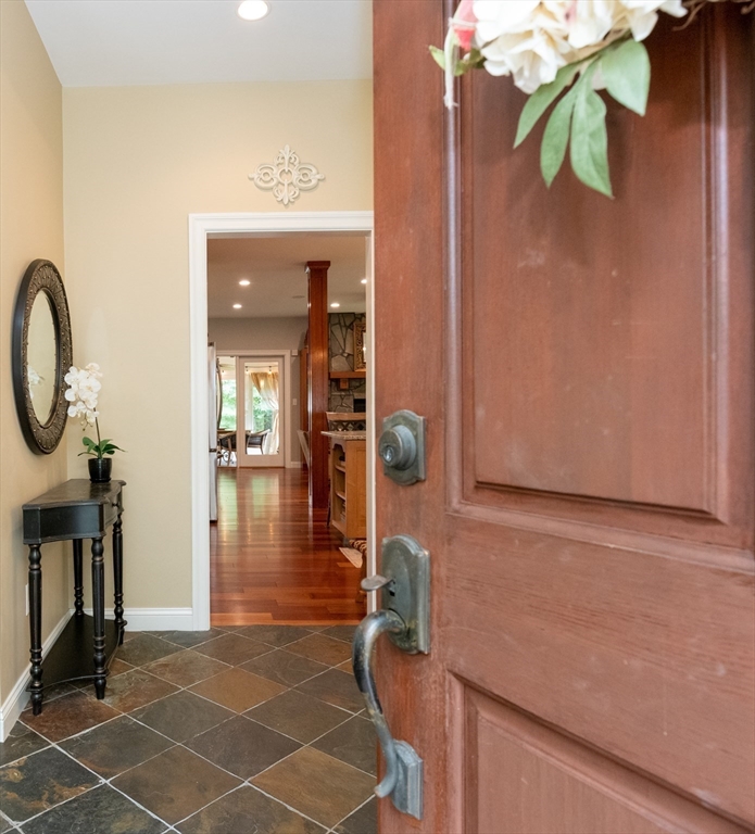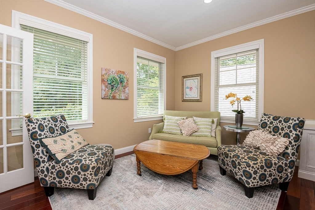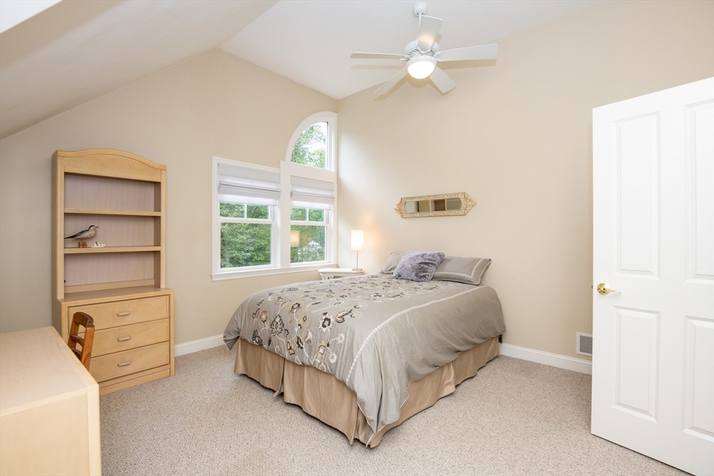 Custom-built Craftsman home set proudly on a 1.53-acre lot in desirable East Boxford. This beautifully designed home features 9-foot ceilings on the main level and a welcoming foyer with stone flooring. A versatile den/office, featuring custom cabinetry, is complemented by a main-level bedroom and full bath, offering flexible living options. The formal dining room, highlighted by Brazilian cherry wood flooring, flows seamlessly into the open concept kitchen and living room. The kitchen boasts a granite island with a six-burner Viking gas stove and stainless steel appliances. The living room is anchored by a stone fireplace with custom-built cabinetry, while the adjoining 3-season room extends the home's entertaining space. Upstairs, three en-suite bedrooms with soaring 11-foot ceilings are complemented by a cozy reading nook and a convenient laundry room. The primary suite includes a luxurious bath with a steam walk-in shower and soaking tub. The lower level is an ideal game room.
