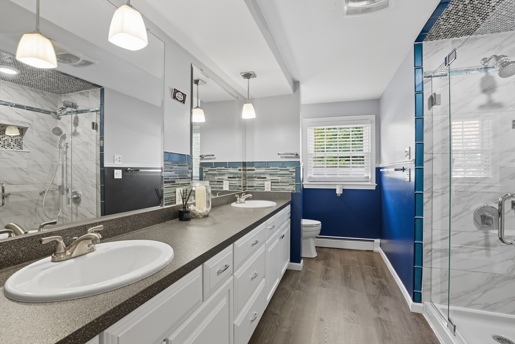 Looking for 1-level living, multi-generational space, or potential handicap accessibility? This sprawling ranch has it all! Recently updated with stunning hardwoods throughout, this corner-lot home is perfect for entertaining. Inside are 4 spacious bedrooms, including a primary suite with WIC and ensuite. A full bath serves the other 3 beds, plus a guest half bath and large laundry room. The beautiful eat-in kitchen opens to the dining room and sunken family room. You’ll also find a large living room with a grand stone fireplace and deck. The lower level features a private guest suite w/ full bath—ideal for in-home business, gym, playroom, or separate living. The huge basement w/ new epoxy floors offers endless potential, with interior and 2-car garage access. Solar panels keep electric costs low, while the fenced backyard includes irrigation, outdoor lighting, a pergola, and a large patio. Assumable VA loan is an option for buyers. Close to shopping, highways, churches and hospitals.