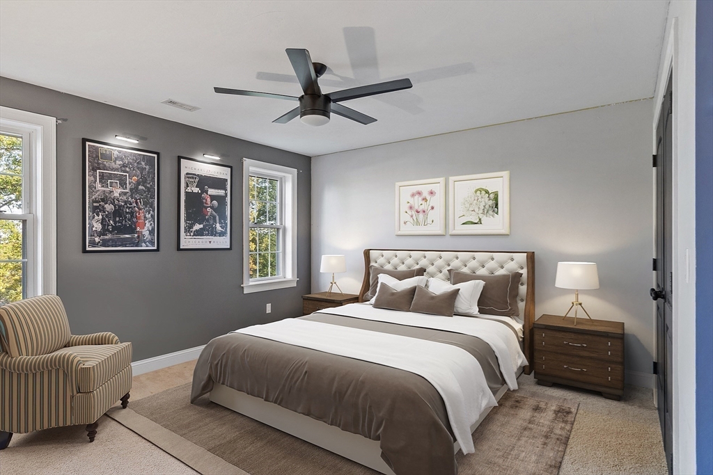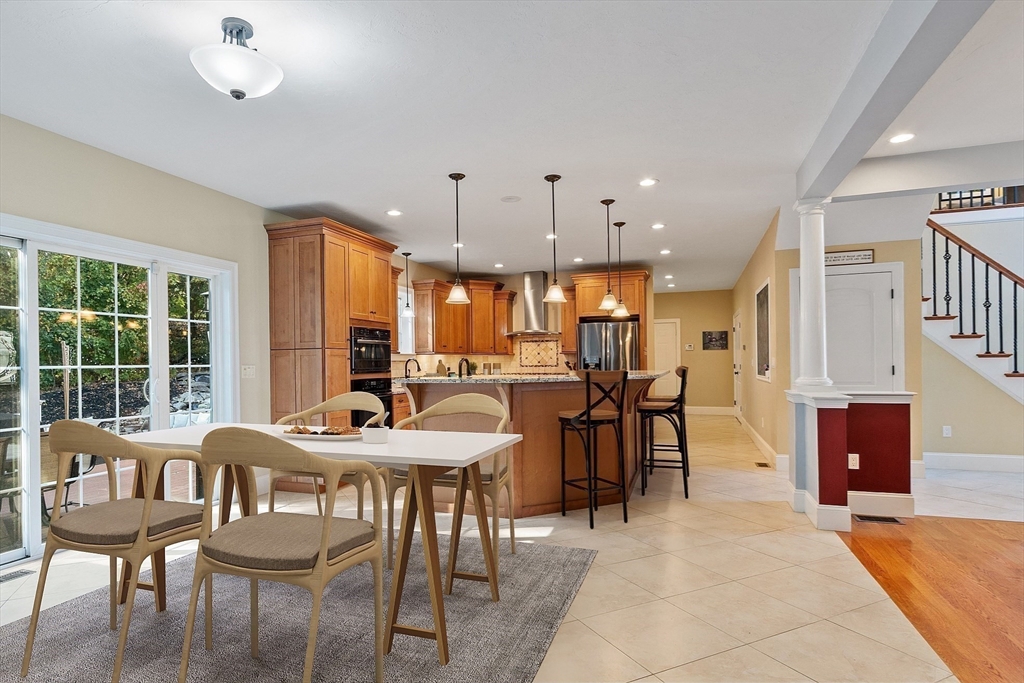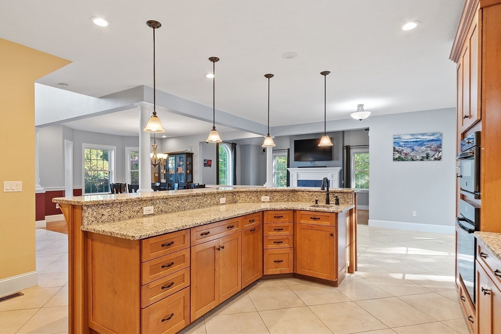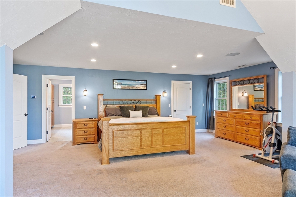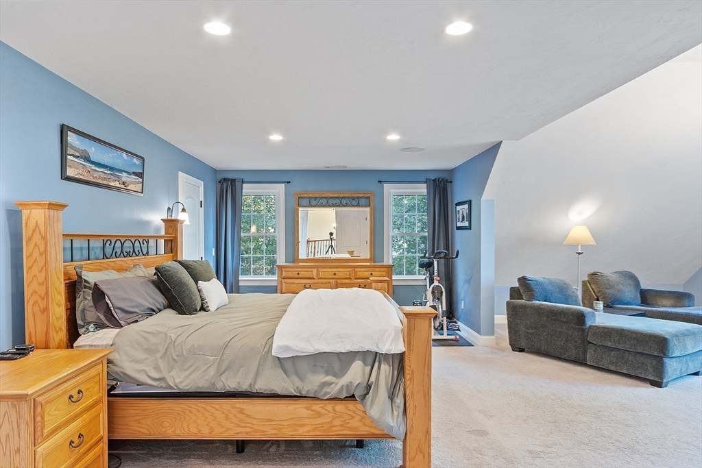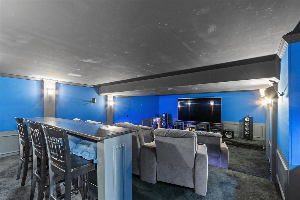 Nestled in this treetop neighborhood is this impressive, stone front 4 bed Colonial where design, efficiency & luxury meet. Built with steel beam reinforcement & 2x6 construction, this home features seller-owned solar panels delivering 300A of power. Spacious layout includes a library, luxurious primary suite & step-down family room with 15' ceilings which open to the kitchen/dining area. Enjoy a private home theater, bonus guest room w/half bath, first floor office/guest bedroom, three-season porch & expansive deck. Outdoors, relax to the soothing sounds of the waterfall feature, impressive patio stonework,6-person Bullfrog hot tub & above-ground pool. Dual furnaces & hot water heaters ensure comfort year-round. This prime location is minutes to highways, center of town & lakes—this rare home blends elegance, sustainability & location!