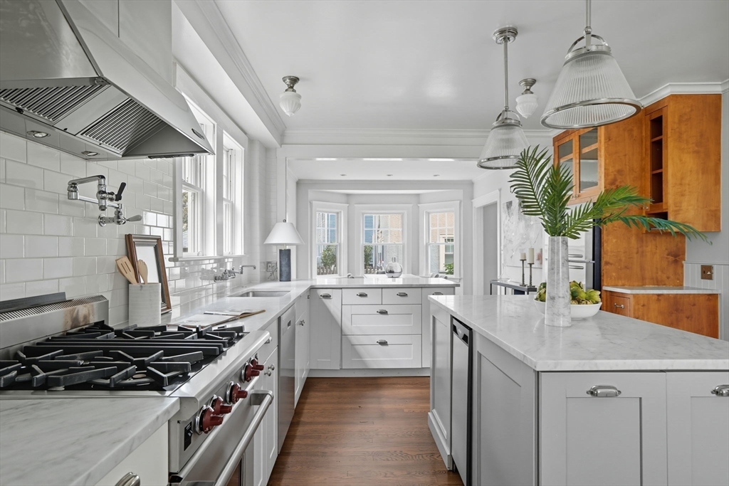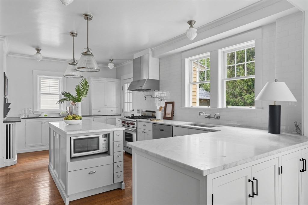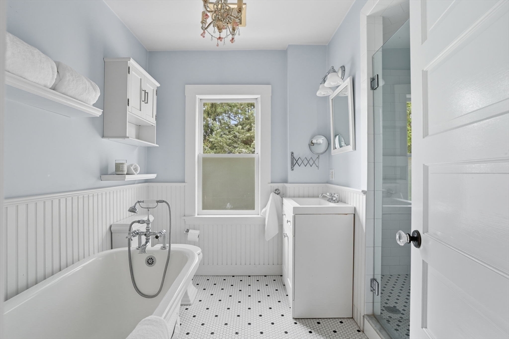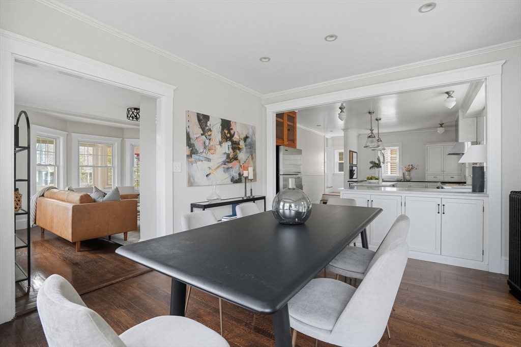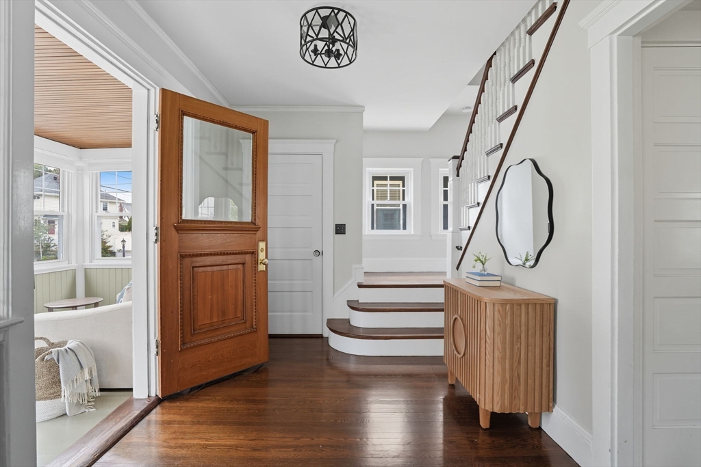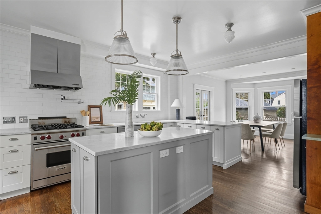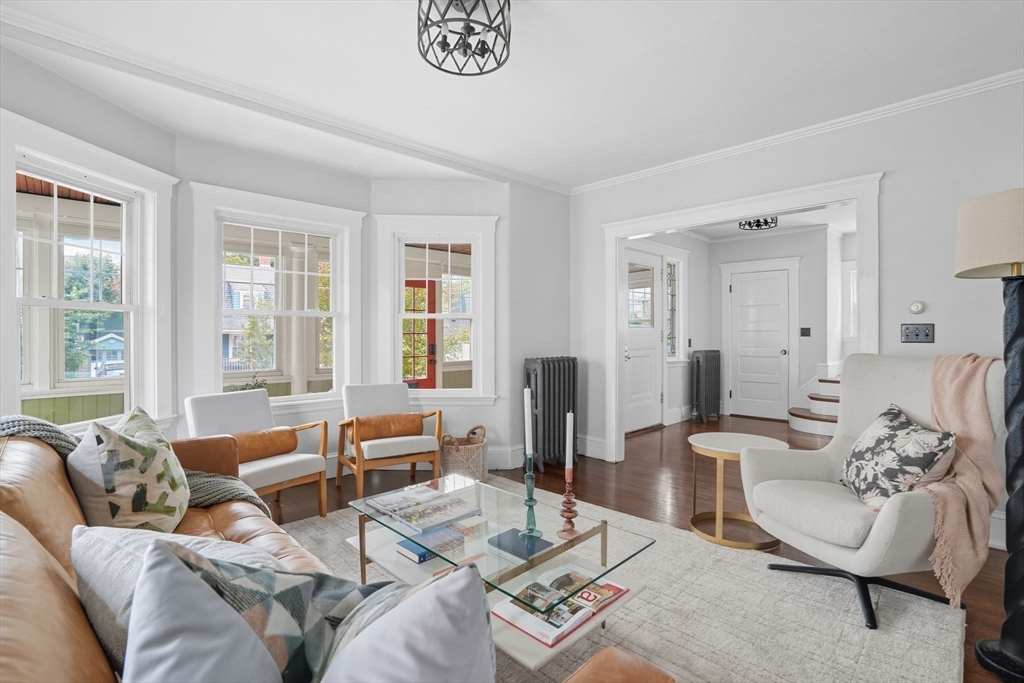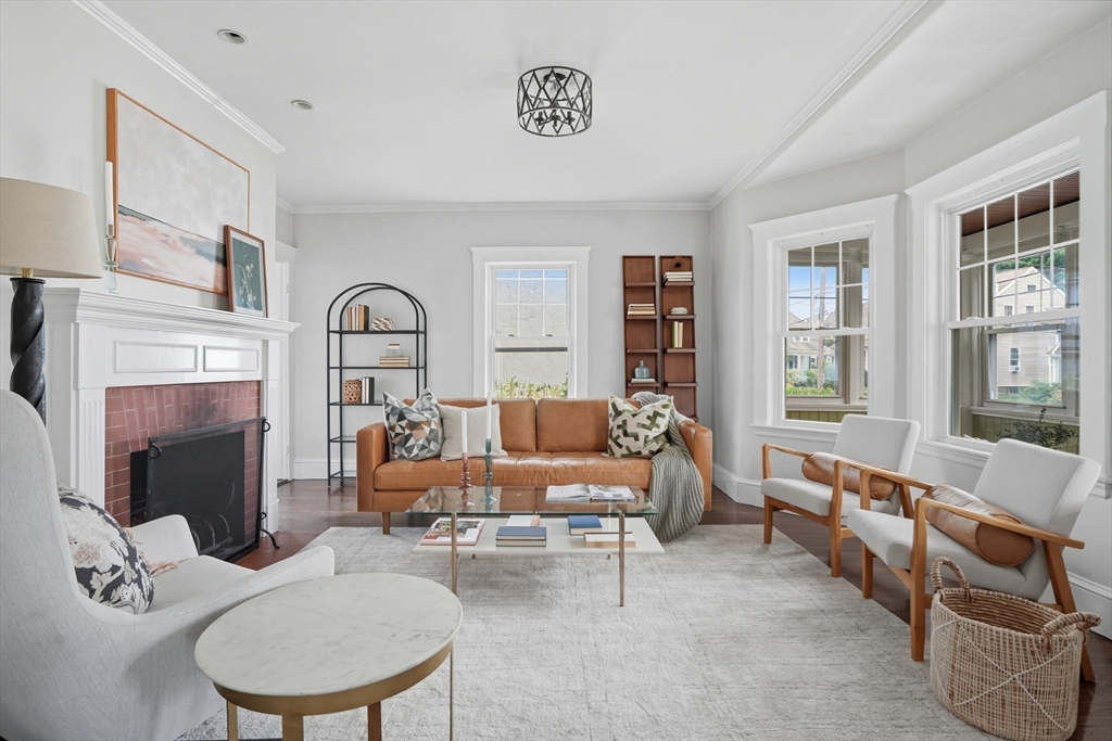 This beautifully updated Colonial combines vintage charm with modern comforts on one of West Medford’s most desirable blocks. A welcoming front porch and gracious foyer open to a sun-splashed first floor, featuring an open kitchen/dining area with honed Bianco Carrara and Vermont soapstone countertops, custom cabinetry, and a Wolf range. The living room, with its wood-burning fireplace and intricate mantle, highlights the home’s timeless woodwork, high ceilings, and hardwood floors. The elegant family bath has been thoughtfully renovated with a spa-like shower and soaking tub. Other recent updates include a 2015 roof, foam insulation, upgraded electrical, interior paint, and refreshed landscaping. Complete with a two-car garage, this home is nestled in a coveted enclave just steps to the commuter rail.