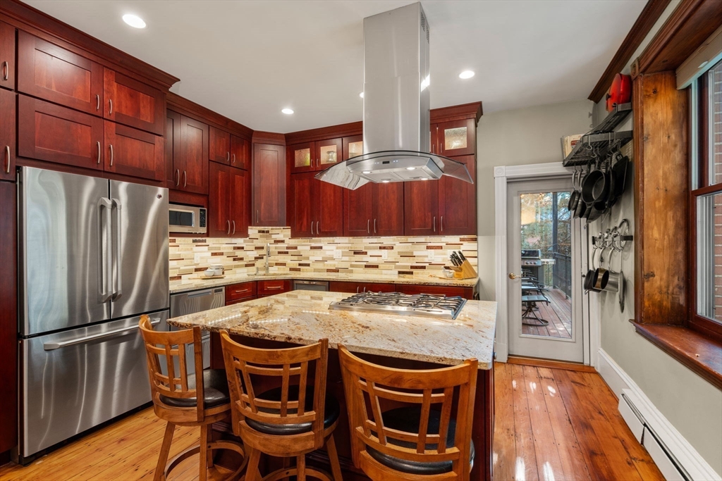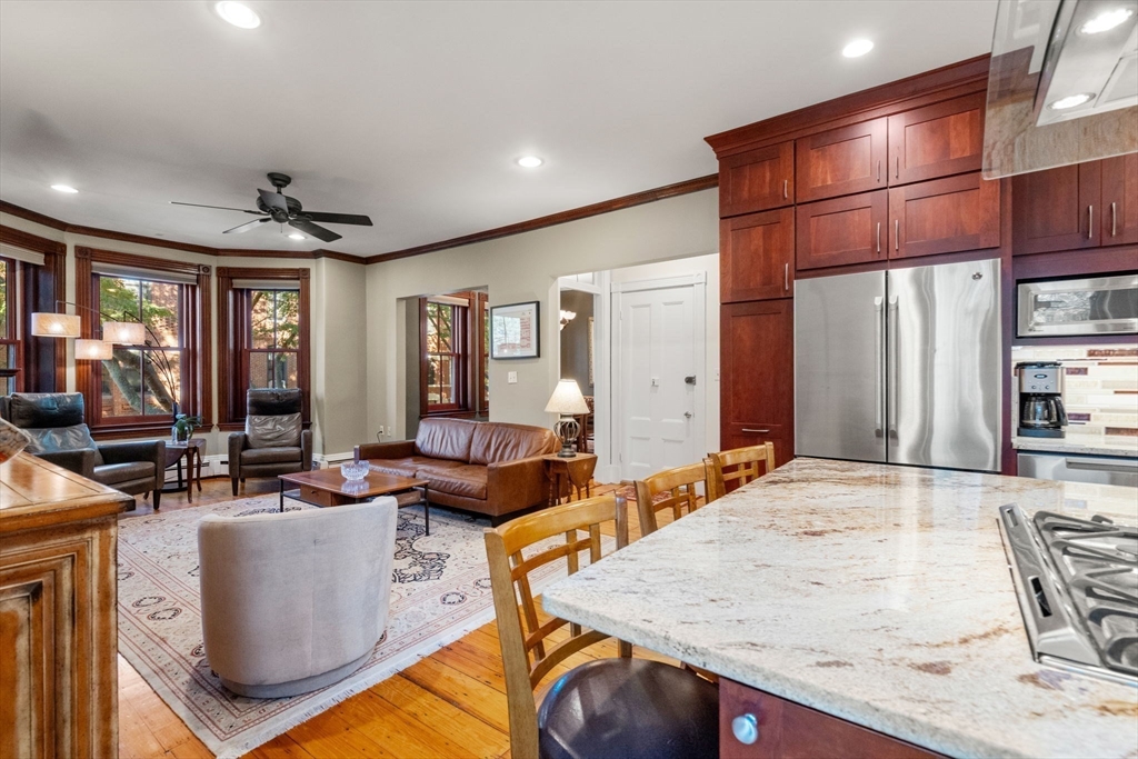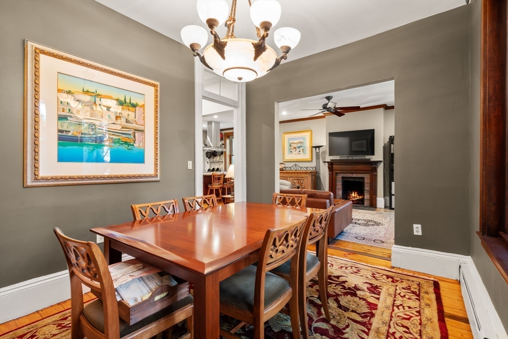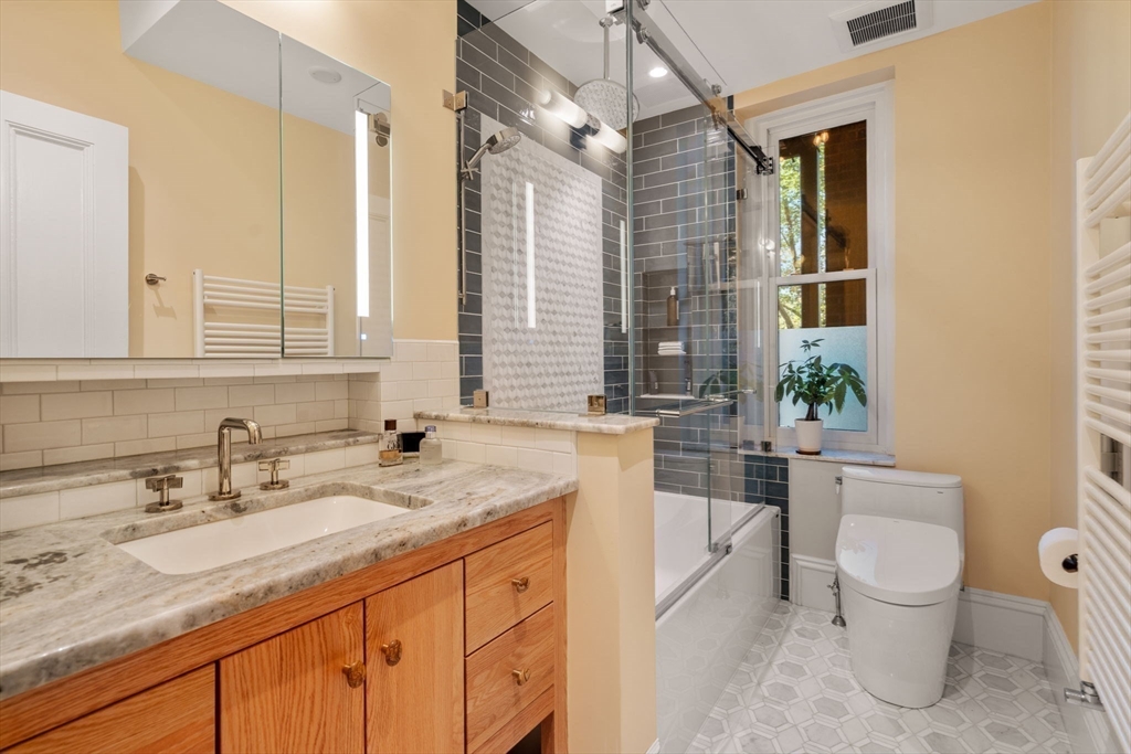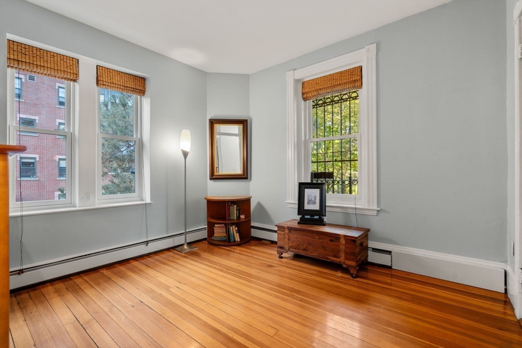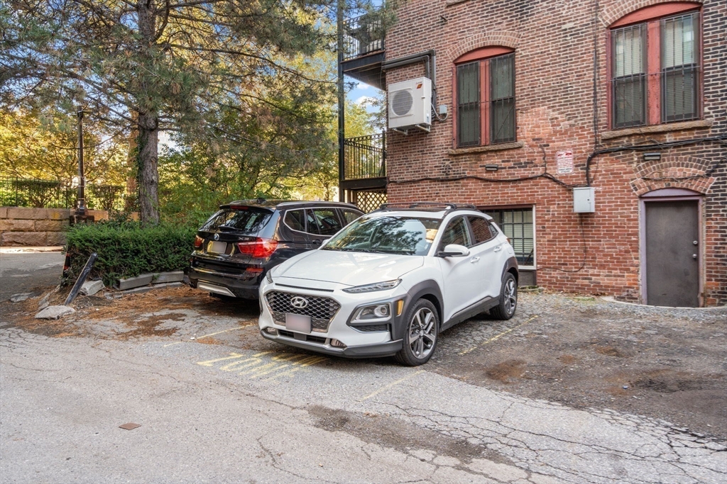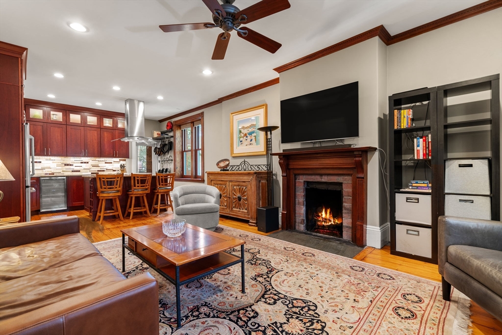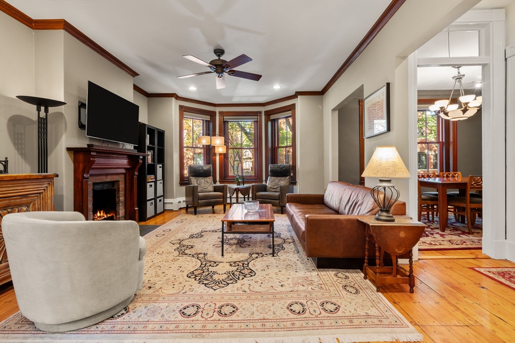 South End. On The Park. Parking included. Wonderful Deck. Spectacular Rare Corner home with 13 windows + 3 exposures providing beautiful natural light. This home overlooks the Rose Garden at the Southwest Corridor Park. From the deck enjoy dining al fresco + morning coffee. Inviting living room, perfect for entertaining, with tall ceilings, wood floors, fireplace + a separate dining area which could also be used as a home office. Sleek Open plan kitchen w/ breakfast bar, stainless steel appliances, including gas cooking, stone countertops/breakfast bar + plenty of cabinetry/work surfaces. Stunning bathroom with custom tile work, tub + modern fixtures. In unit washer/dryer. Great closets including two walk ins. Additional bonus storage in basement including space for a bike. Picturesque leafy street with brick sidewalks & historic street lamps. Live in the exciting South End neighborhood near destination restaurants, shopping, green spaces, Whole Foods, The T and more outside your door.