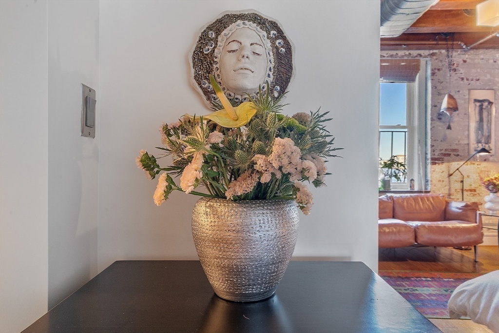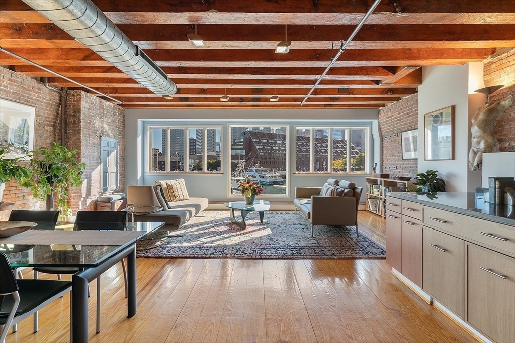 Commercial Wharf: A rare opportunity to own a second floor loft space with stunning harbor views. This creative sanctuary features 10 foot high ceilings, lots of sunlight, wood floors, exposed brick and beams. The view to the south is the Christopher Columbus Park and the iconic Boston city skyline. To the north is the working harbor with tugs, ferries, tankers, beautiful yachts and sailboats. The spacious open floor plan comprises a combined living and dining area, along with a wet bar and office. There is a large kitchen, a sizable bedroom, a stylish half bath and a full bath with laundry. Antique built-in safe, abundant closets and cabinets, plus deeded basement storage. Steps from busy North End cafes, restaurants and shops, Commercial Wharf is surprisingly quiet. On-site parking is available for you and your guests.