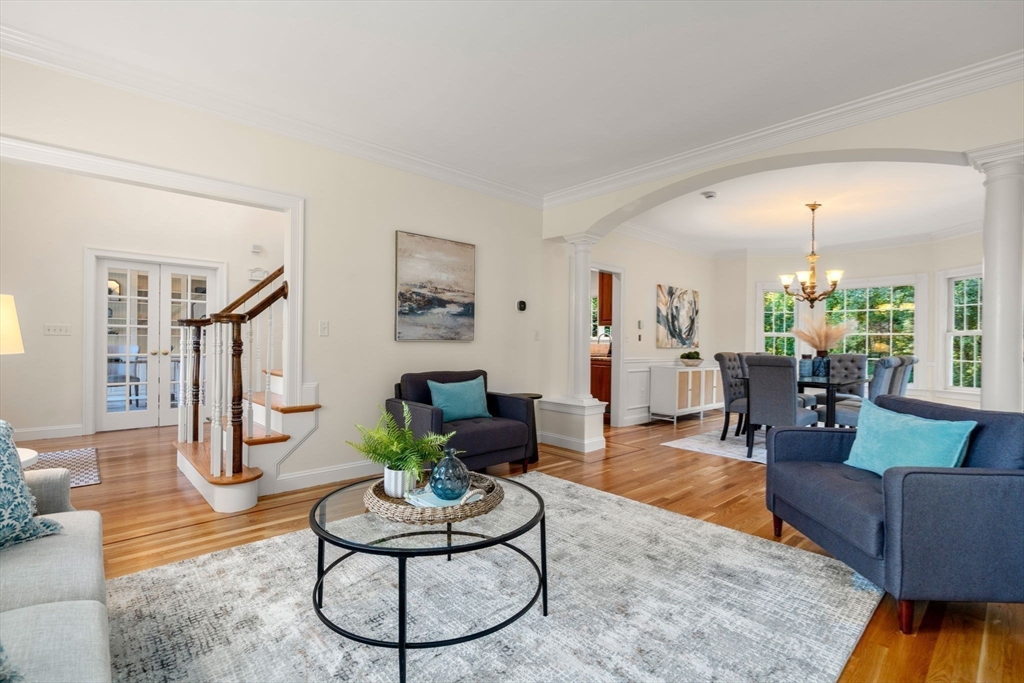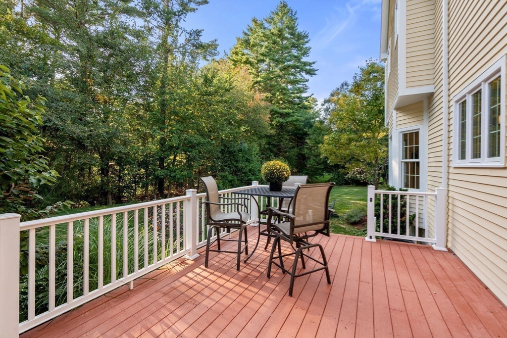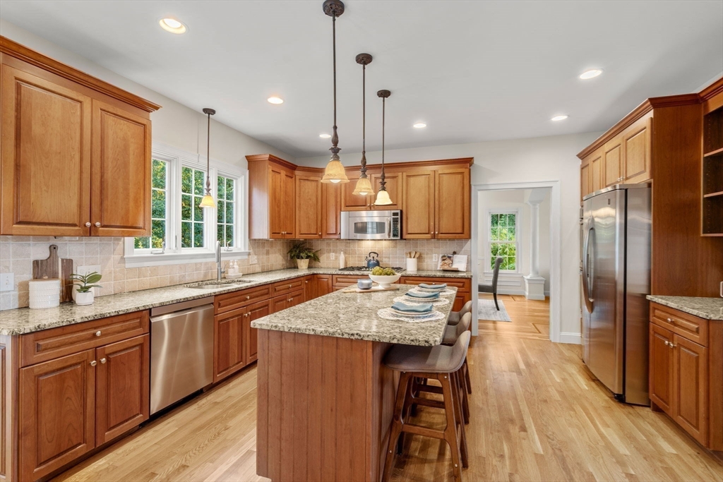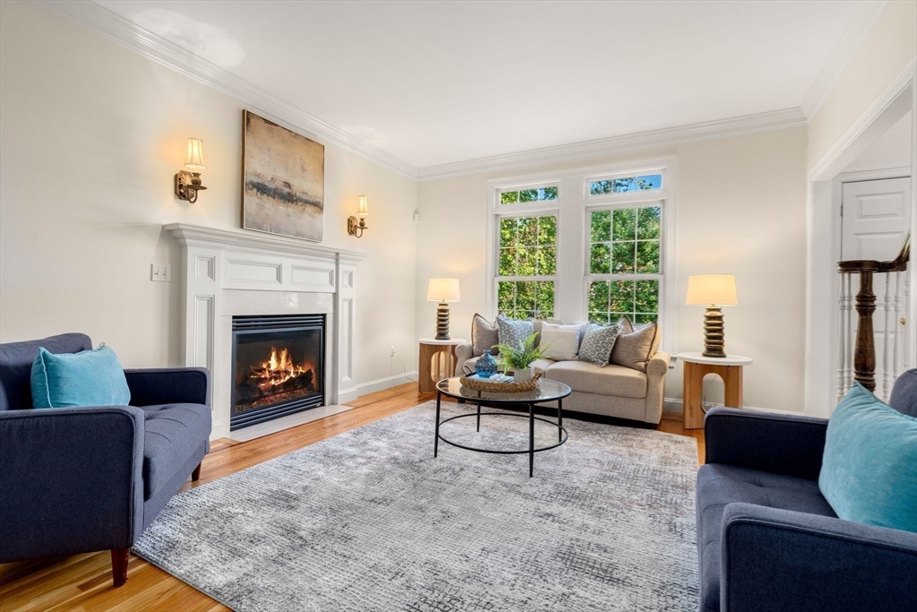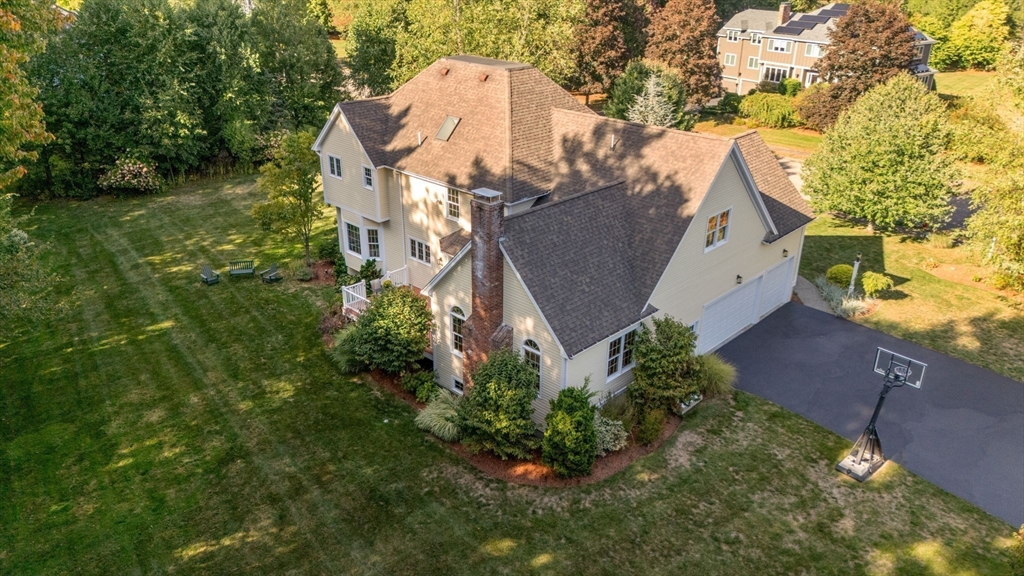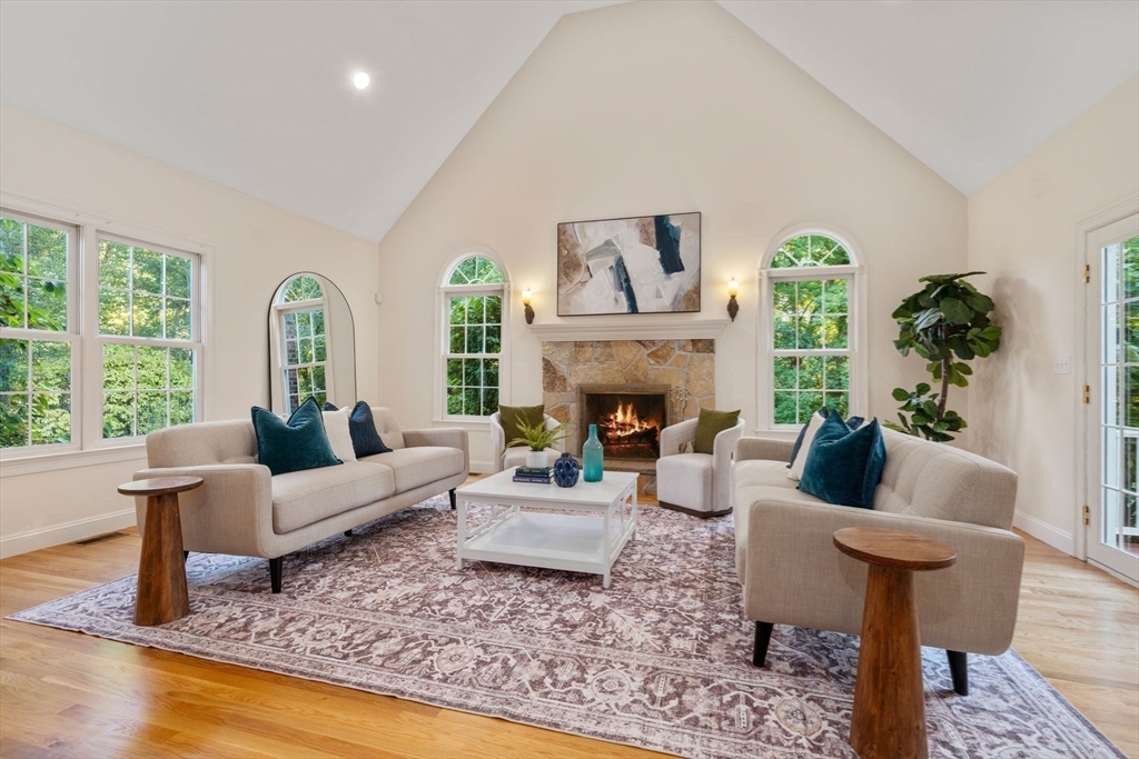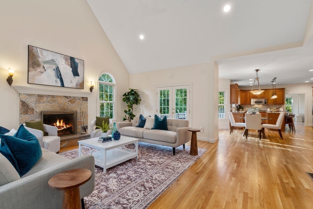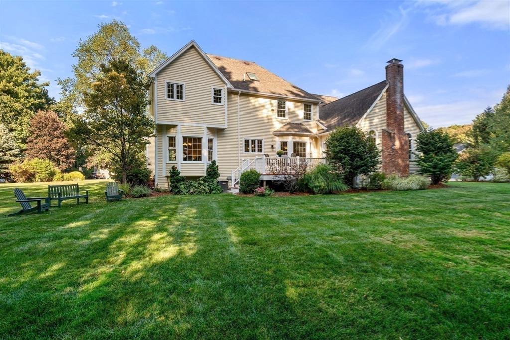 Nestled on an expansive, professionally landscaped corner lot in one of Medfield's most idyllic neighborhoods, this beautifully designed, well-appointed and much-admired home is a rare find! The elegant covered portico welcomes you into a light-filled open plan showcasing smooth 9' ceilings, multiple bay/transom windows, French doors, detailed millwork, front/back staircases, inlaid hardwood floors and two fireplaces. The chef's kitchen boasts custom cabinetry with a large island, gas cooking and breakfast bay, transitioning into a dramatic 2-story family room with stone fireplace, wet bar and access to the deck for alfresco meals, and open concept dining/living room for effortless entertaining. A private office with built-in bookcase, powder room and laundry complete this level. Spacious en suite bedrooms boast new carpeting and generous closet space, including a vaulted primary and luxurious marble bath. With an exceptional setting and location, this stunning home won't last long!