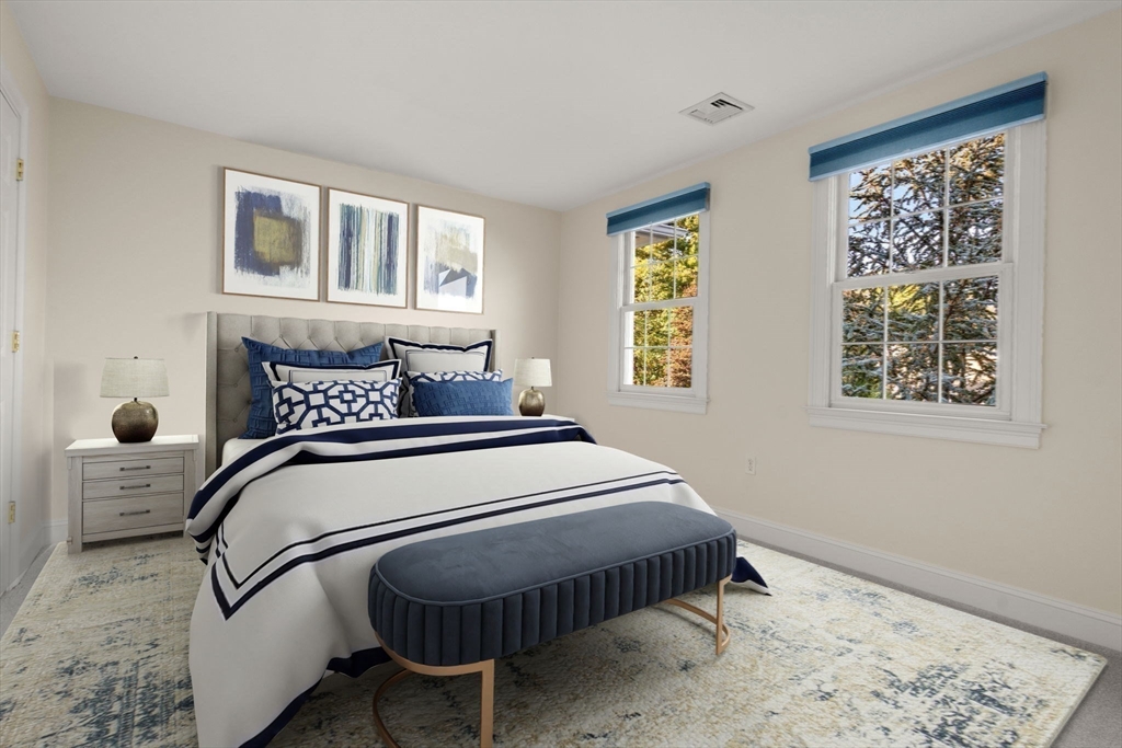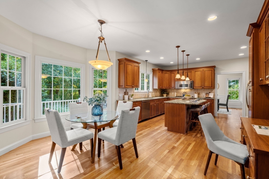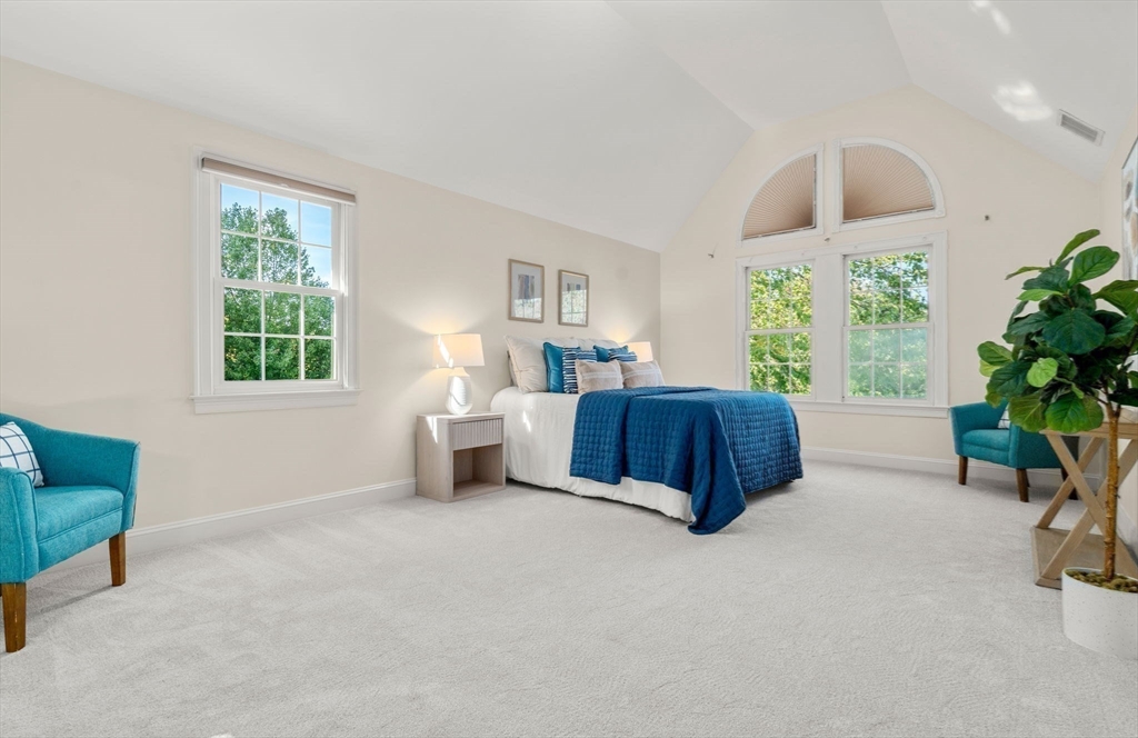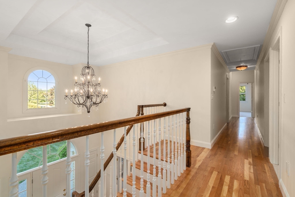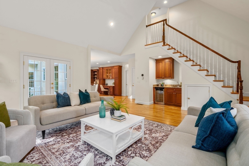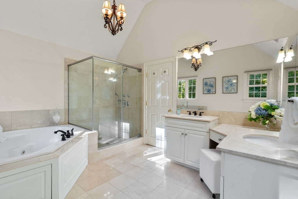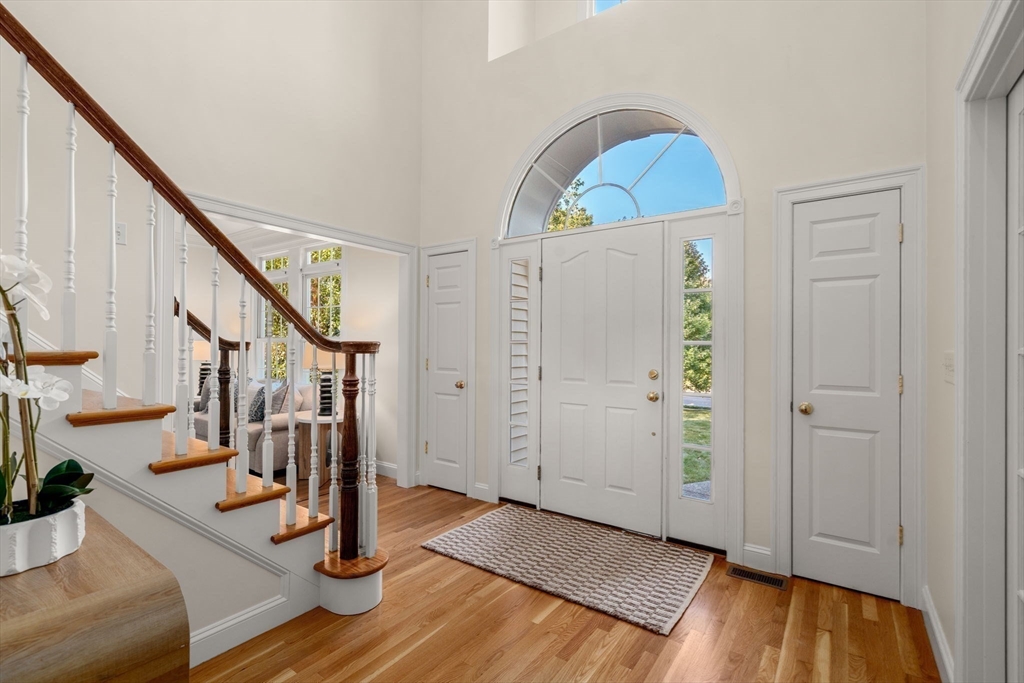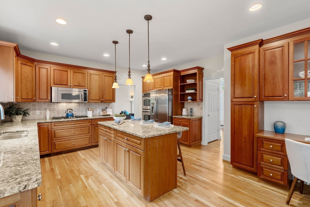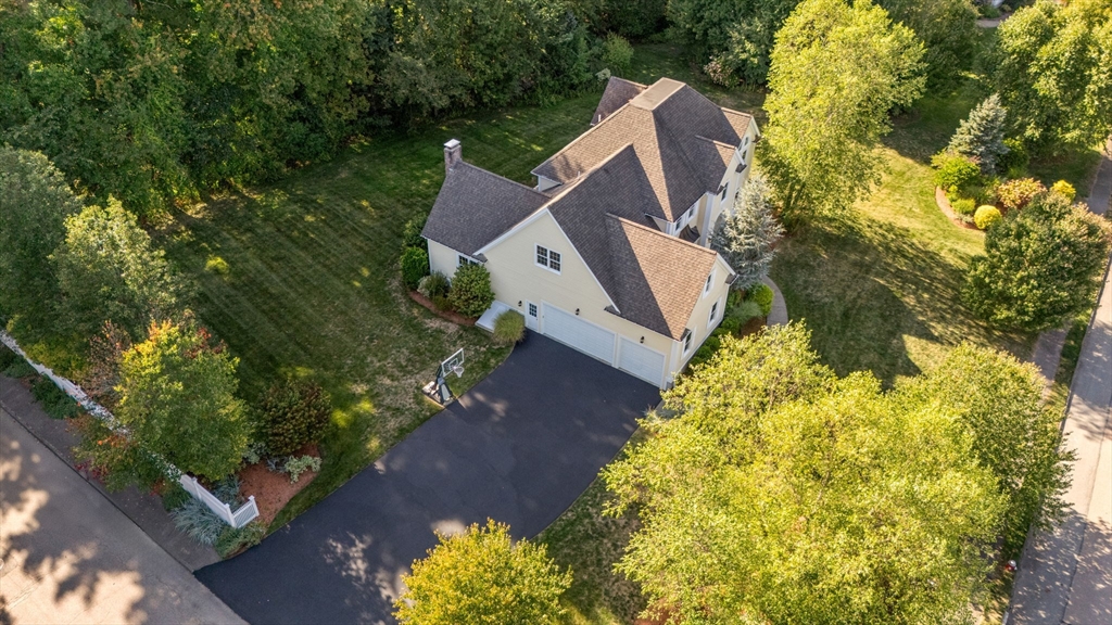 Nestled on an expansive, professionally landscaped corner lot in one of Medfield's most idyllic neighborhoods, this beautifully designed, well-appointed and much-admired home is a rare find! The elegant covered portico welcomes you into a light-filled open plan showcasing smooth 9' ceilings, multiple bay/transom windows, French doors, detailed millwork, front/back staircases, inlaid hardwood floors and two fireplaces. The chef's kitchen boasts custom cabinetry with a large island, gas cooking and breakfast bay, transitioning into a dramatic 2-story family room with stone fireplace, wet bar and access to the deck for alfresco meals, and open concept dining/living room for effortless entertaining. A private office with built-in bookcase, powder room and laundry complete this level. Spacious en suite bedrooms boast new carpeting and generous closet space, including a vaulted primary and luxurious marble bath. With an exceptional setting and location, this stunning home won't last long!