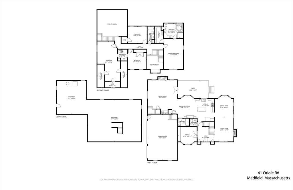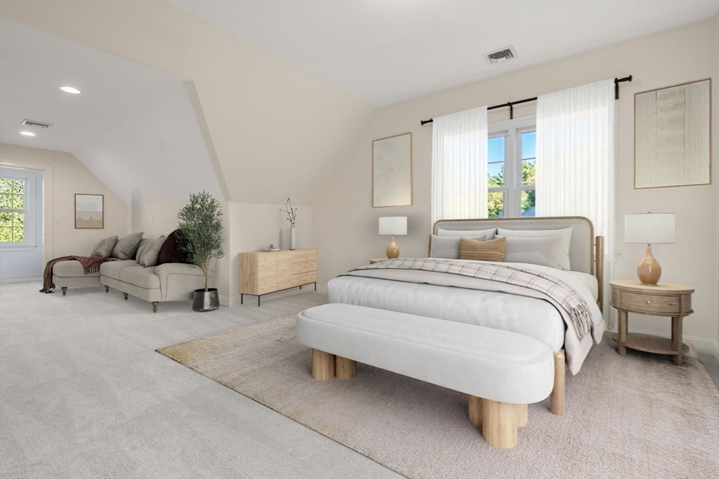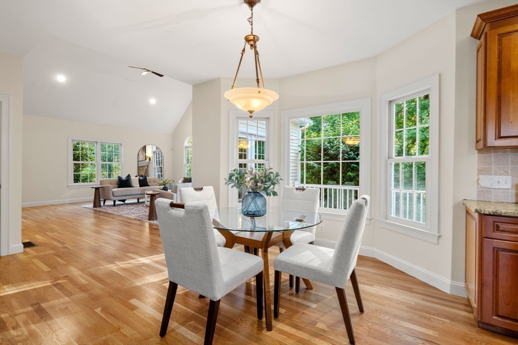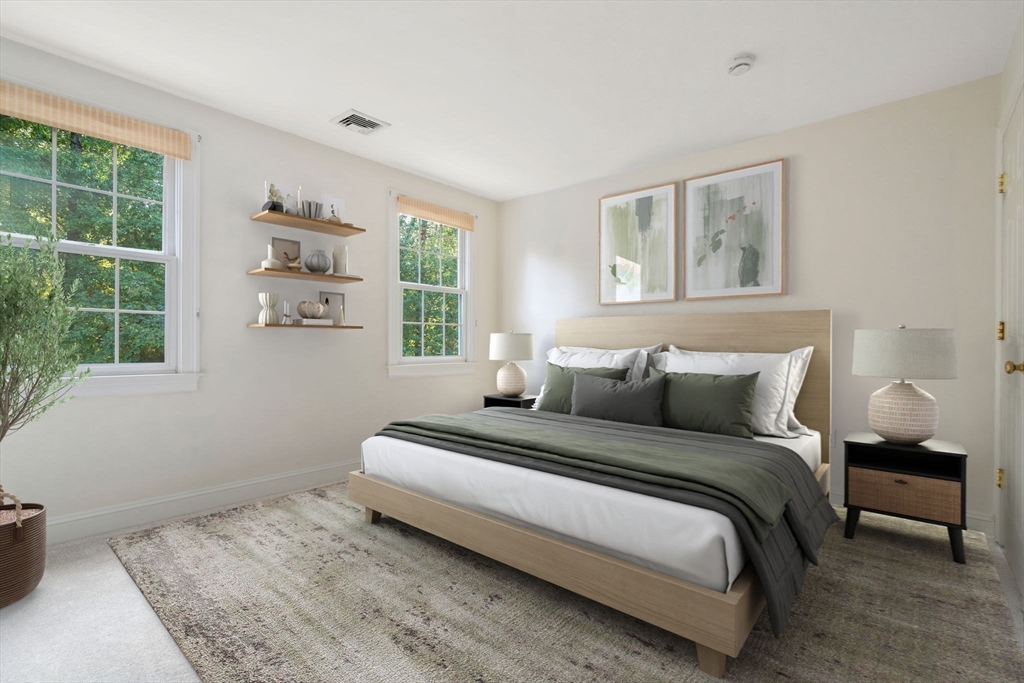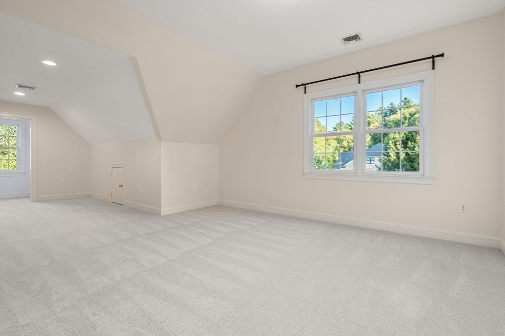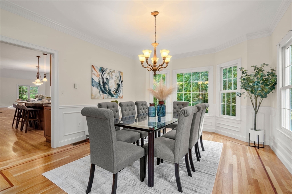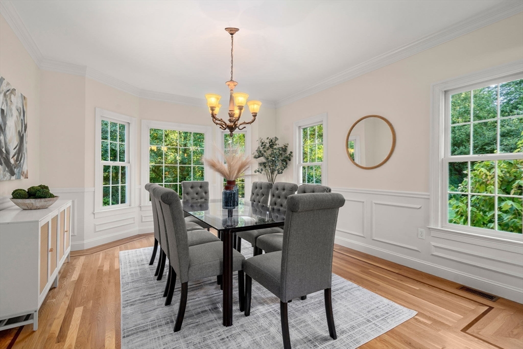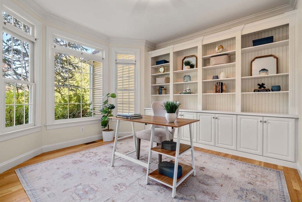 Nestled on an expansive, professionally landscaped corner lot in one of Medfield's most idyllic neighborhoods, this beautifully designed, well-appointed and much-admired home is a rare find! The elegant covered portico welcomes you into a light-filled open plan showcasing smooth 9' ceilings, multiple bay/transom windows, French doors, detailed millwork, front/back staircases, inlaid hardwood floors and two fireplaces. The chef's kitchen boasts custom cabinetry with a large island, gas cooking and breakfast bay, transitioning into a dramatic 2-story family room with stone fireplace, wet bar and access to the deck for alfresco meals, and open concept dining/living room for effortless entertaining. A private office with built-in bookcase, powder room and laundry complete this level. Spacious en suite bedrooms boast new carpeting and generous closet space, including a vaulted primary and luxurious marble bath. With an exceptional setting and location, this stunning home won't last long!